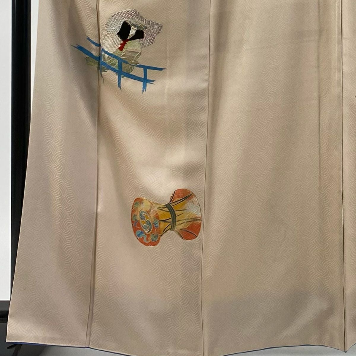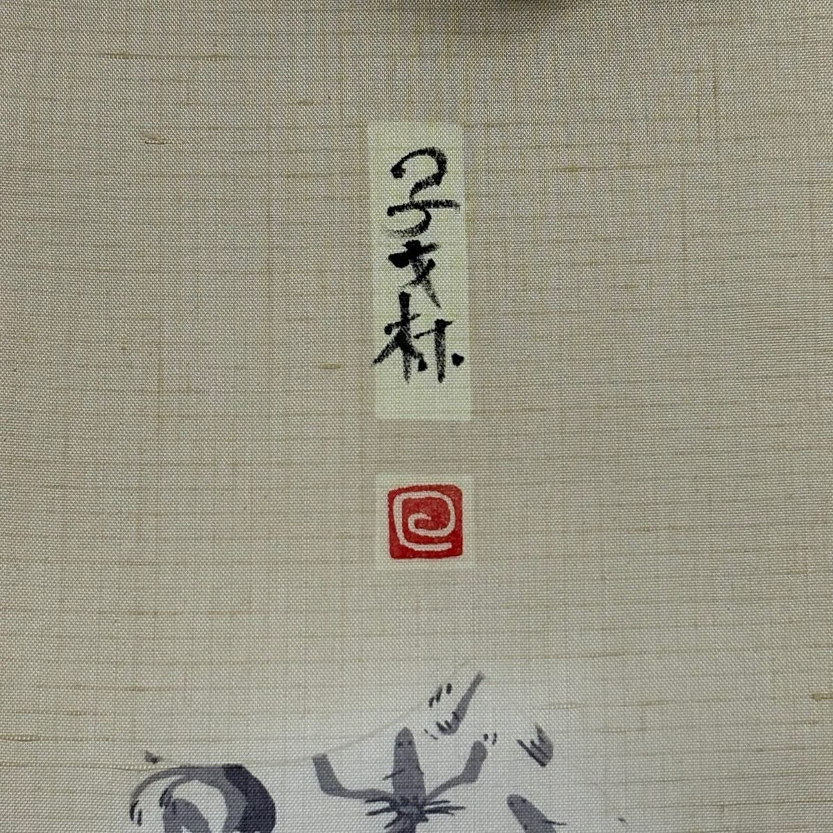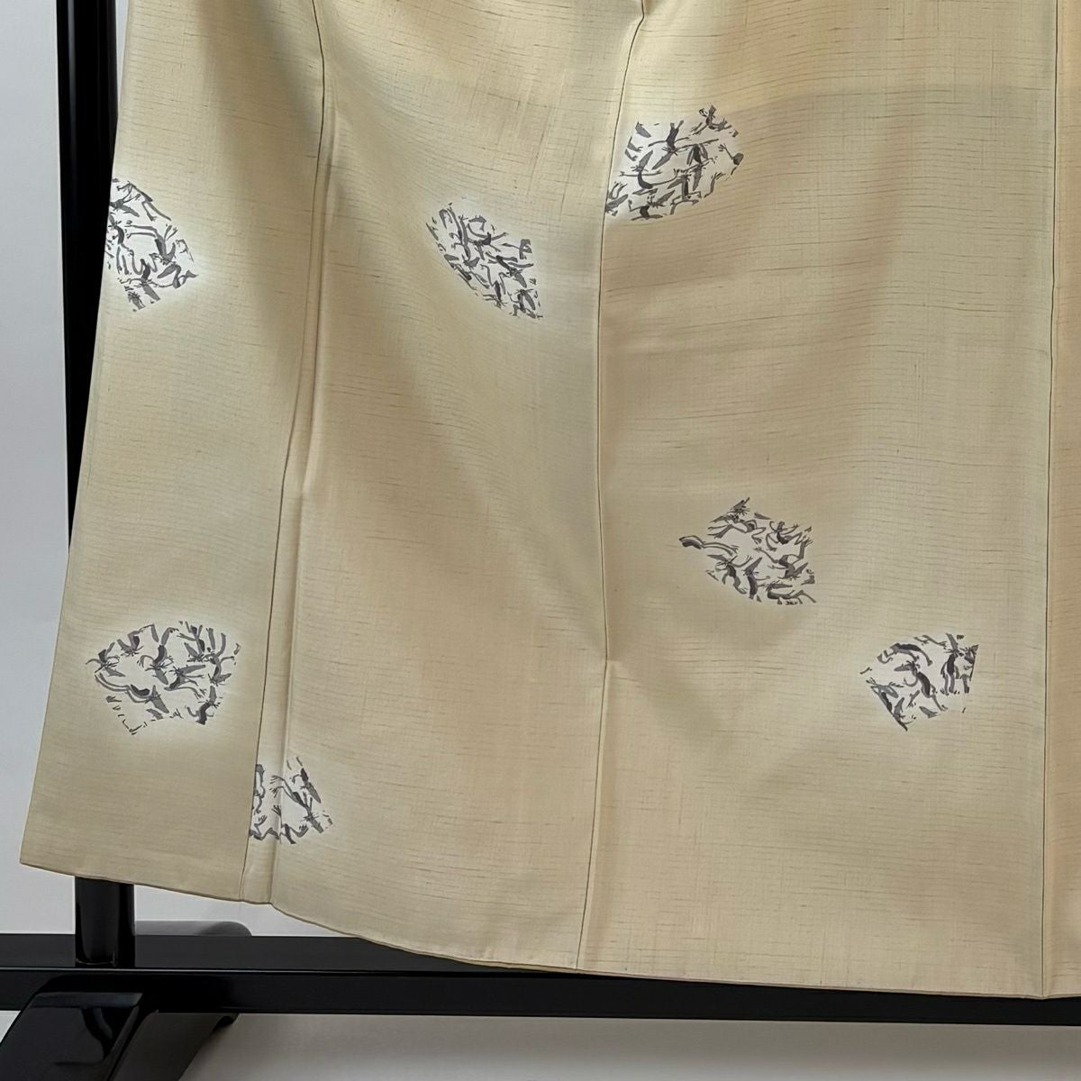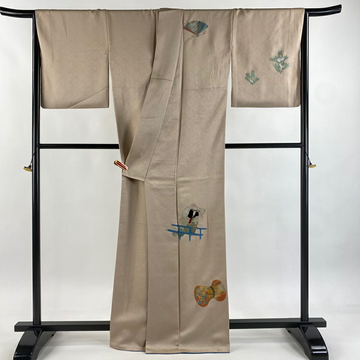 【美品】 小紋 身丈158cm 裄丈65cm M 袷 馬骨子才林 紬地 落款あり 扇面 河童 ぼかし ベージュ 正絹 逸品