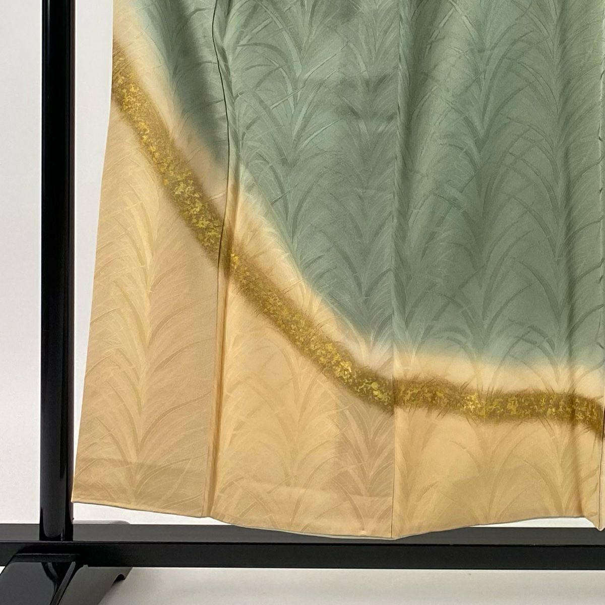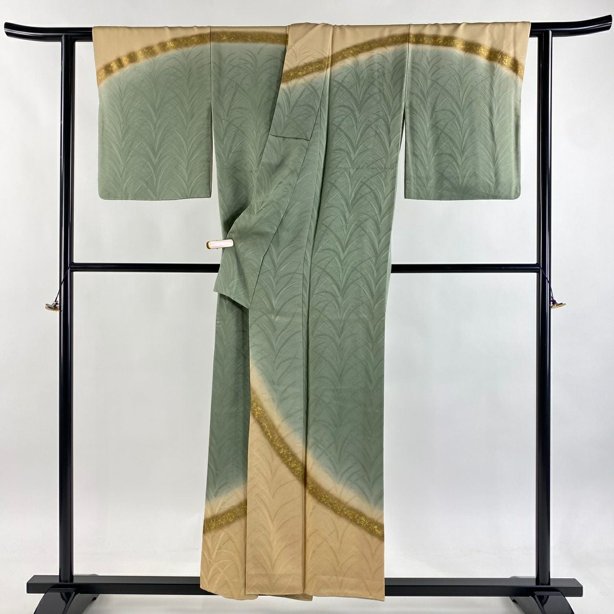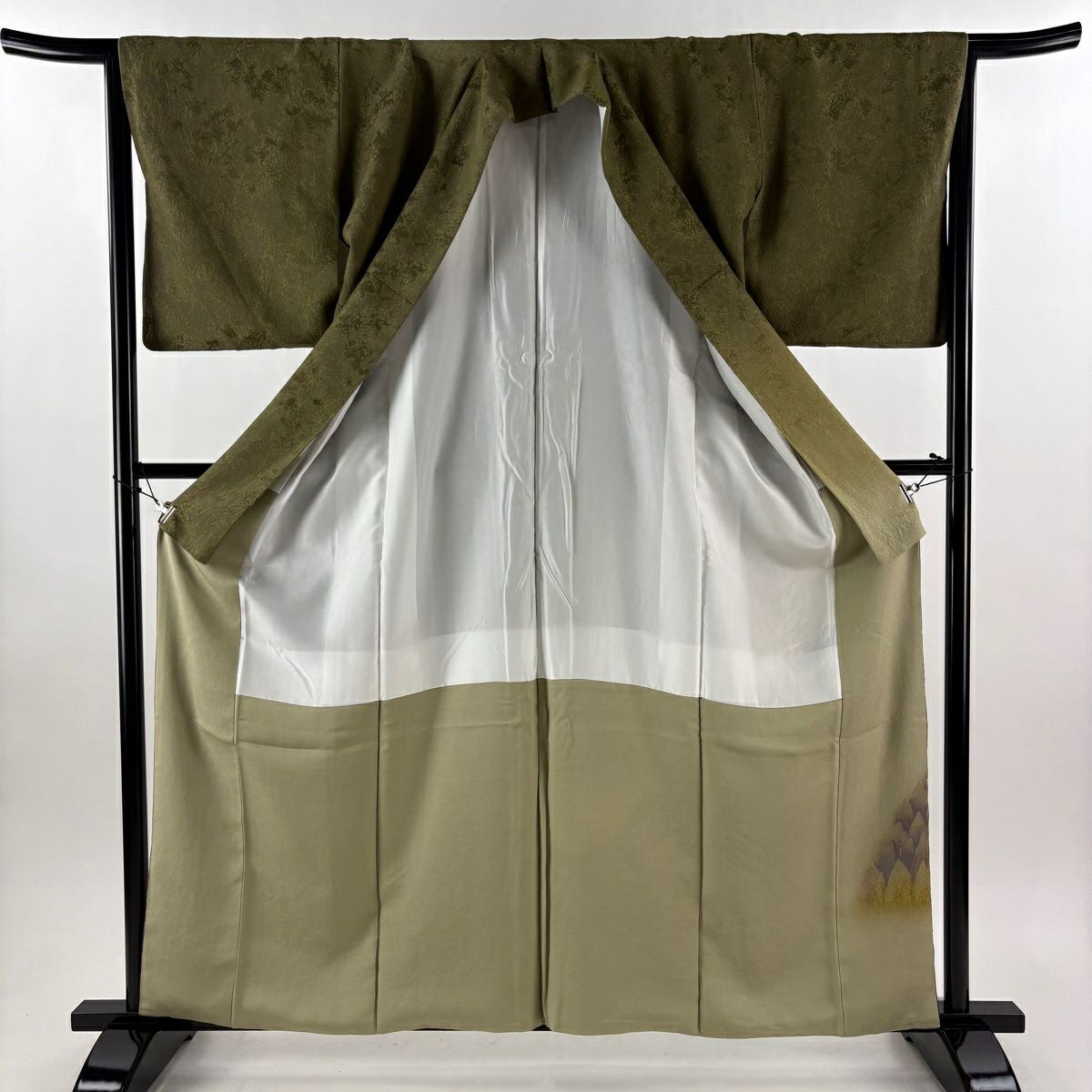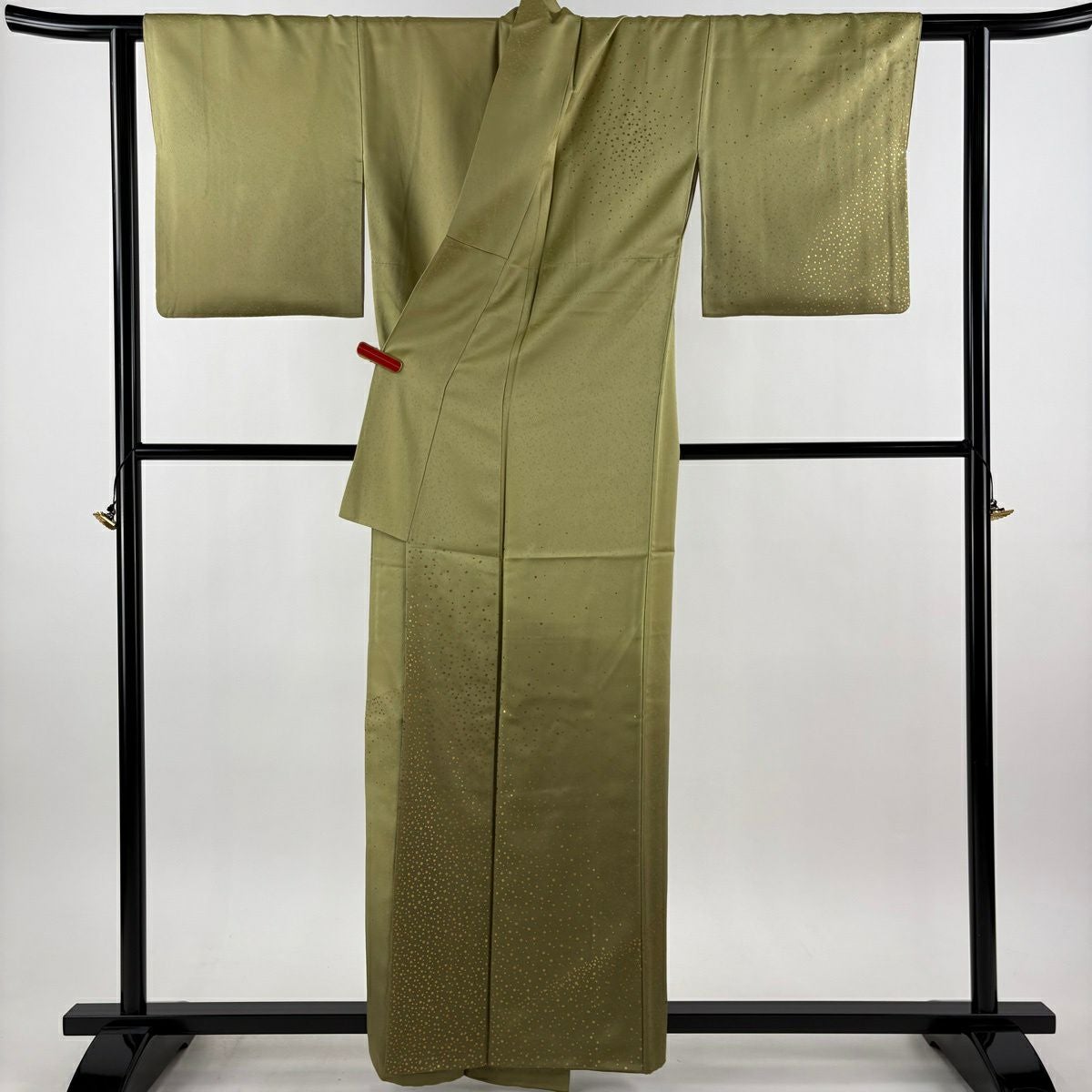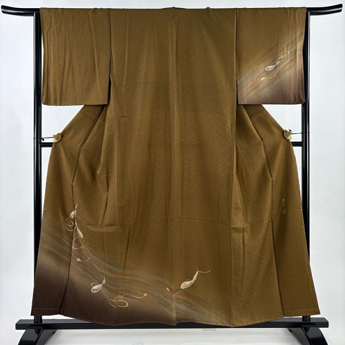 付下げ 身丈160cm 裄丈63cm S 袷 人間国宝 福田喜重 落款あり 箔散らし 金彩 ぼかし 抹茶色 正絹 逸品 一つ紋