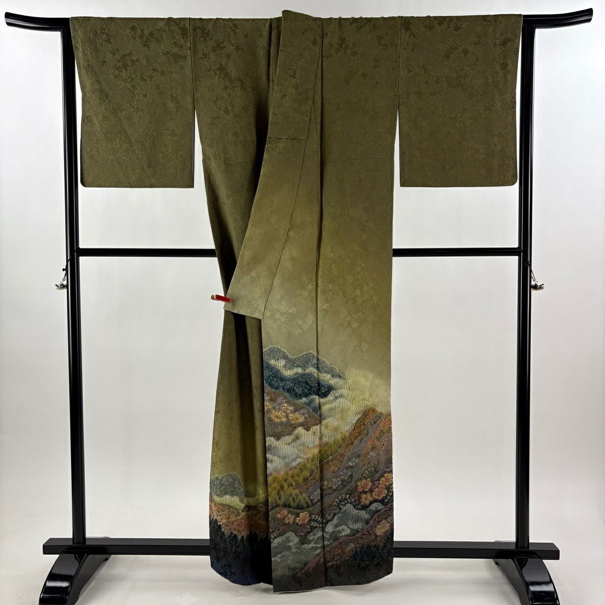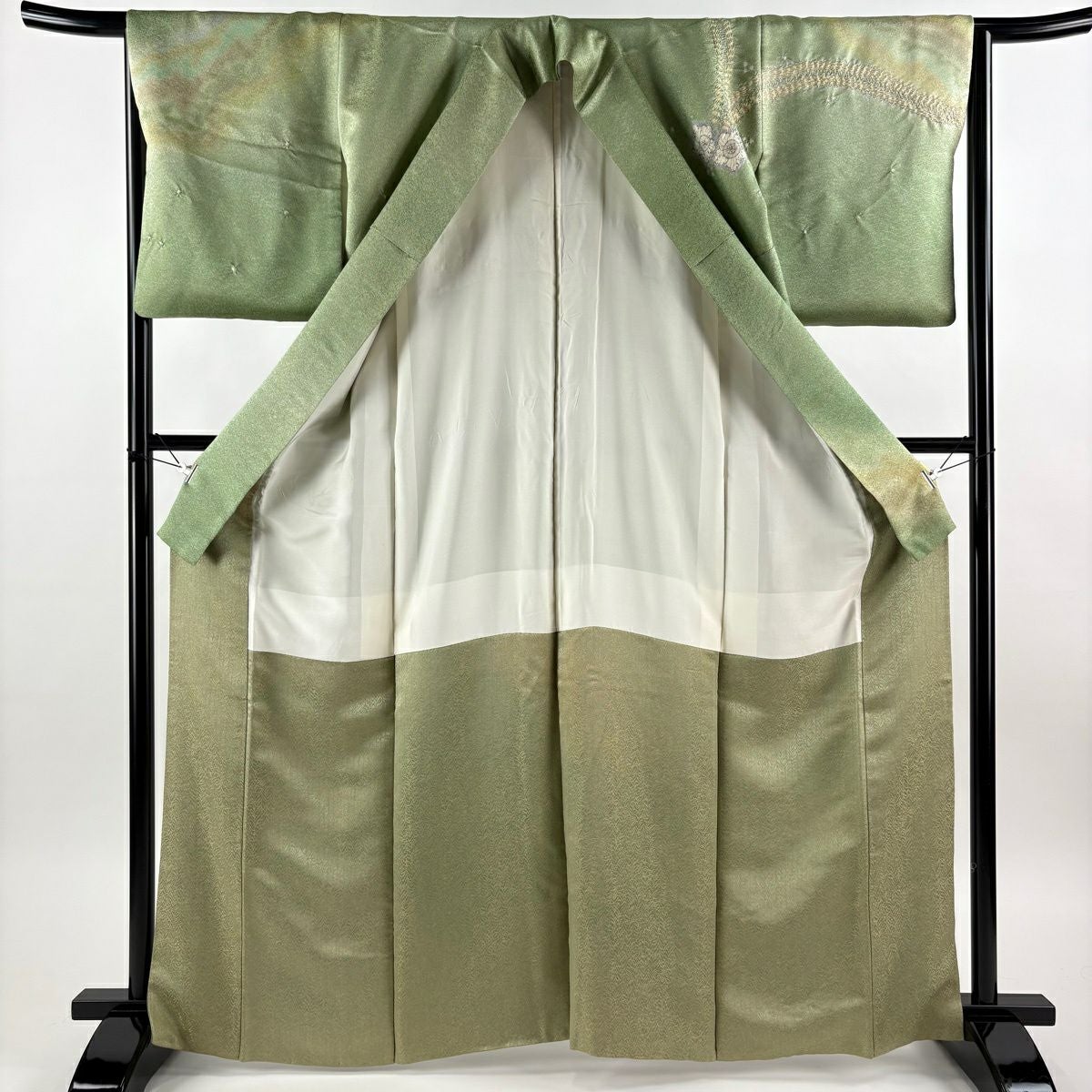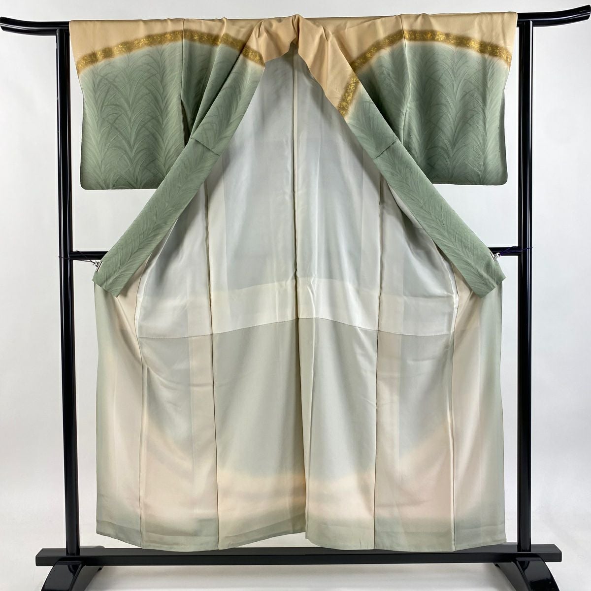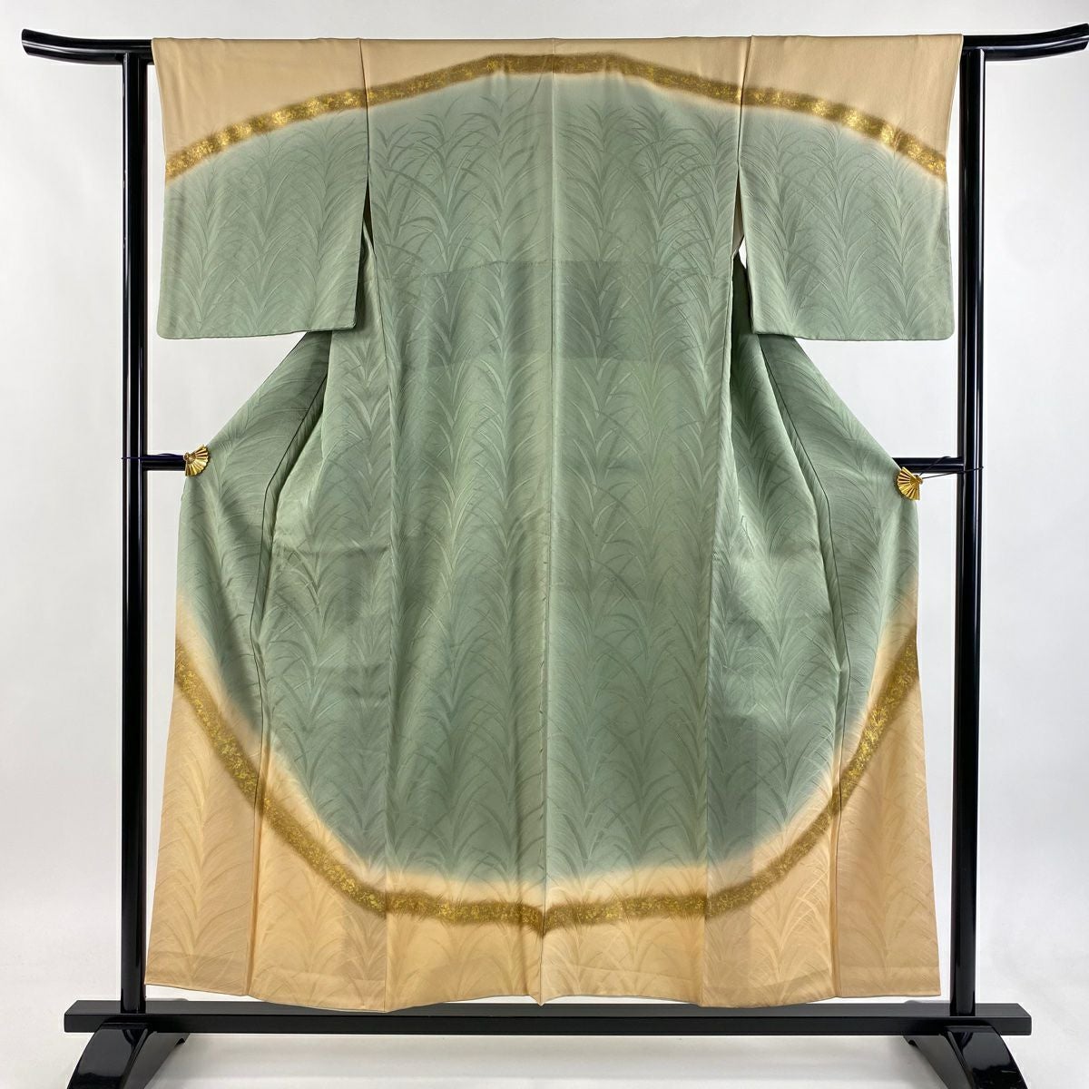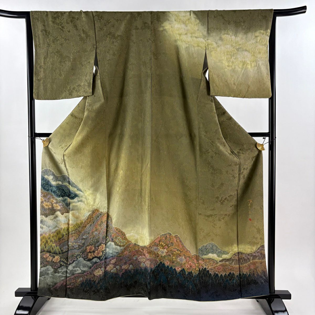 付下げ 身丈160cm 裄丈63cm S 袷 人間国宝 福田喜重 落款あり 箔散らし 金彩 ぼかし 抹茶色 正絹 逸品 一つ紋