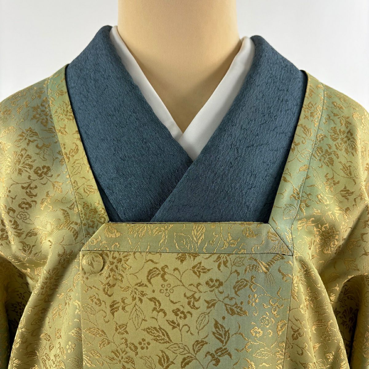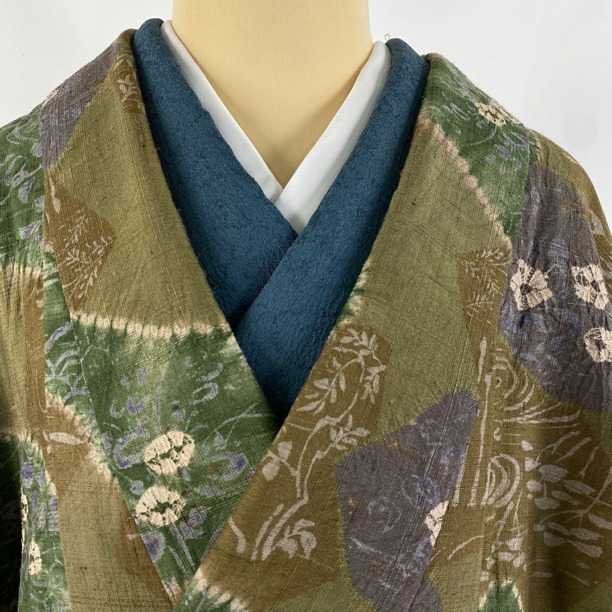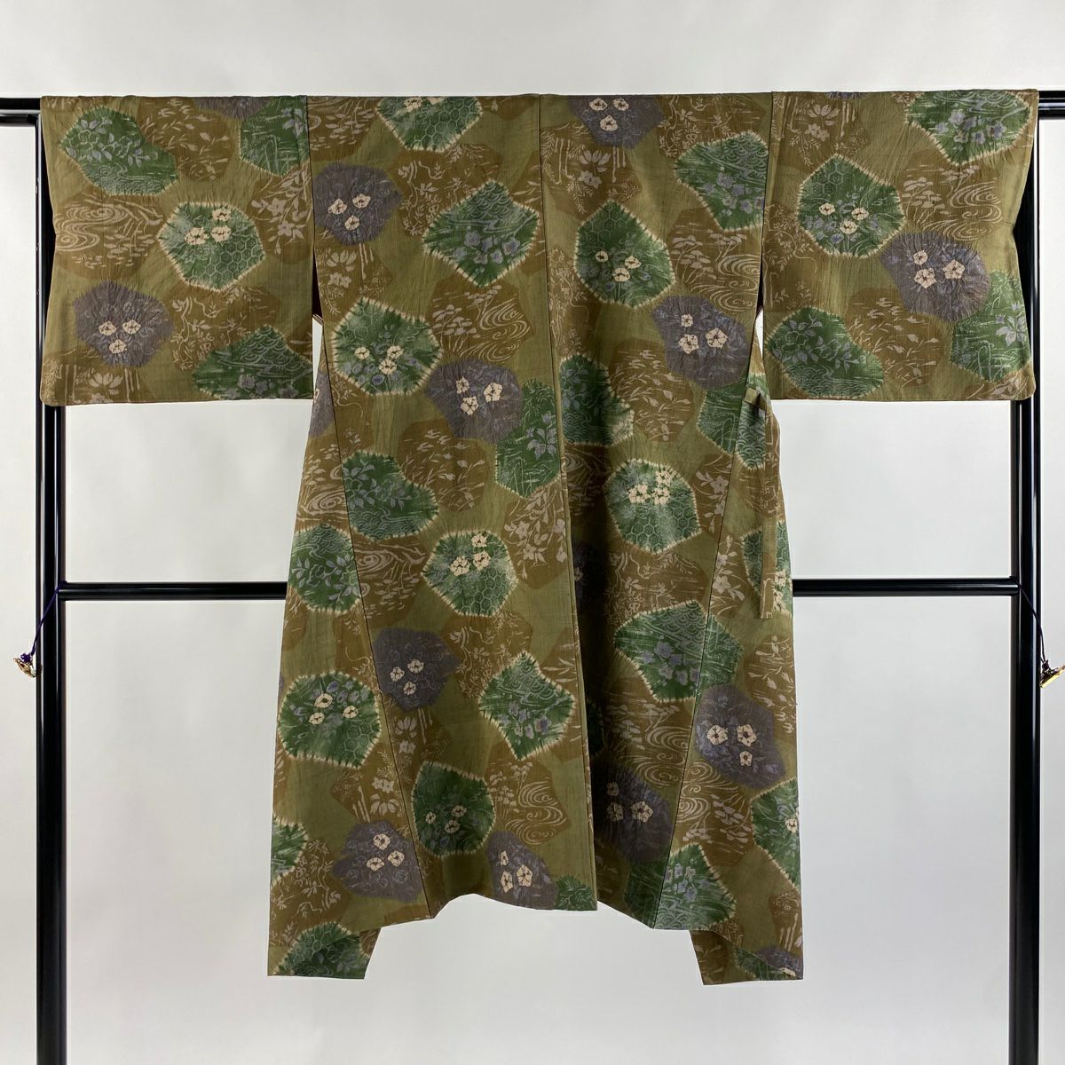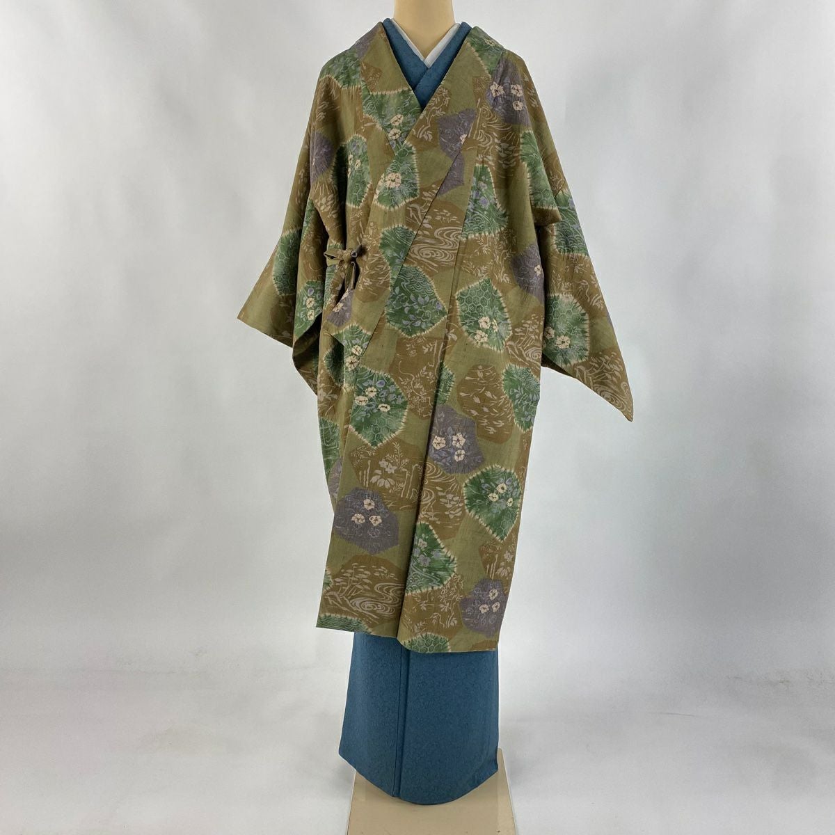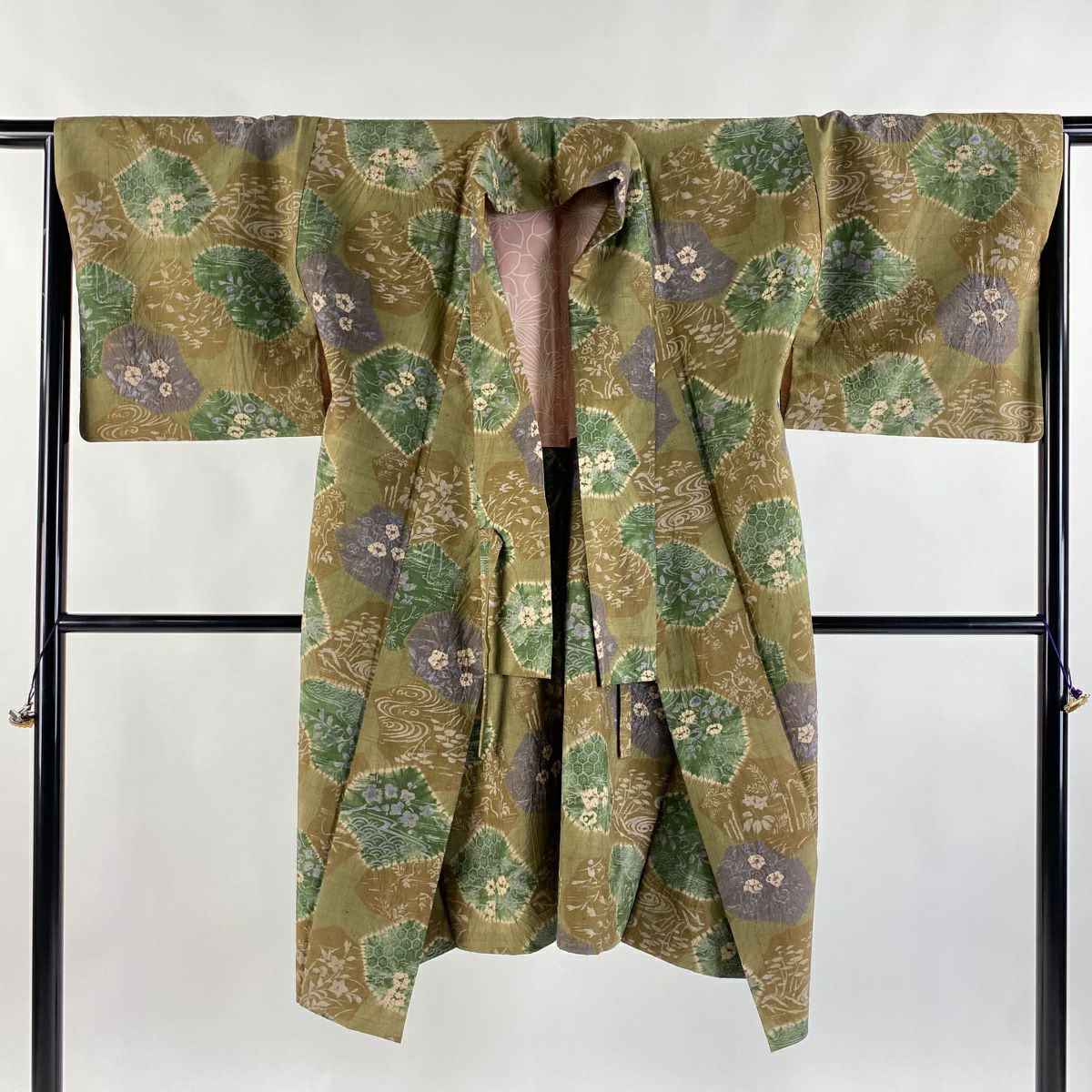 【在庫一掃】 道中着 身丈111cm 裄丈66cm M 和装コート 着物衿 紬地 秋草 流水 絞り 金彩 茶緑色 正絹 逸品