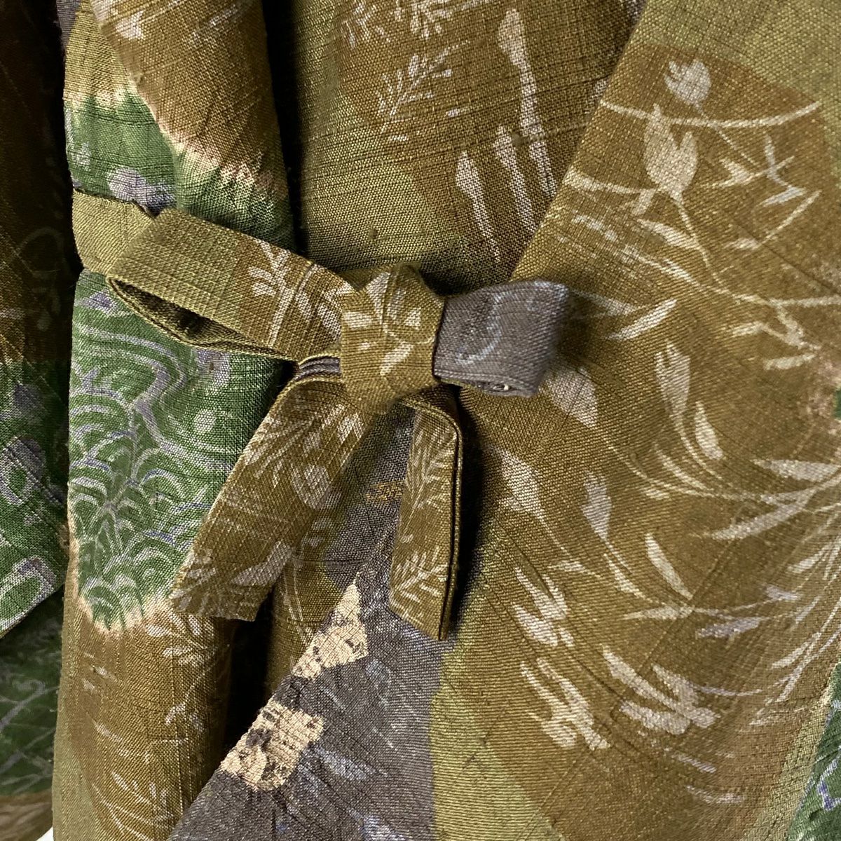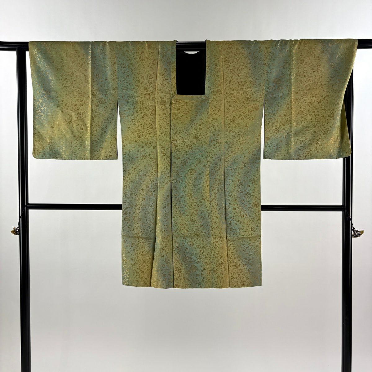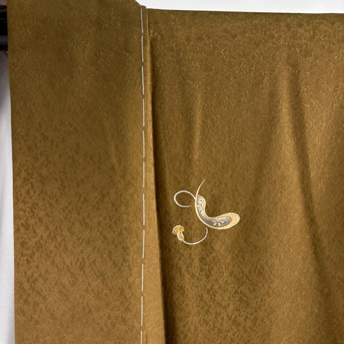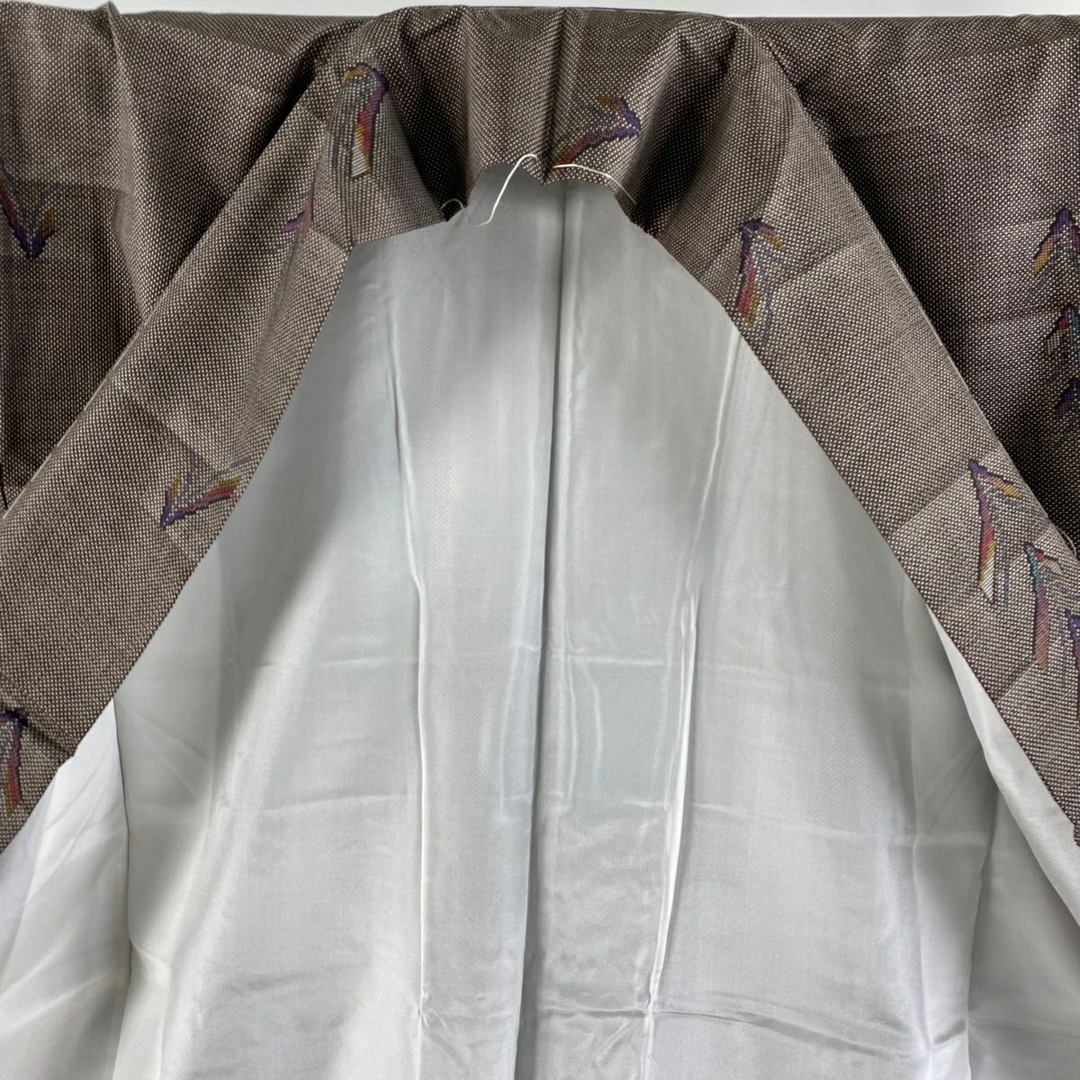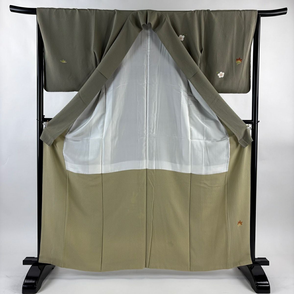 【在庫一掃】 道中着 身丈111cm 裄丈66cm M 和装コート 着物衿 紬地 秋草 流水 絞り 金彩 茶緑色 正絹 逸品