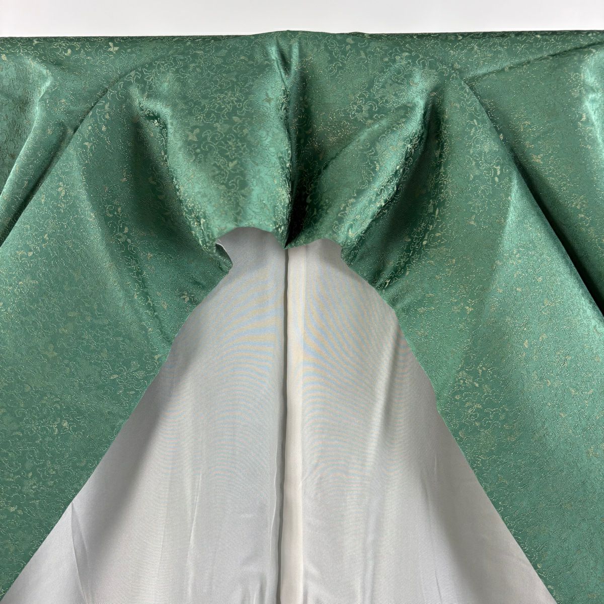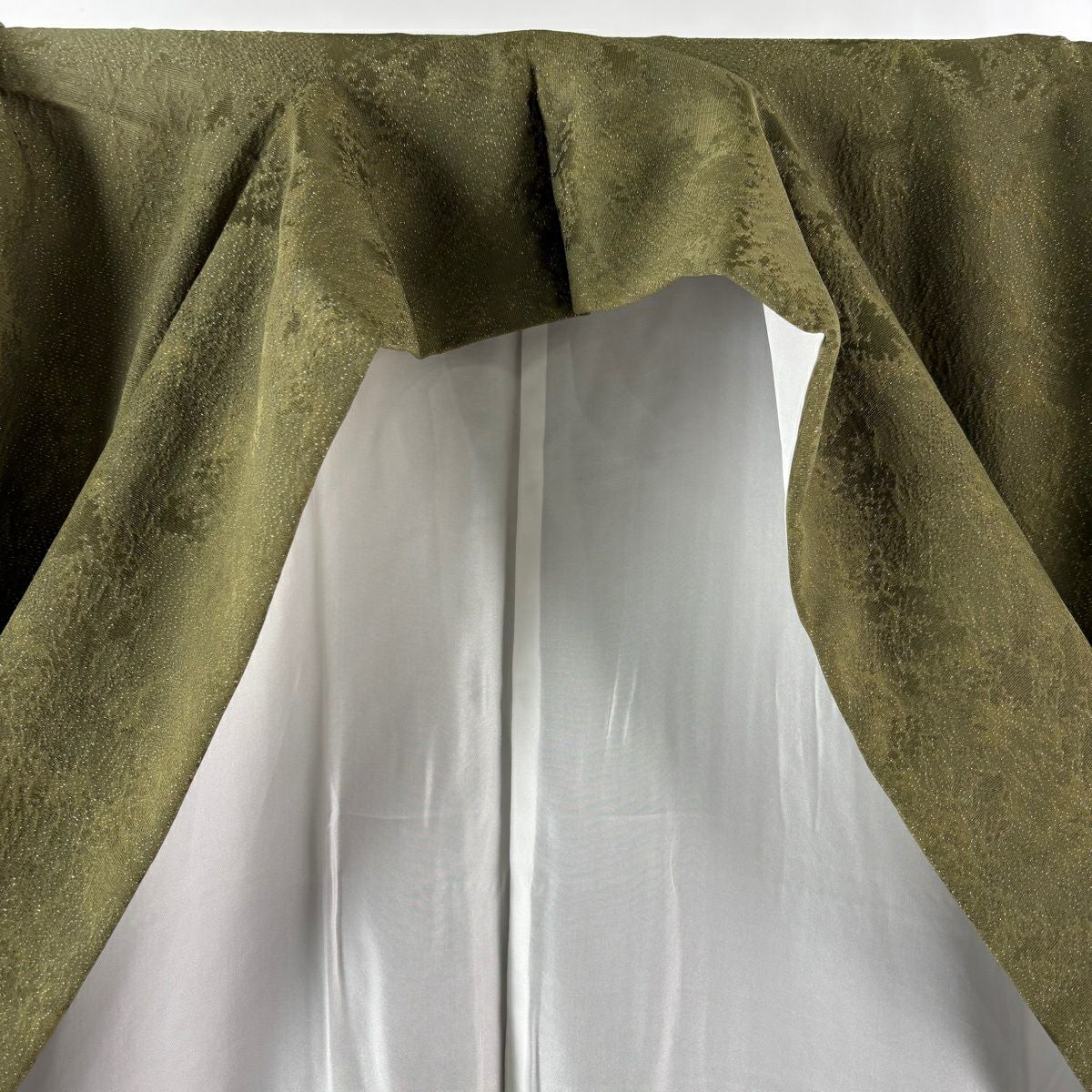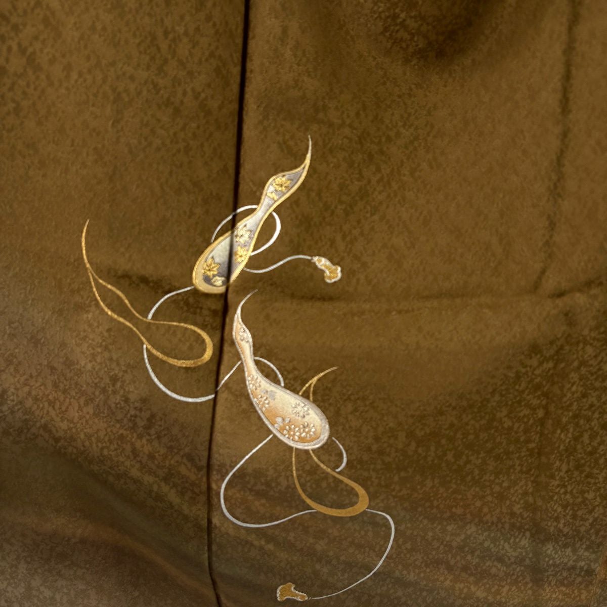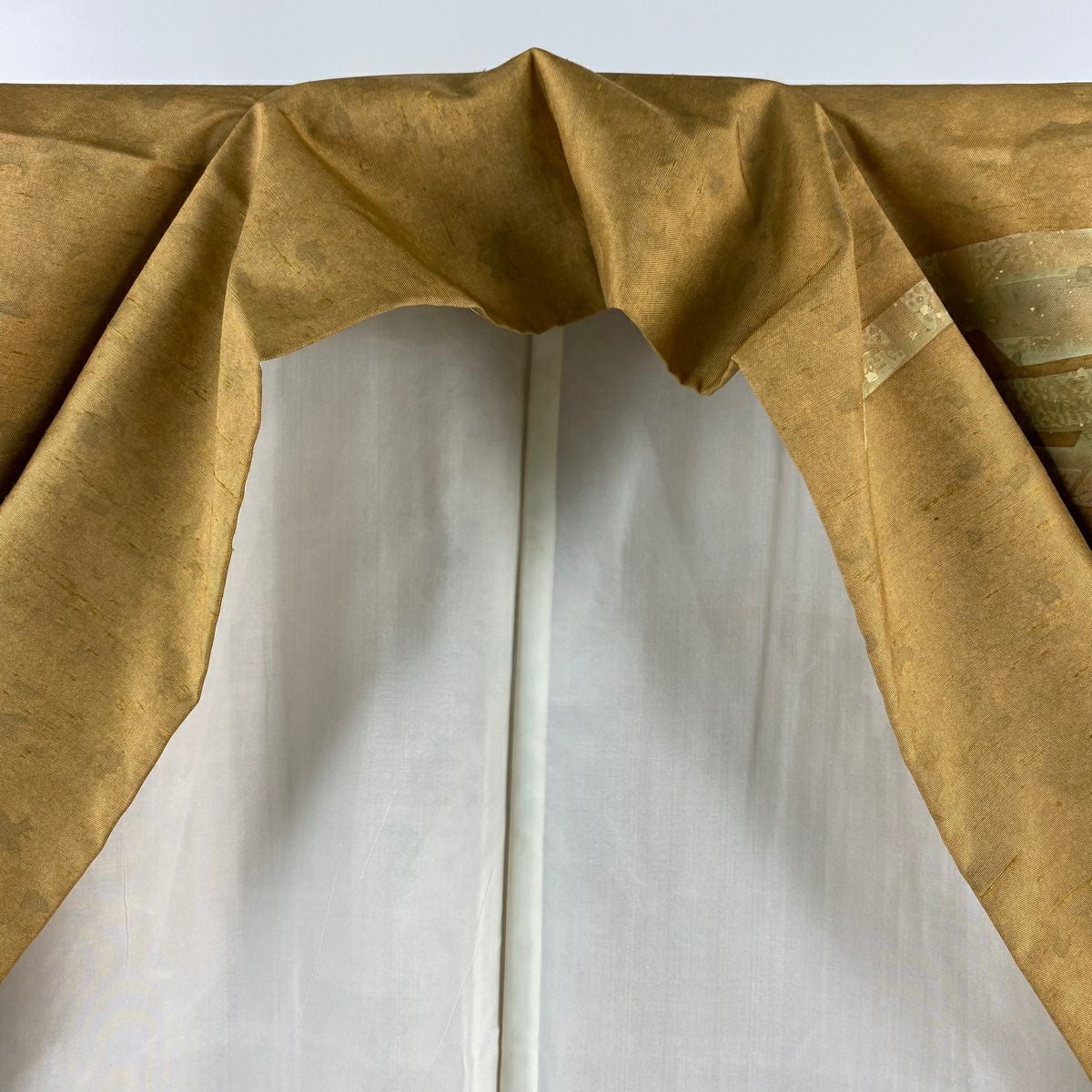 【在庫一掃】 道中着 身丈111cm 裄丈66cm M 和装コート 着物衿 紬地 秋草 流水 絞り 金彩 茶緑色 正絹 逸品