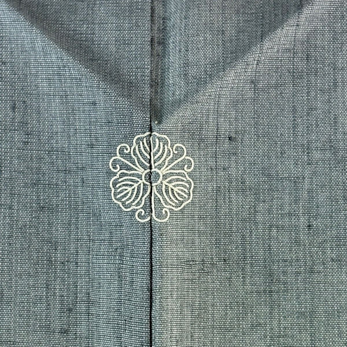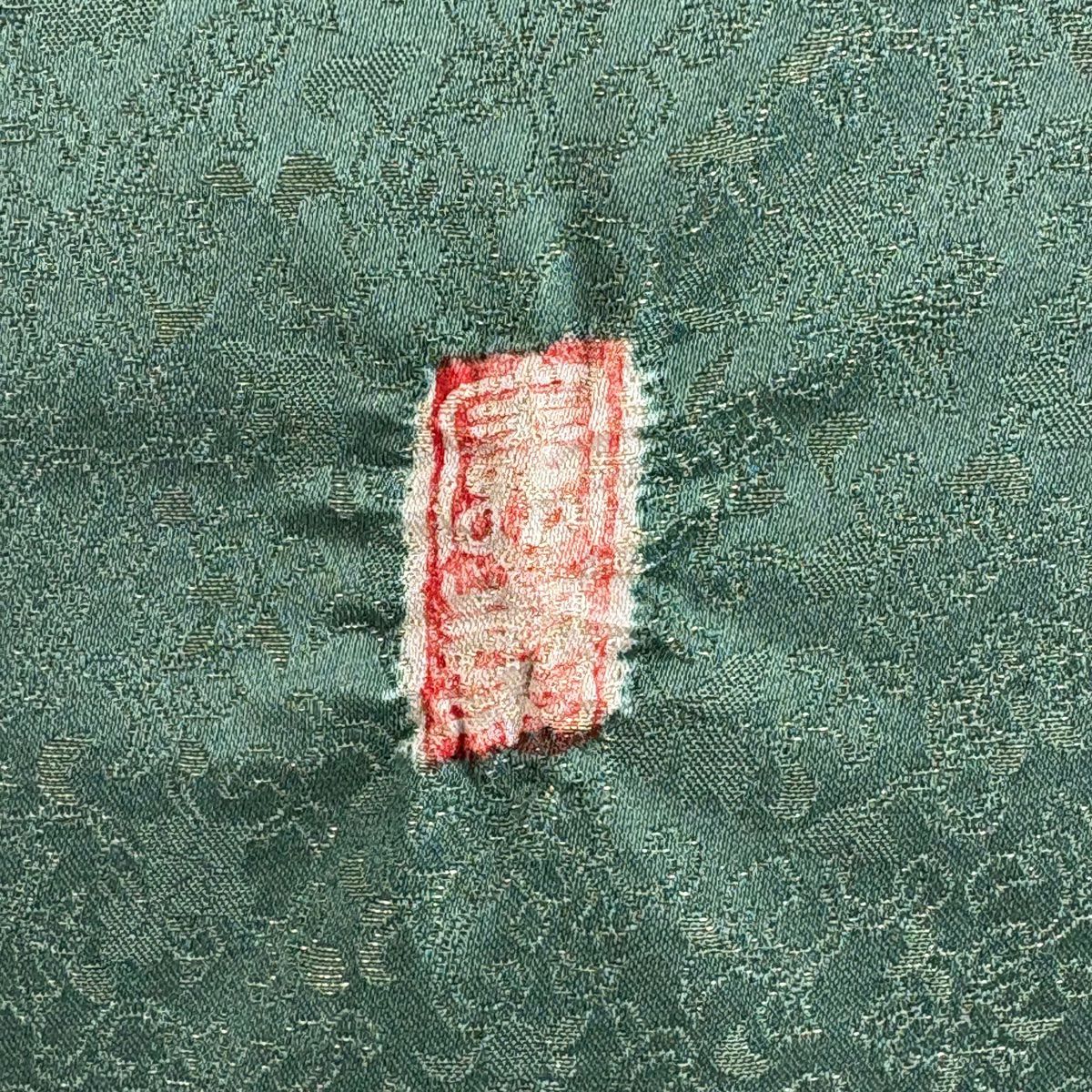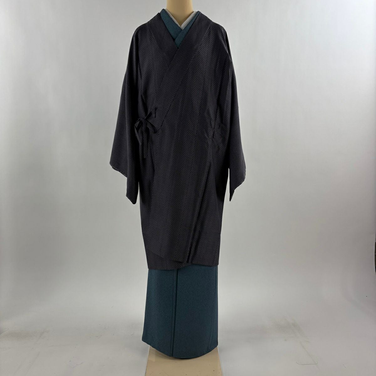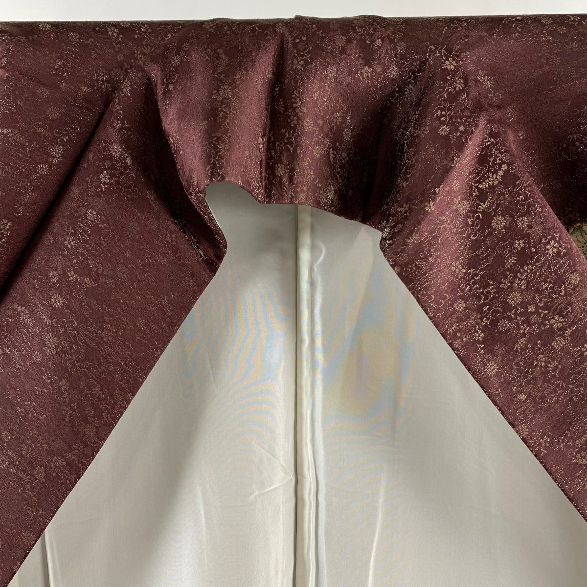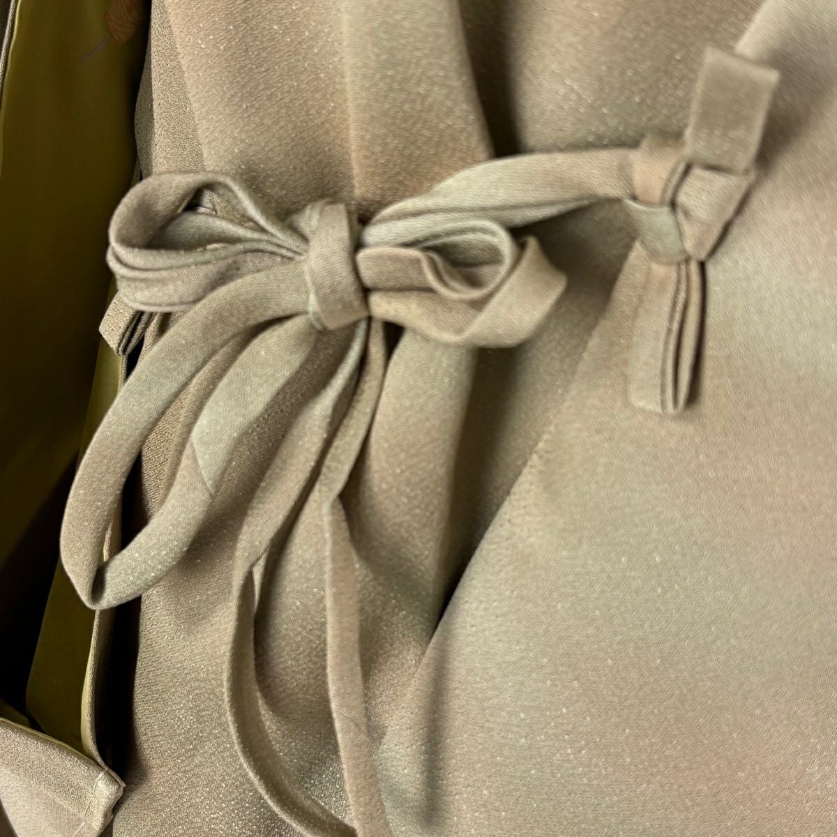 【在庫一掃】 道中着 身丈111cm 裄丈66cm M 和装コート 着物衿 紬地 秋草 流水 絞り 金彩 茶緑色 正絹 逸品