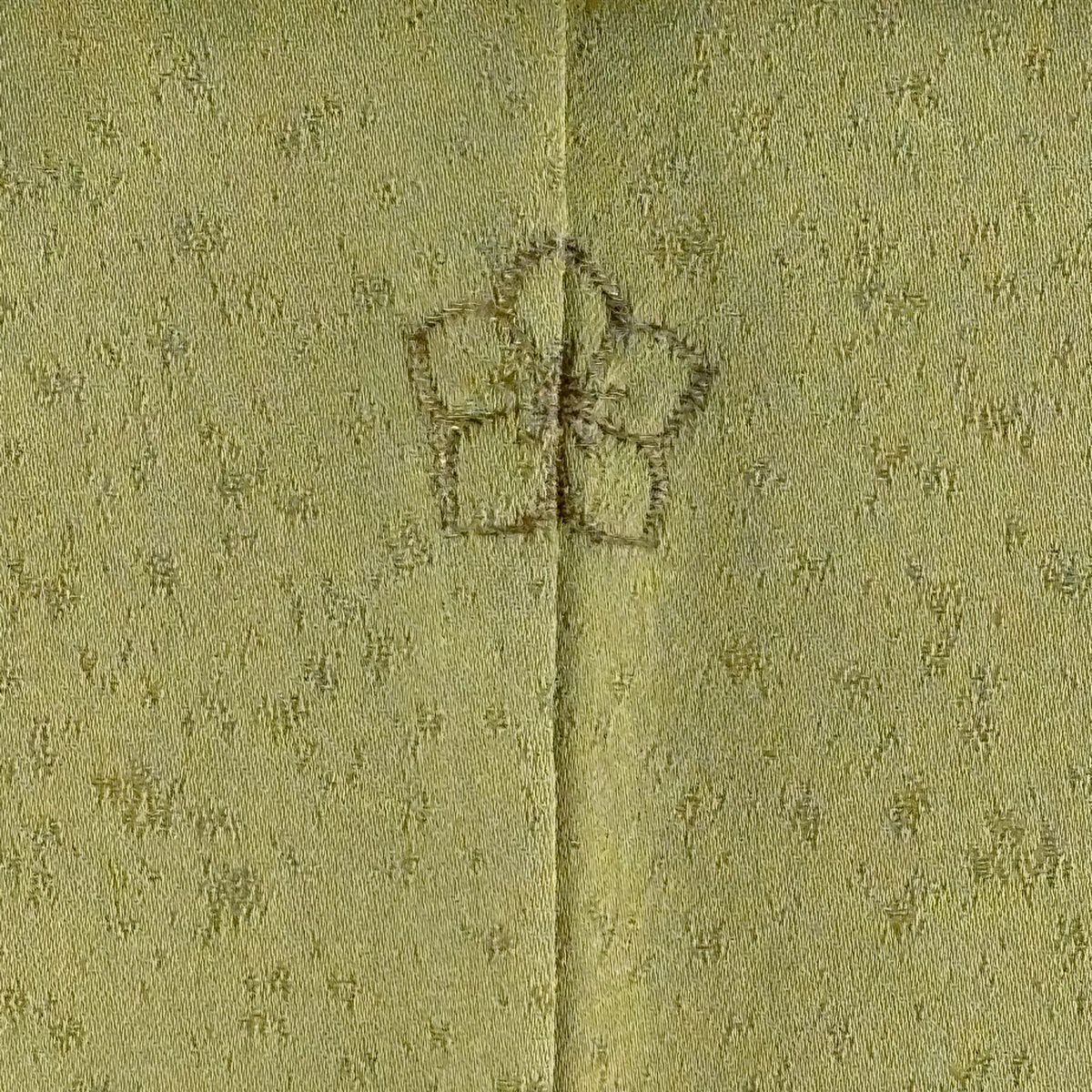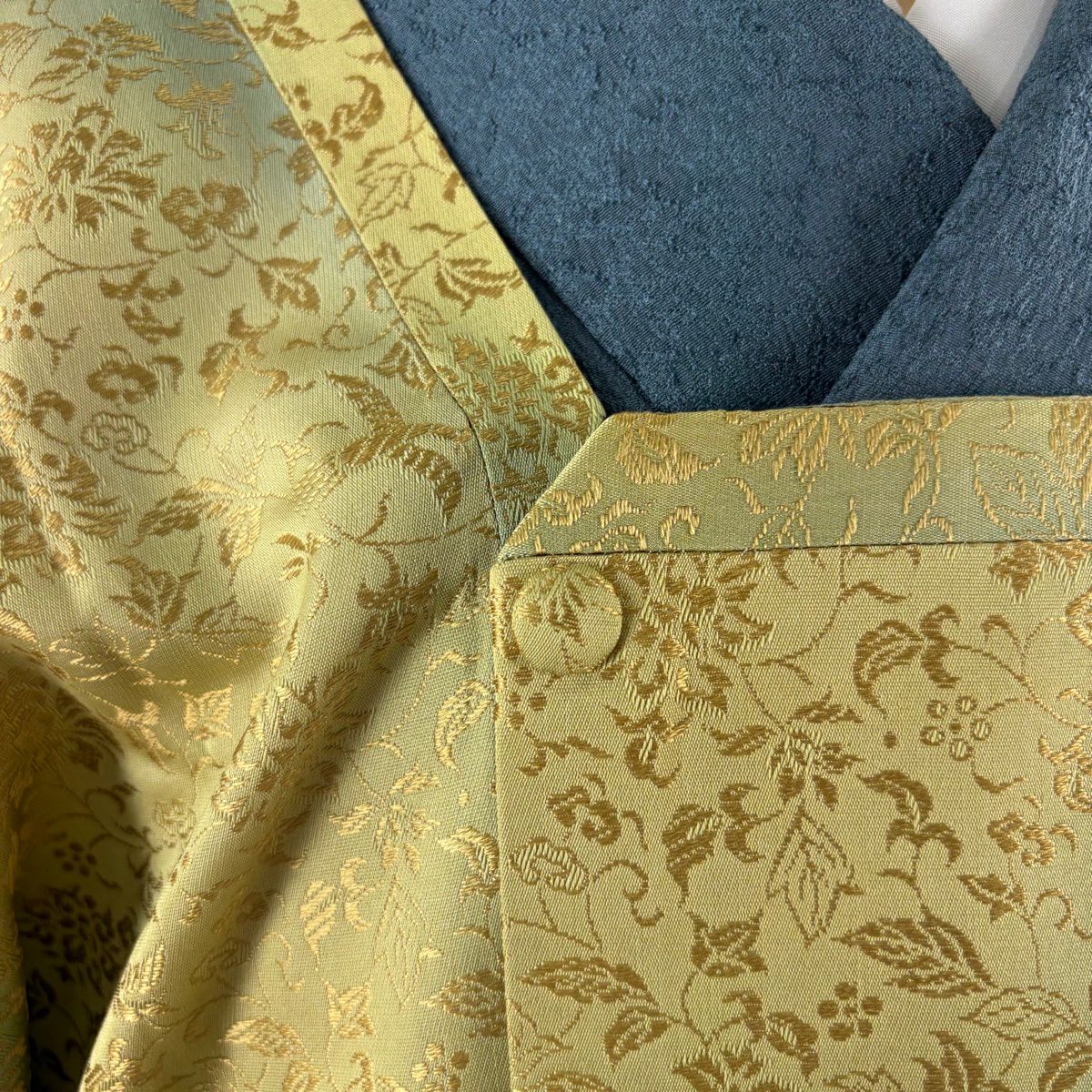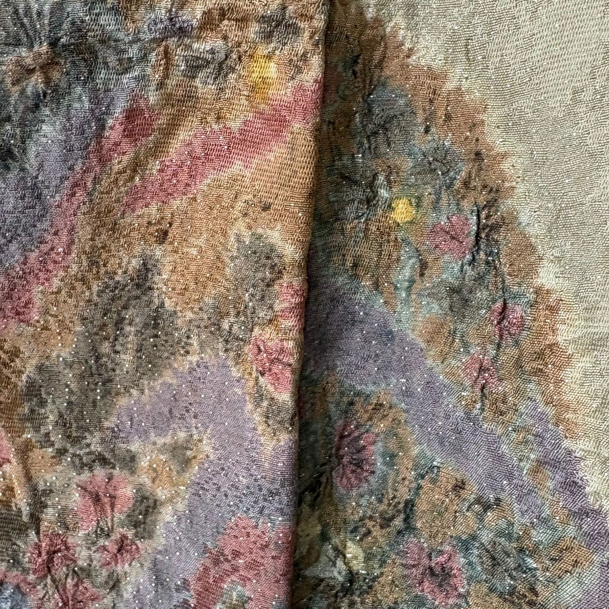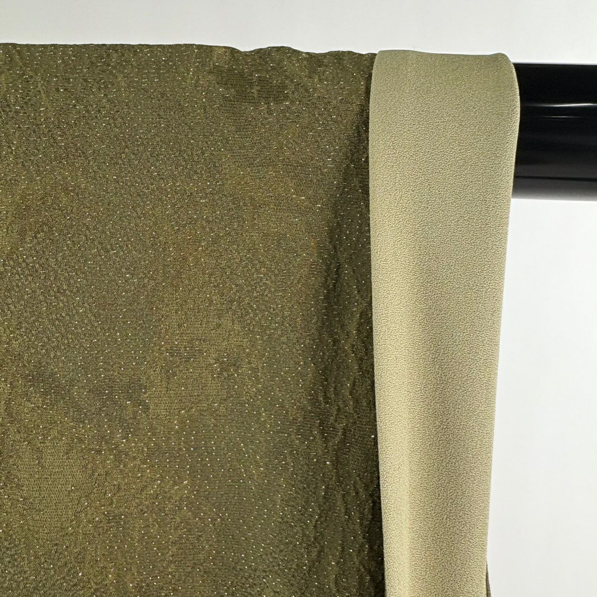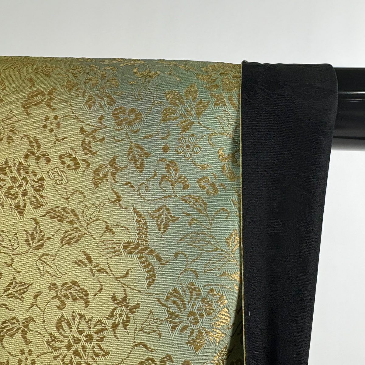 【在庫一掃】 道中着 身丈111cm 裄丈66cm M 和装コート 着物衿 紬地 秋草 流水 絞り 金彩 茶緑色 正絹 逸品