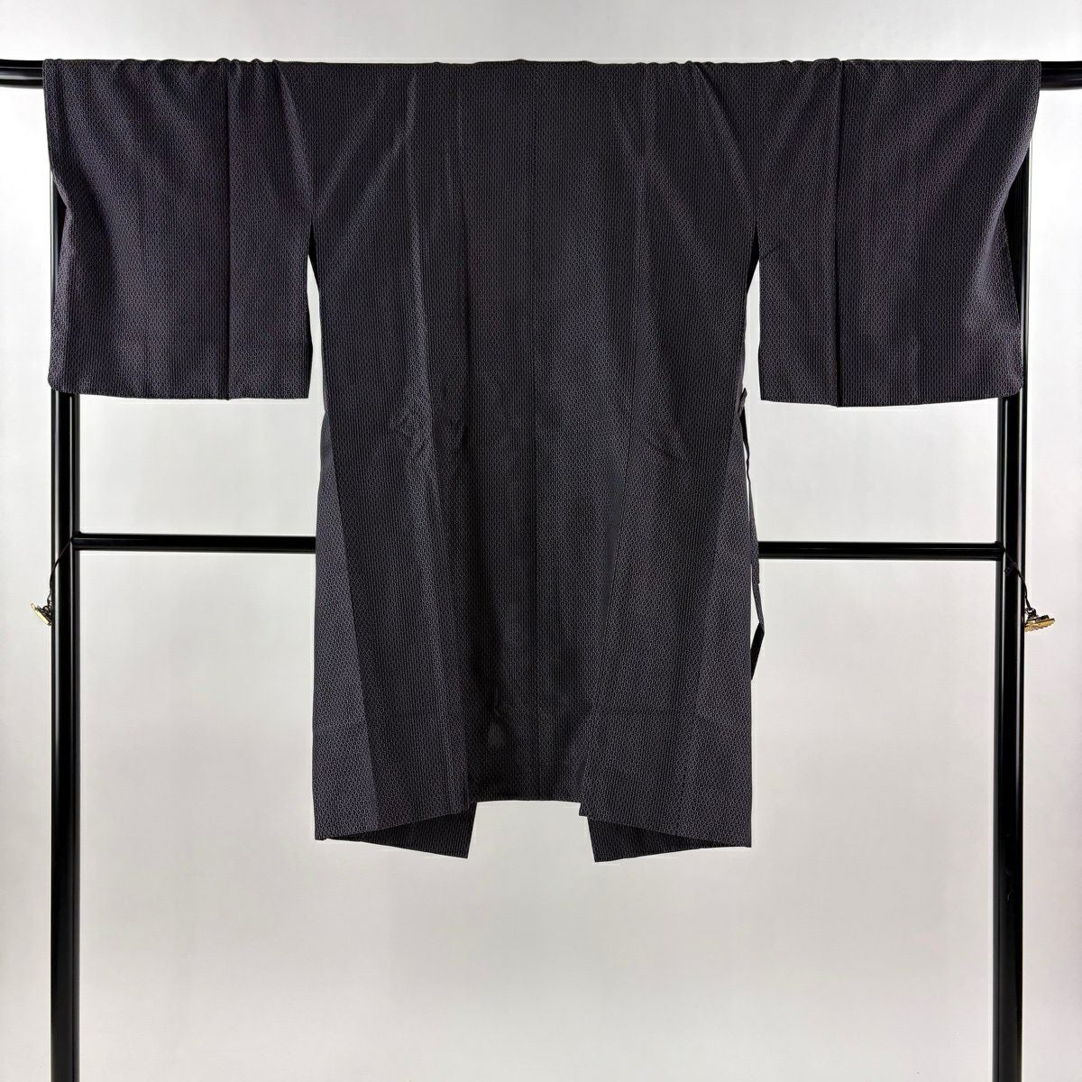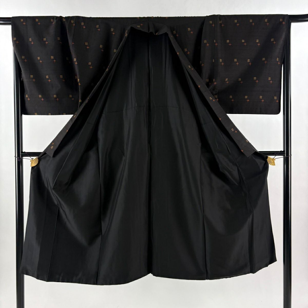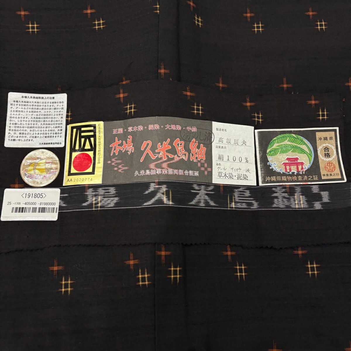 【美品】 男着物 身丈133.5cm 裄丈69cm S 袷 本場久米島紬 草木染 証紙あり 井桁絣 十字絣 焦茶色 正絹 逸品