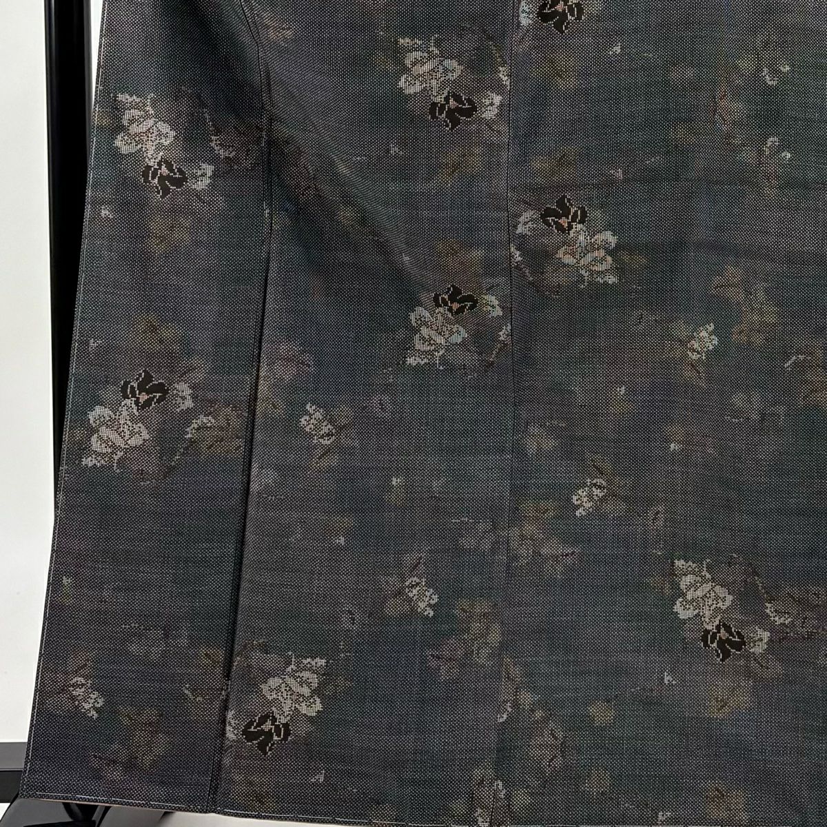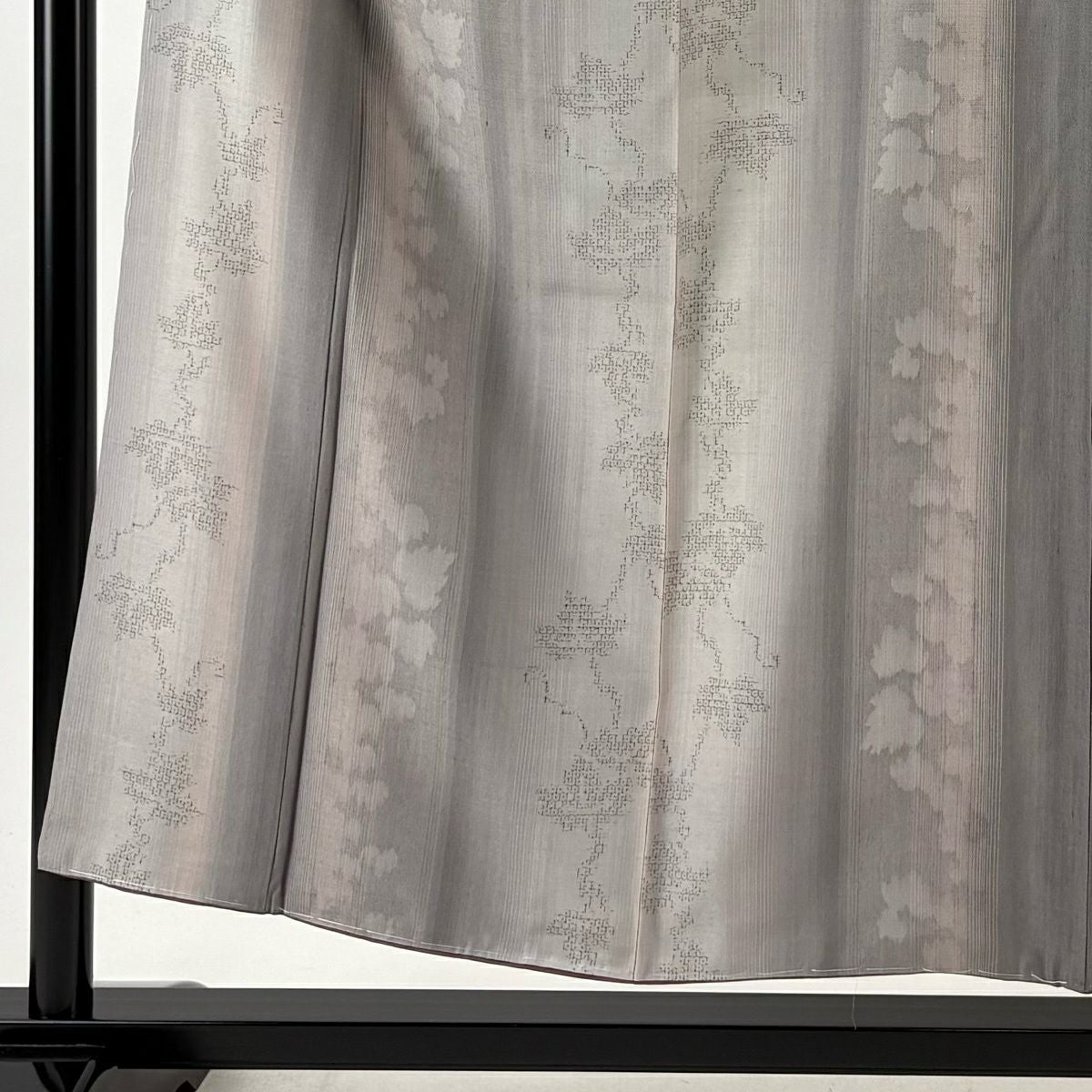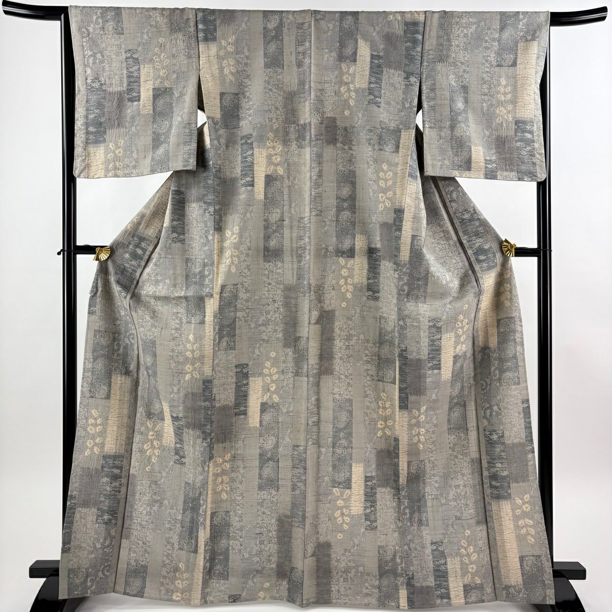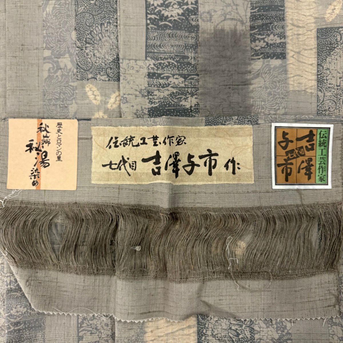 【美品】 小紋 身丈167cm 裄丈66cm M 単衣 吉澤与市 紬地 落款あり 証紙あり 菊唐草 短冊 絞り 灰色 正絹 逸品