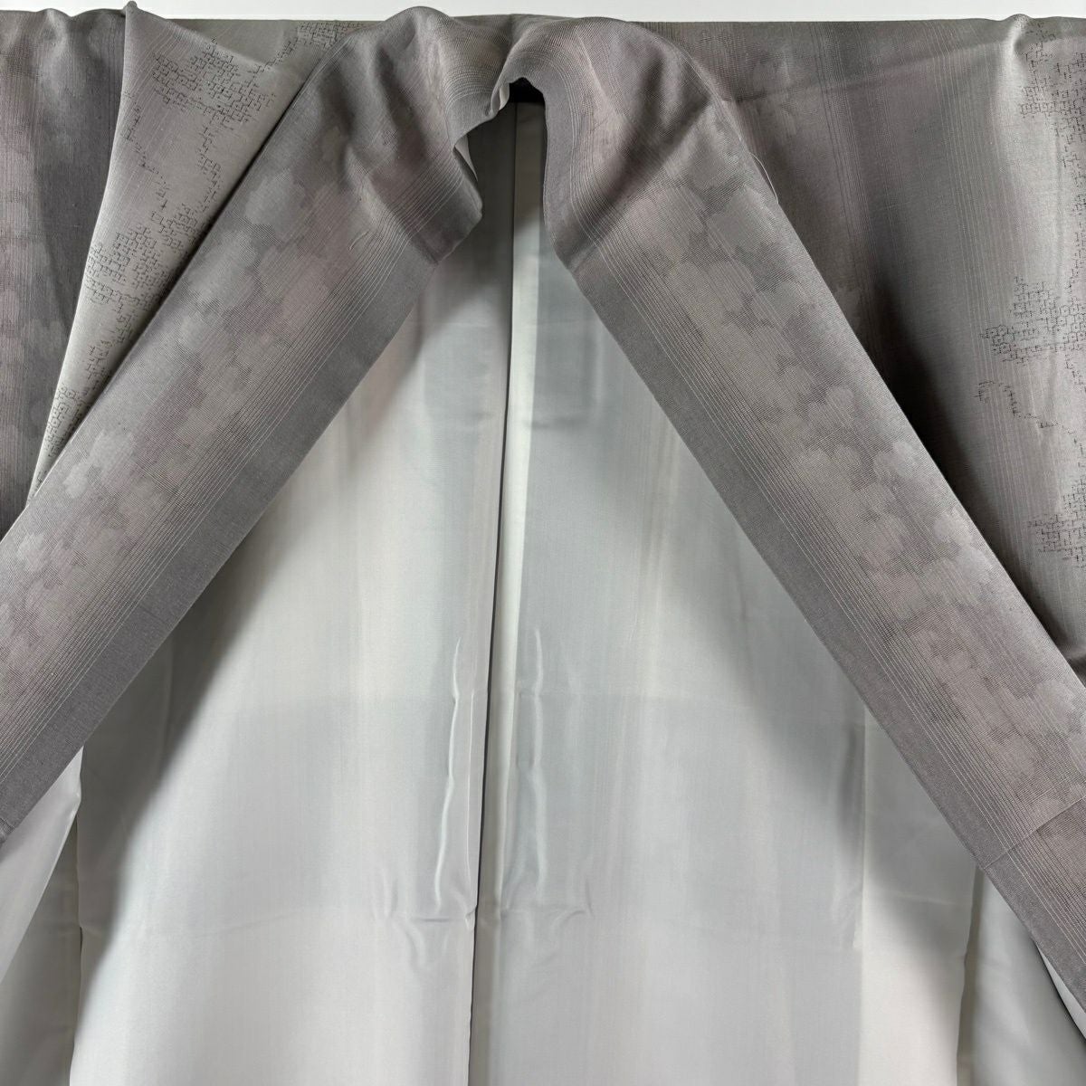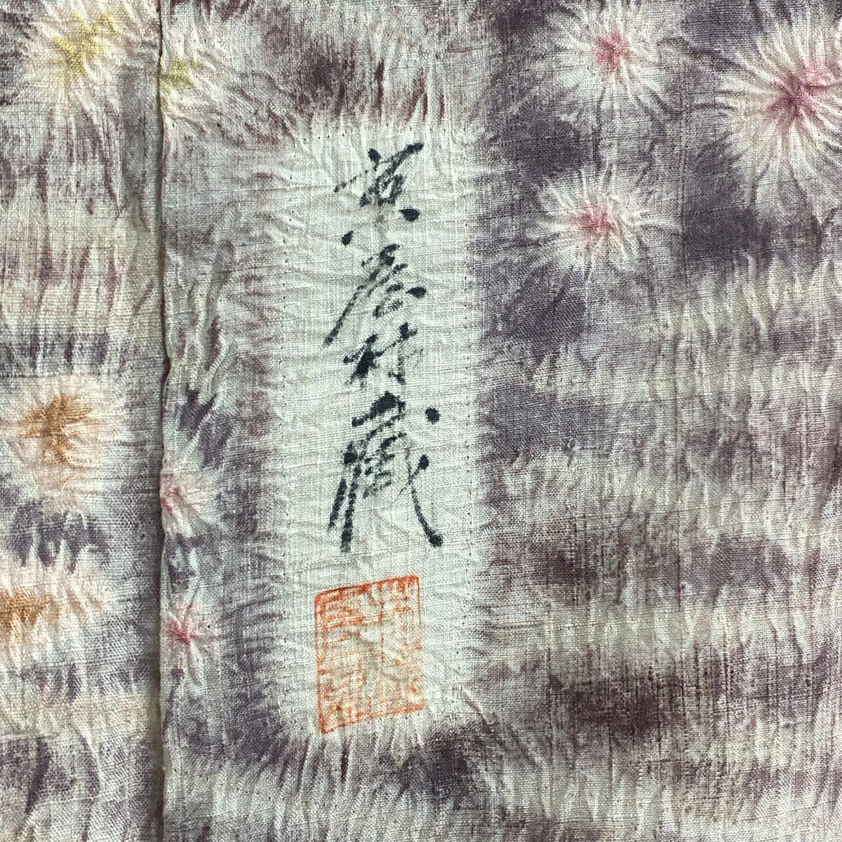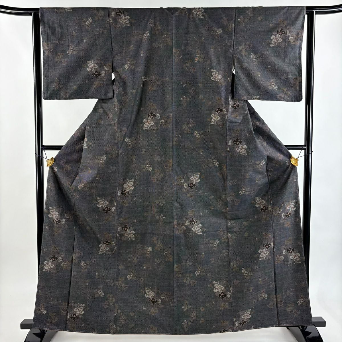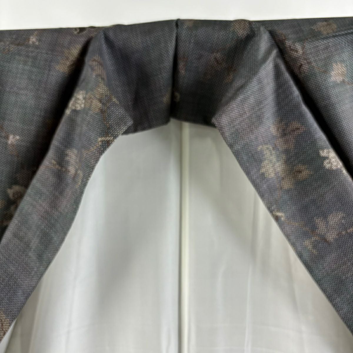 【美品】 小紋 身丈167cm 裄丈66cm M 単衣 吉澤与市 紬地 落款あり 証紙あり 菊唐草 短冊 絞り 灰色 正絹 逸品