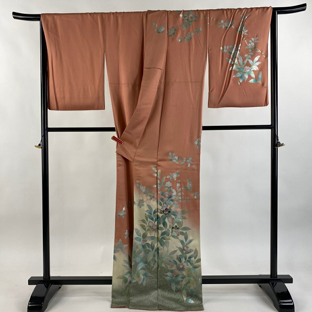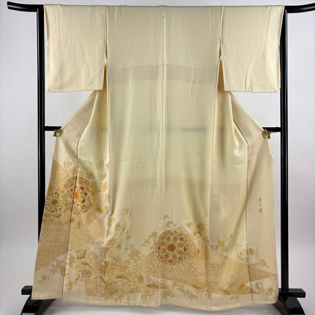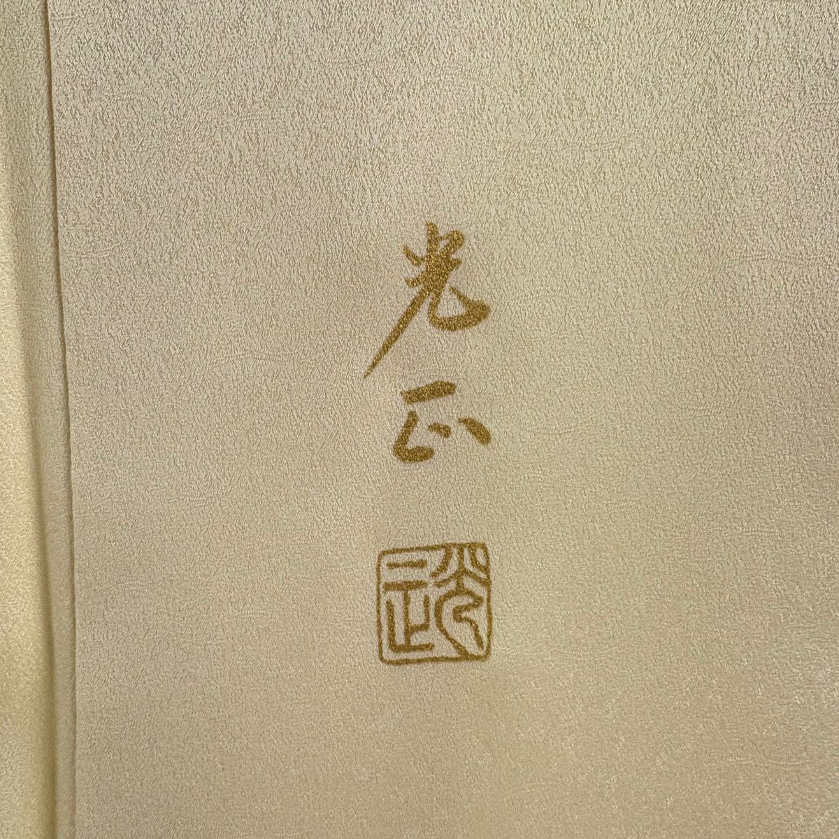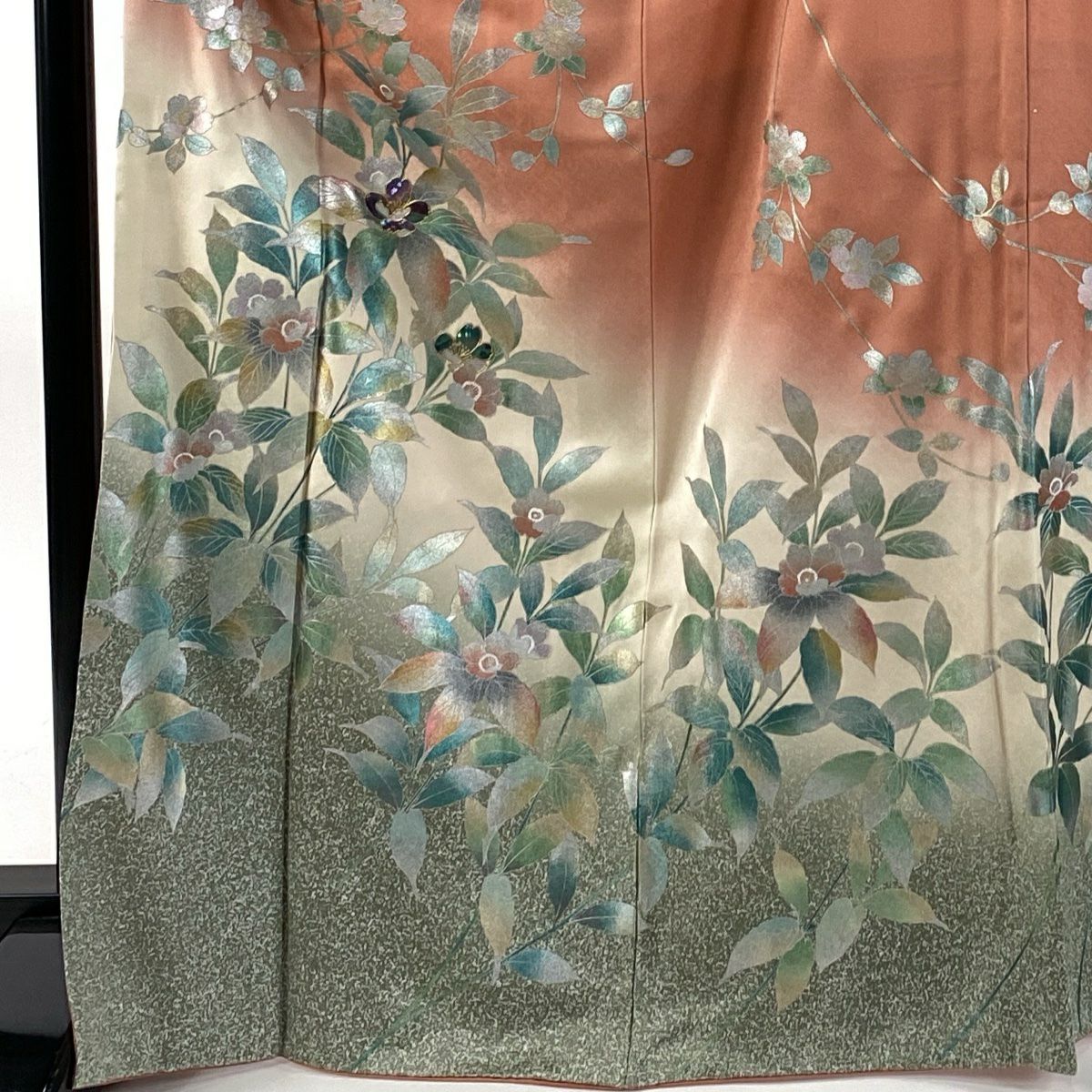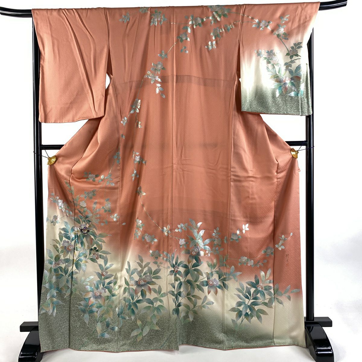 【在庫一掃】 訪問着 身丈170cm 裄丈68cm L 袷 藤本隆士 落款あり 草花 螺鈿 金銀彩 薄オレンジ 正絹 逸品