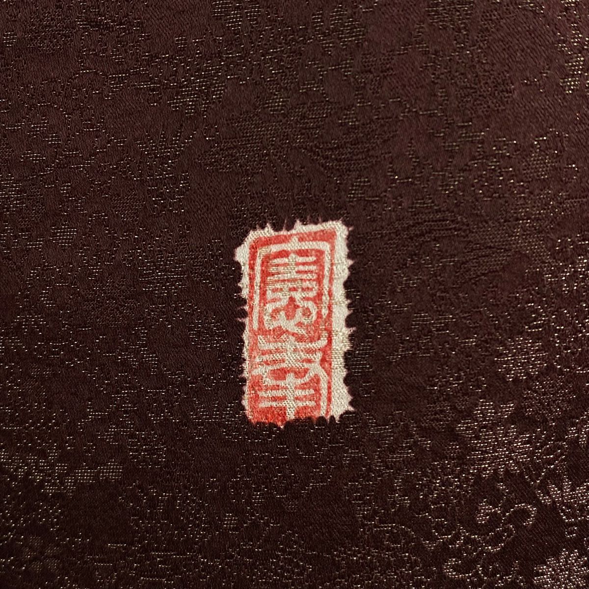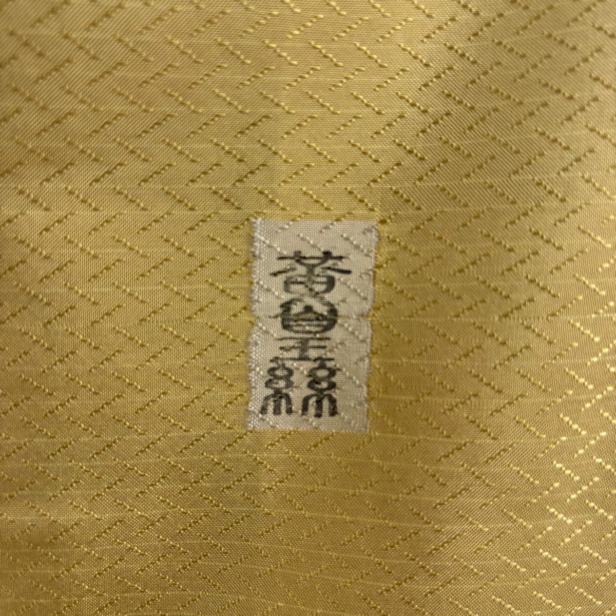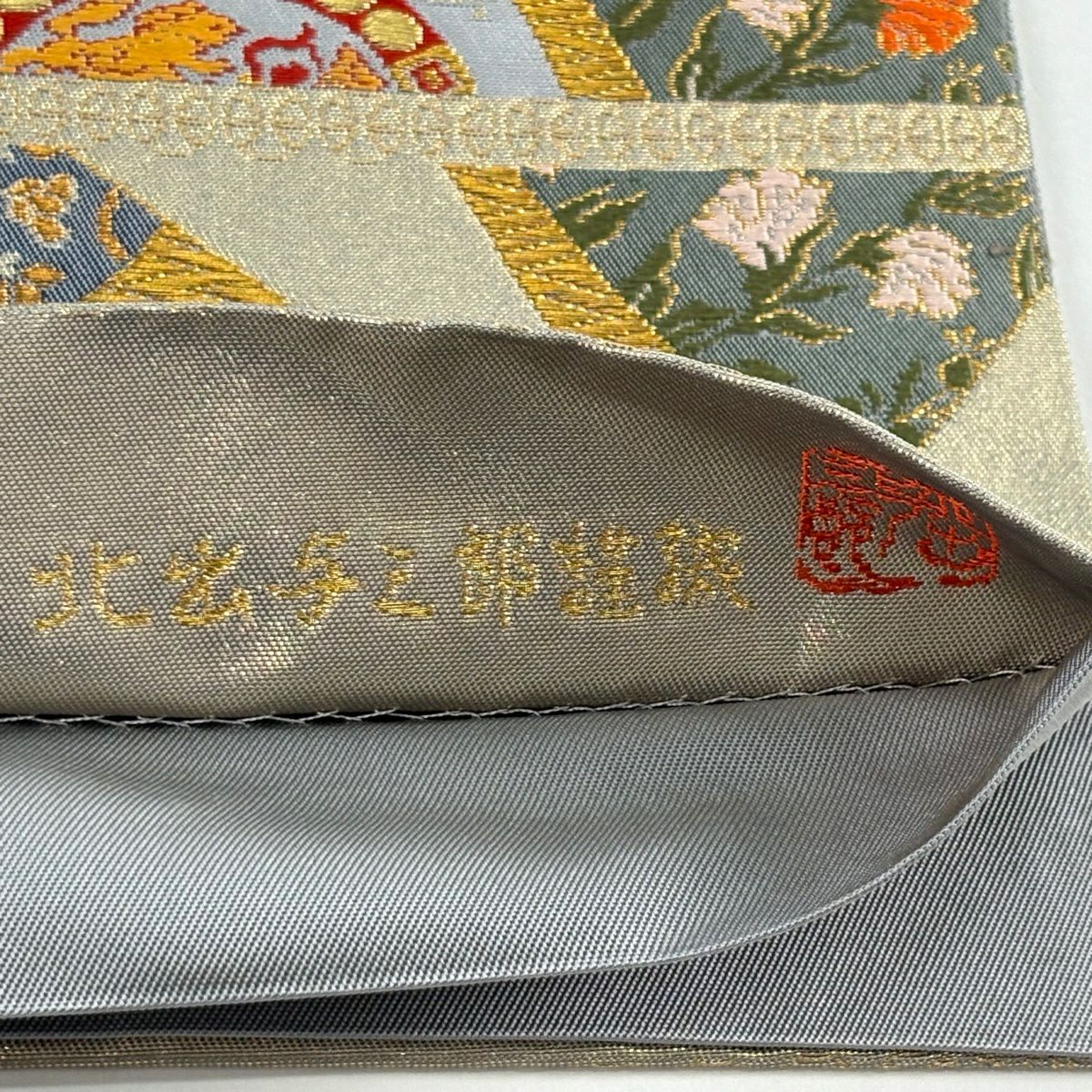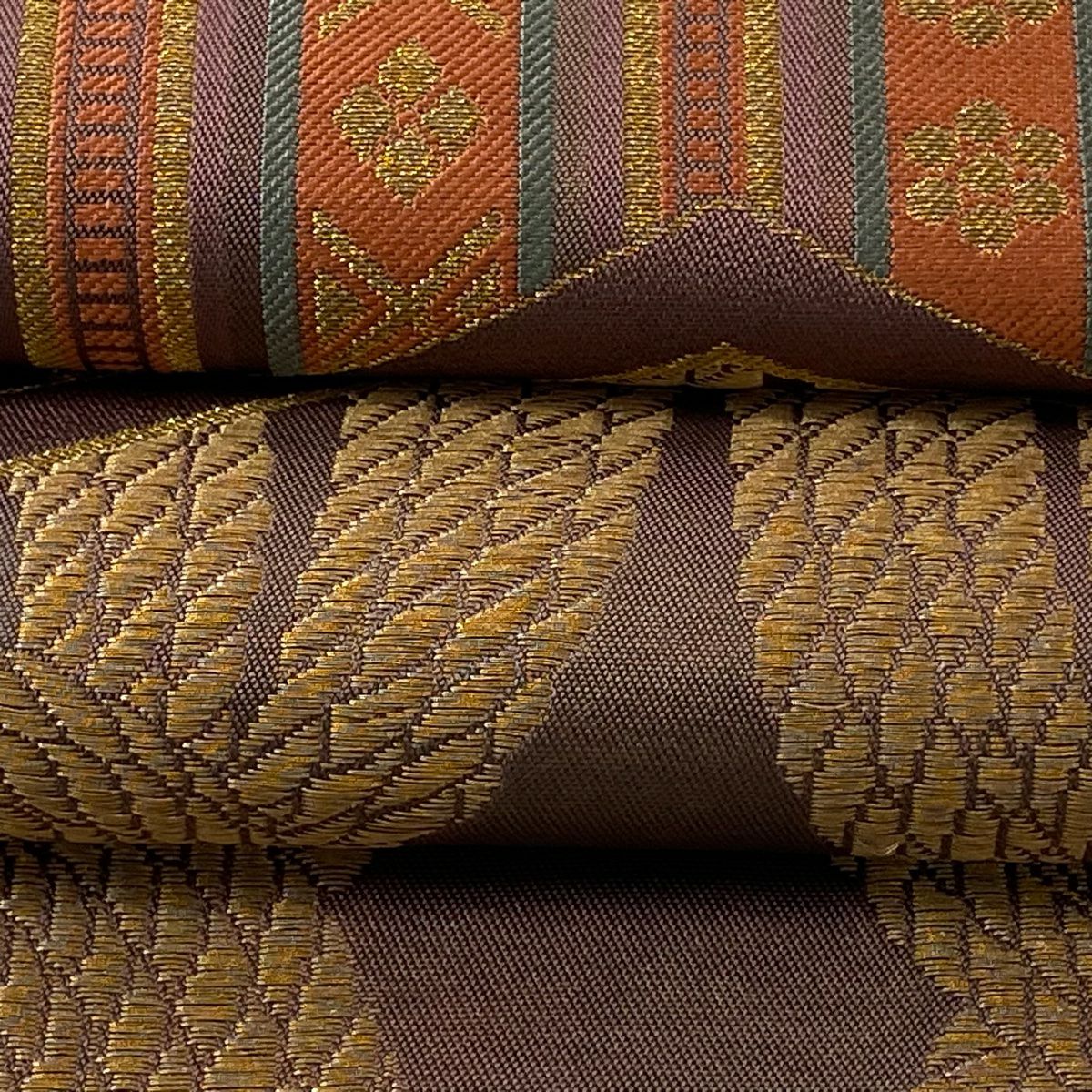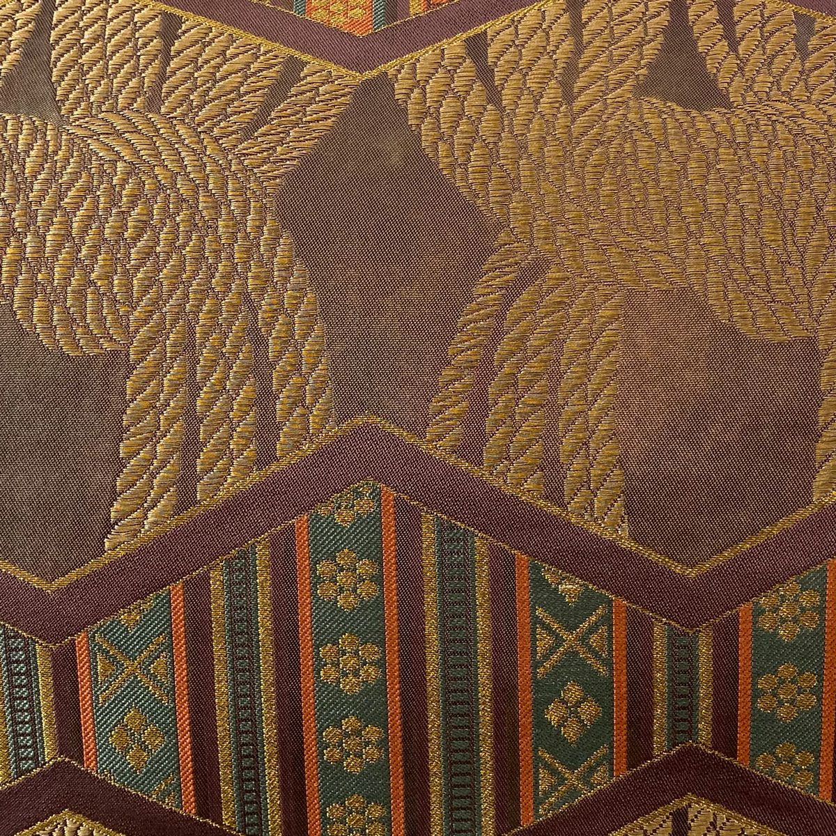 【在庫一掃】 【美品】 袋帯 逸品 北出与三郎 落款あり 吉祥縄紋錦 本袋 関西仕立て 縞 菱 金糸 箔 小豆色 六通 正絹