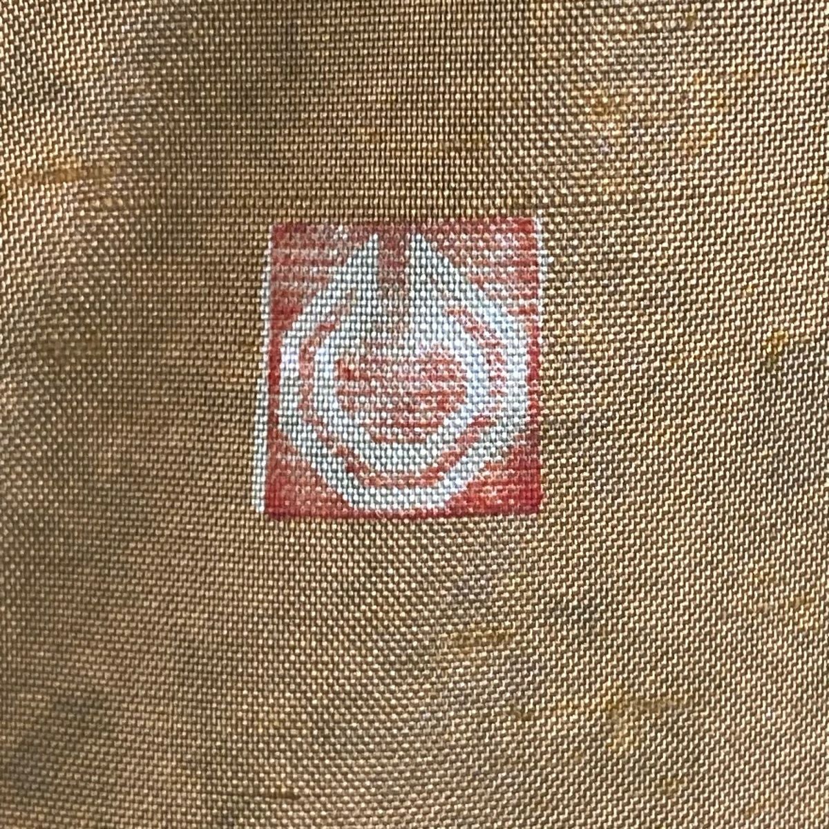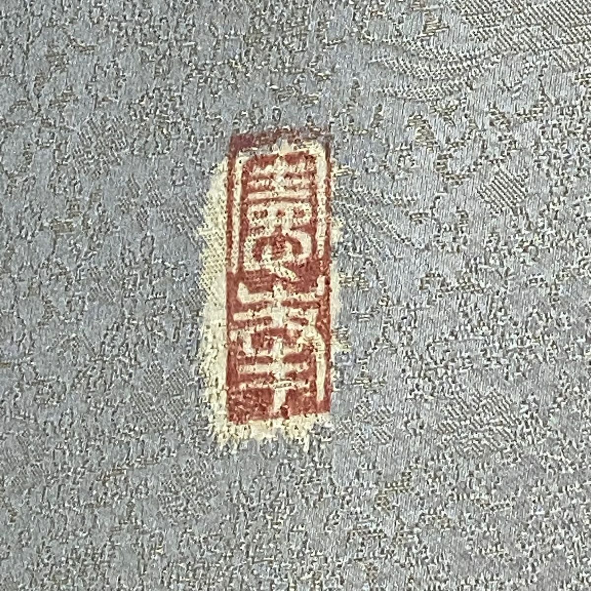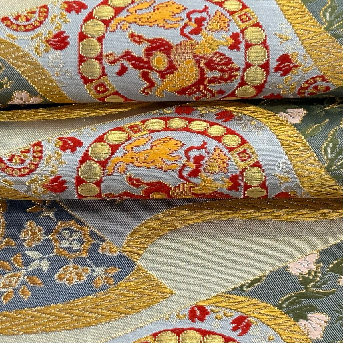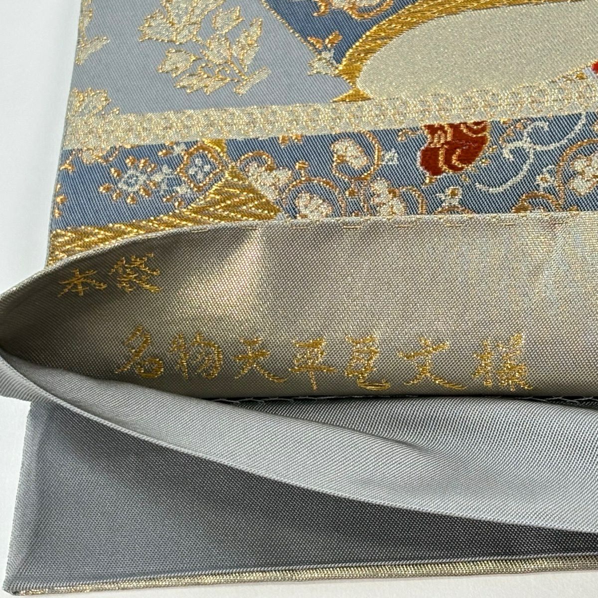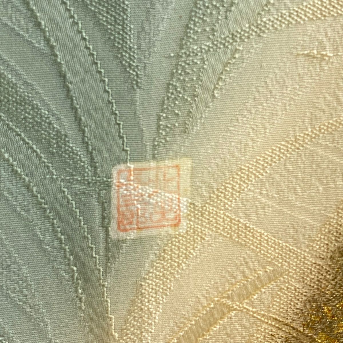 【在庫一掃】 【美品】 袋帯 逸品 北出与三郎 落款あり 吉祥縄紋錦 本袋 関西仕立て 縞 菱 金糸 箔 小豆色 六通 正絹