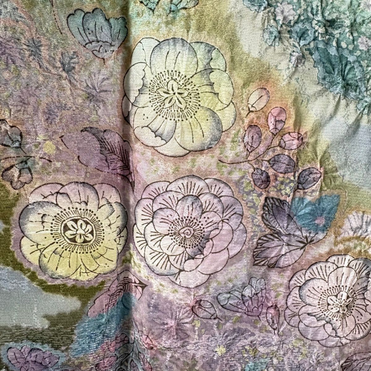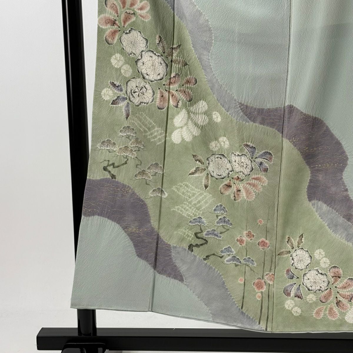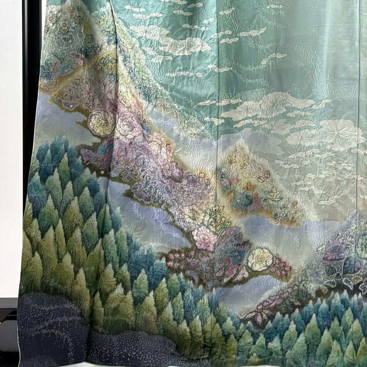 【美品】 訪問着 身丈167.5cm 裄丈68cm L 袷 吉乃一廉 落款あり 辻が花 樹木 銀通し ぼかし 薄緑 正絹 逸品