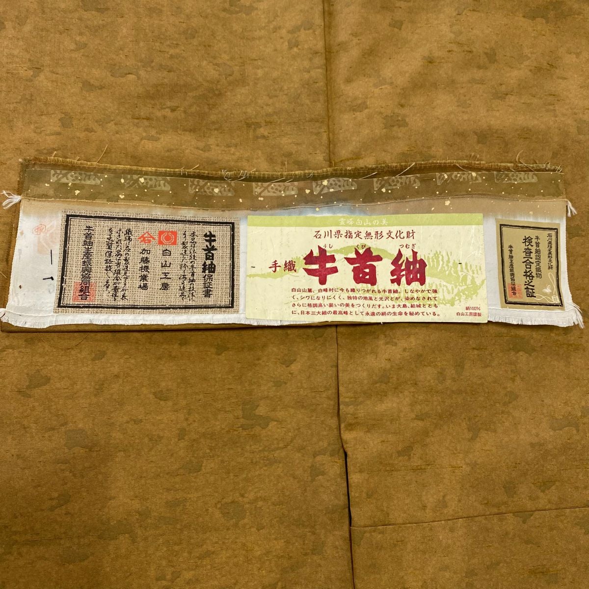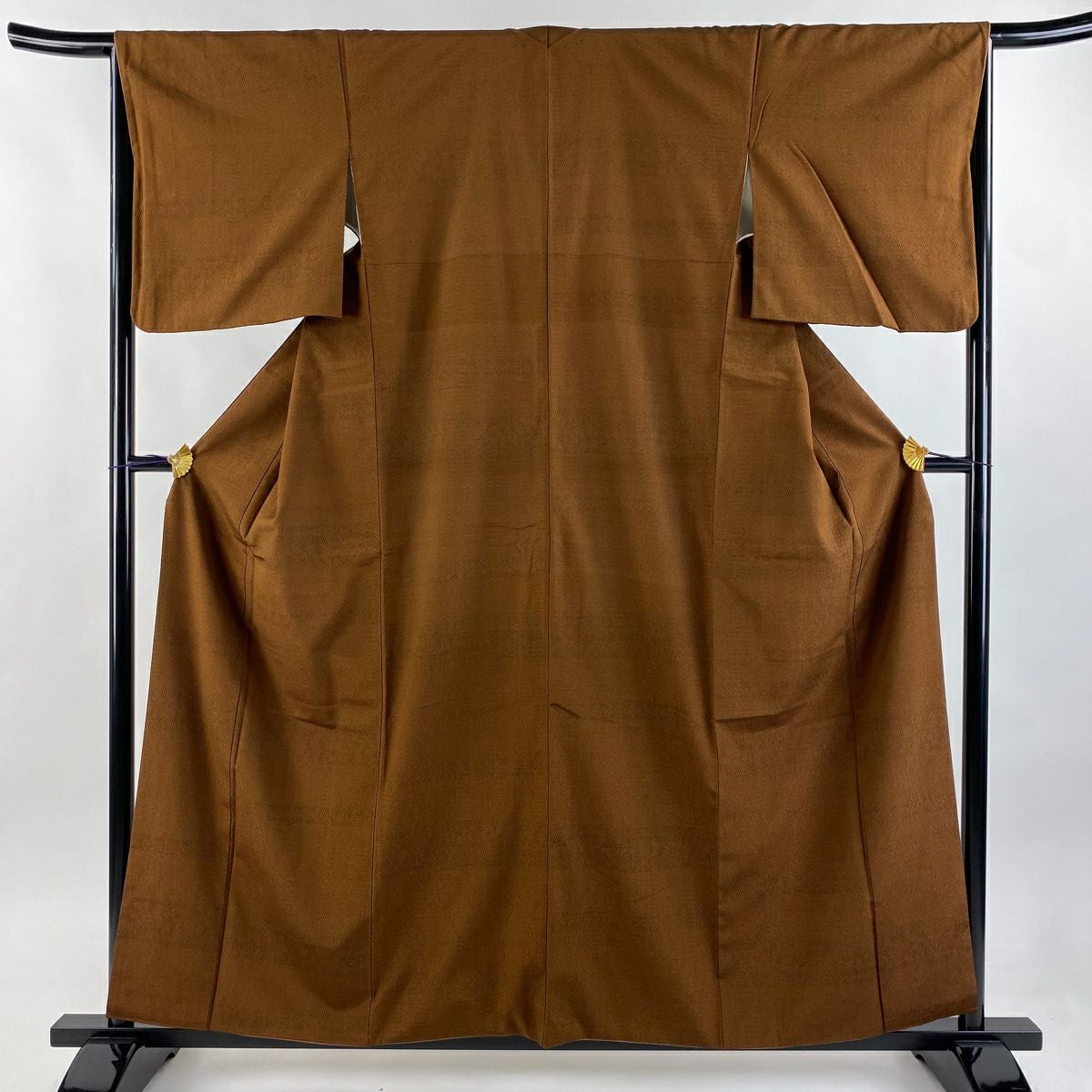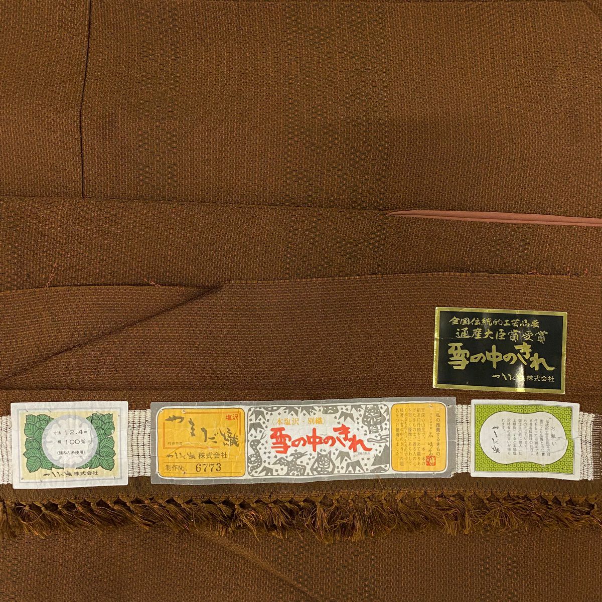 【在庫一掃】 お召 身丈158cm 裄丈65.5cm M 袷 やまだ織 雪の中のきれ 証紙あり 段縞 亀甲 茶色 正絹 逸品