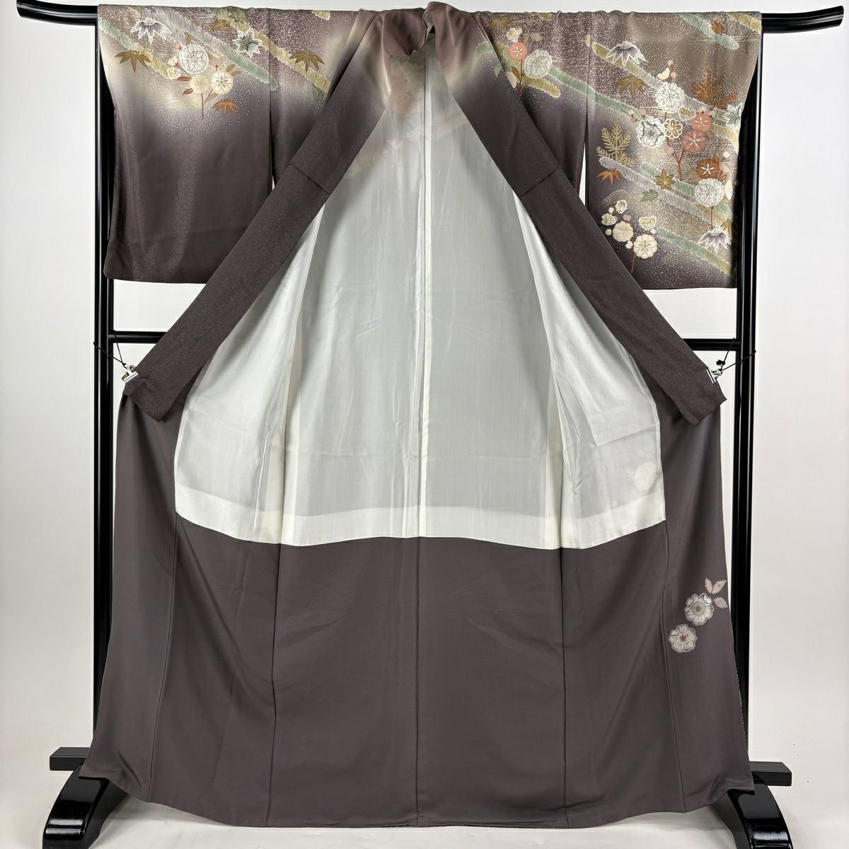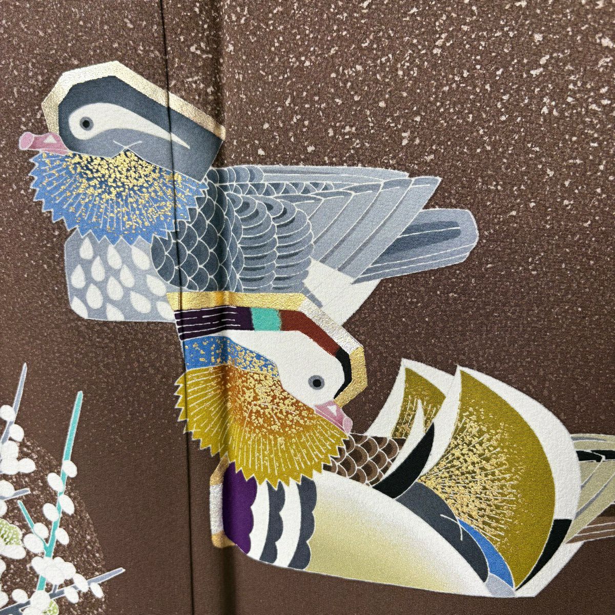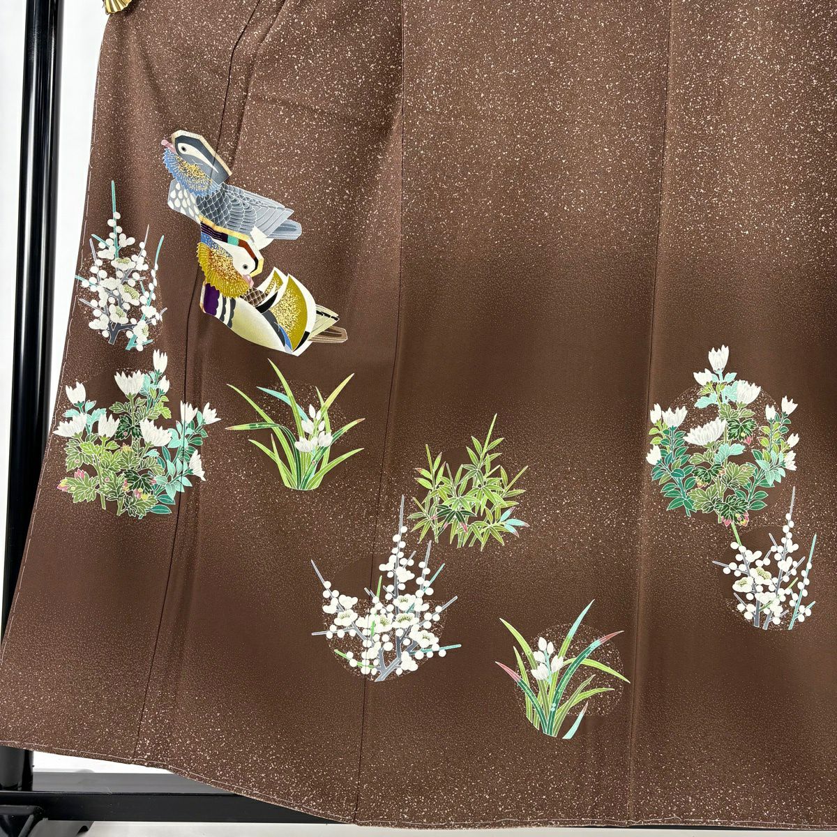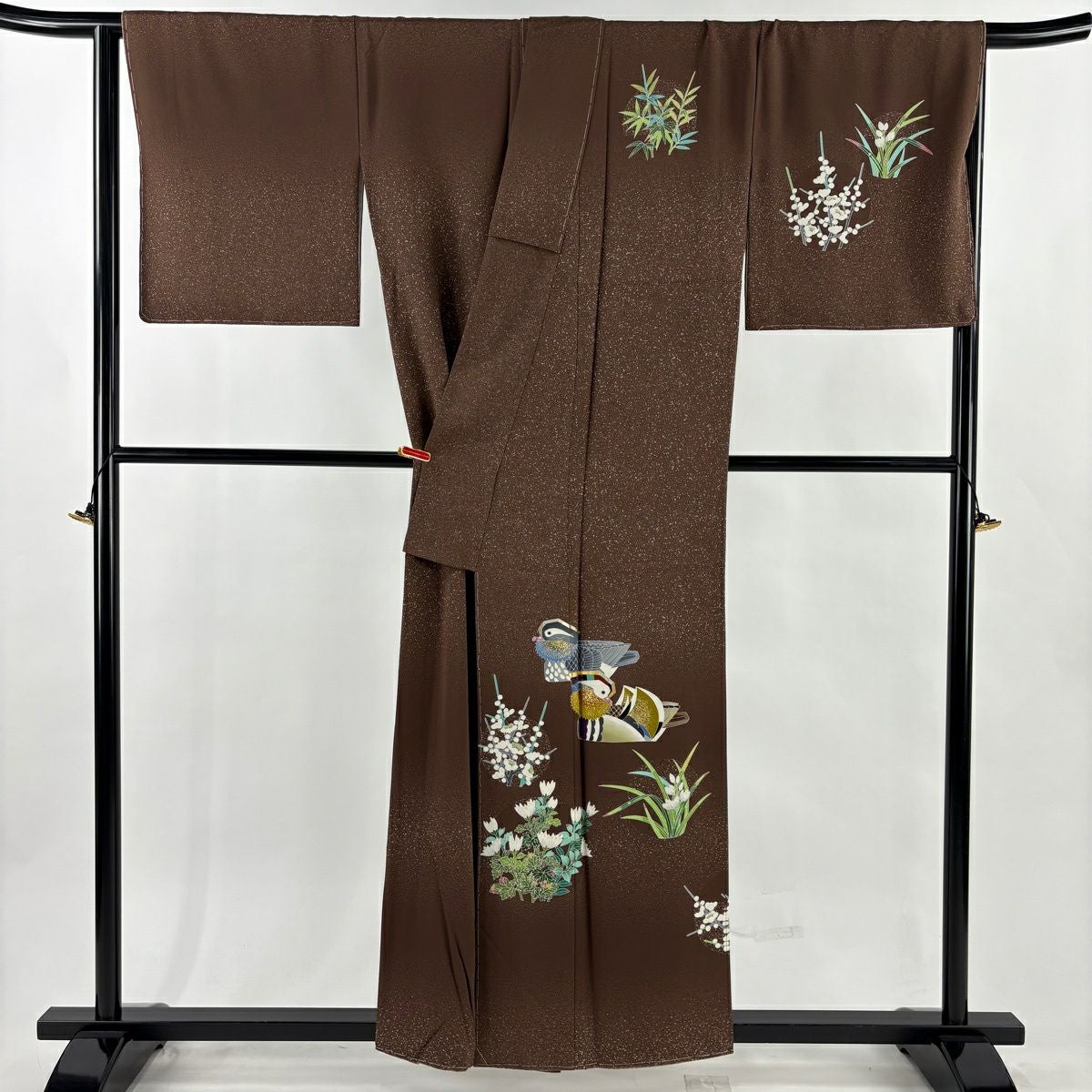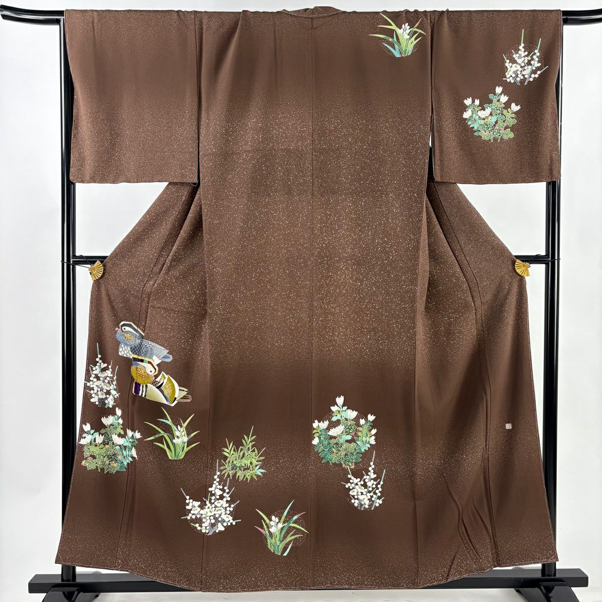 【美品】 付下げ 身丈158cm 裄丈68.5cm L 袷 TOKIO et TOKI 落款あり 鴛鴦 草花 金銀彩 茶色 正絹 逸品