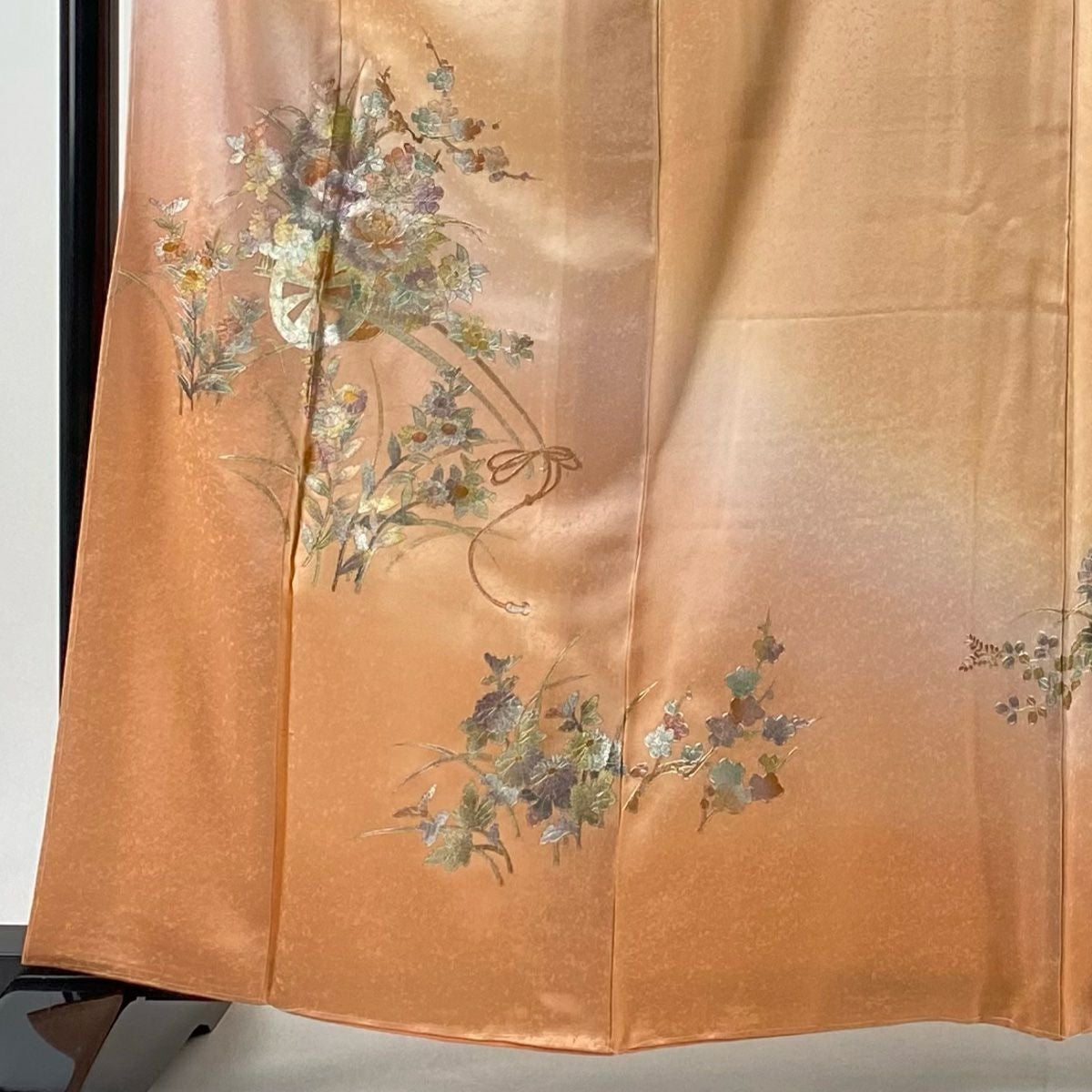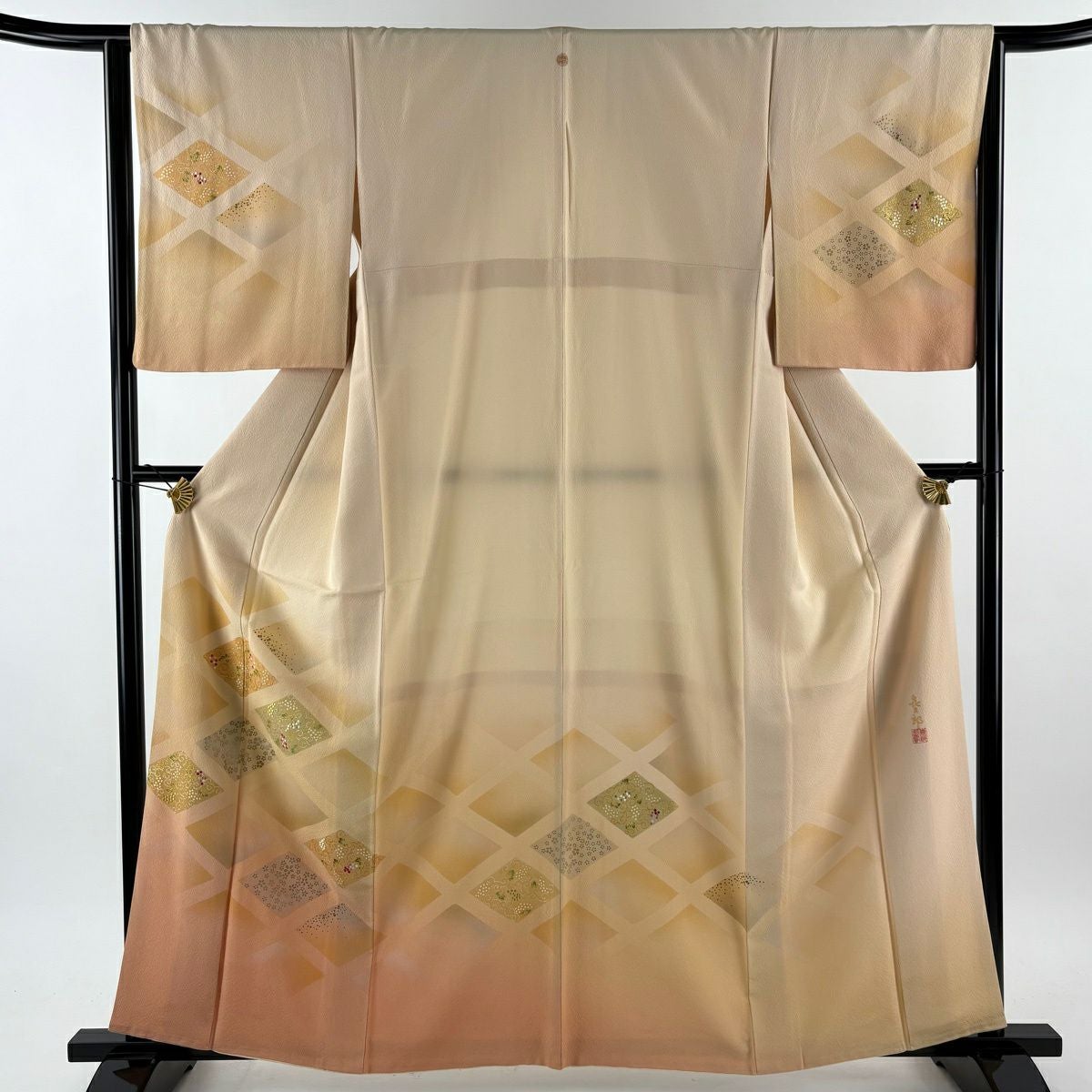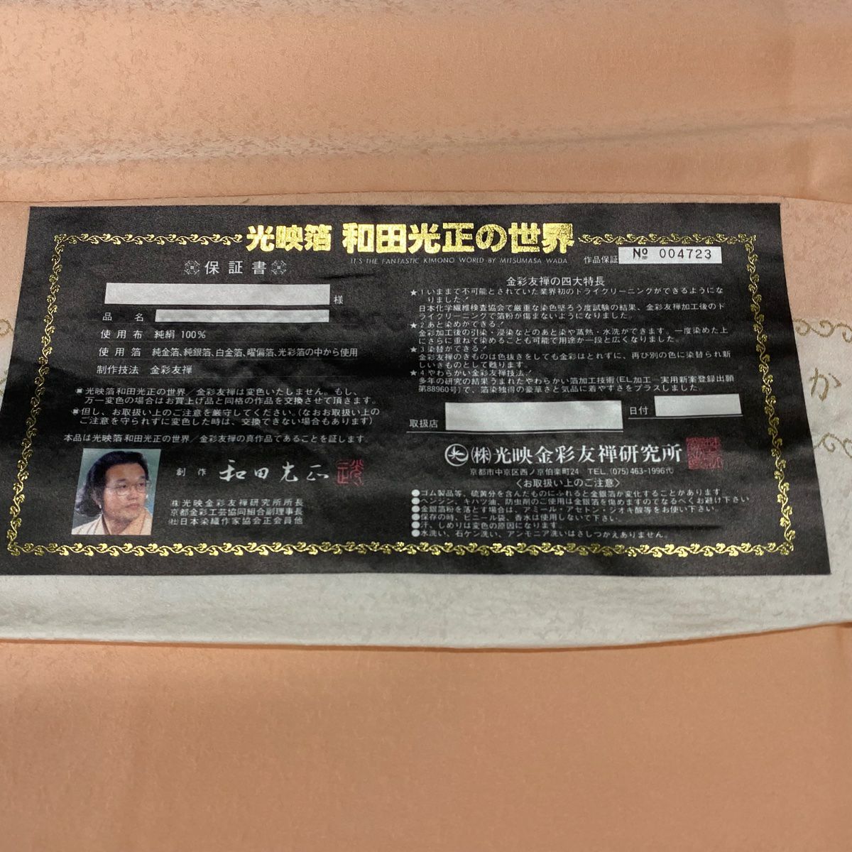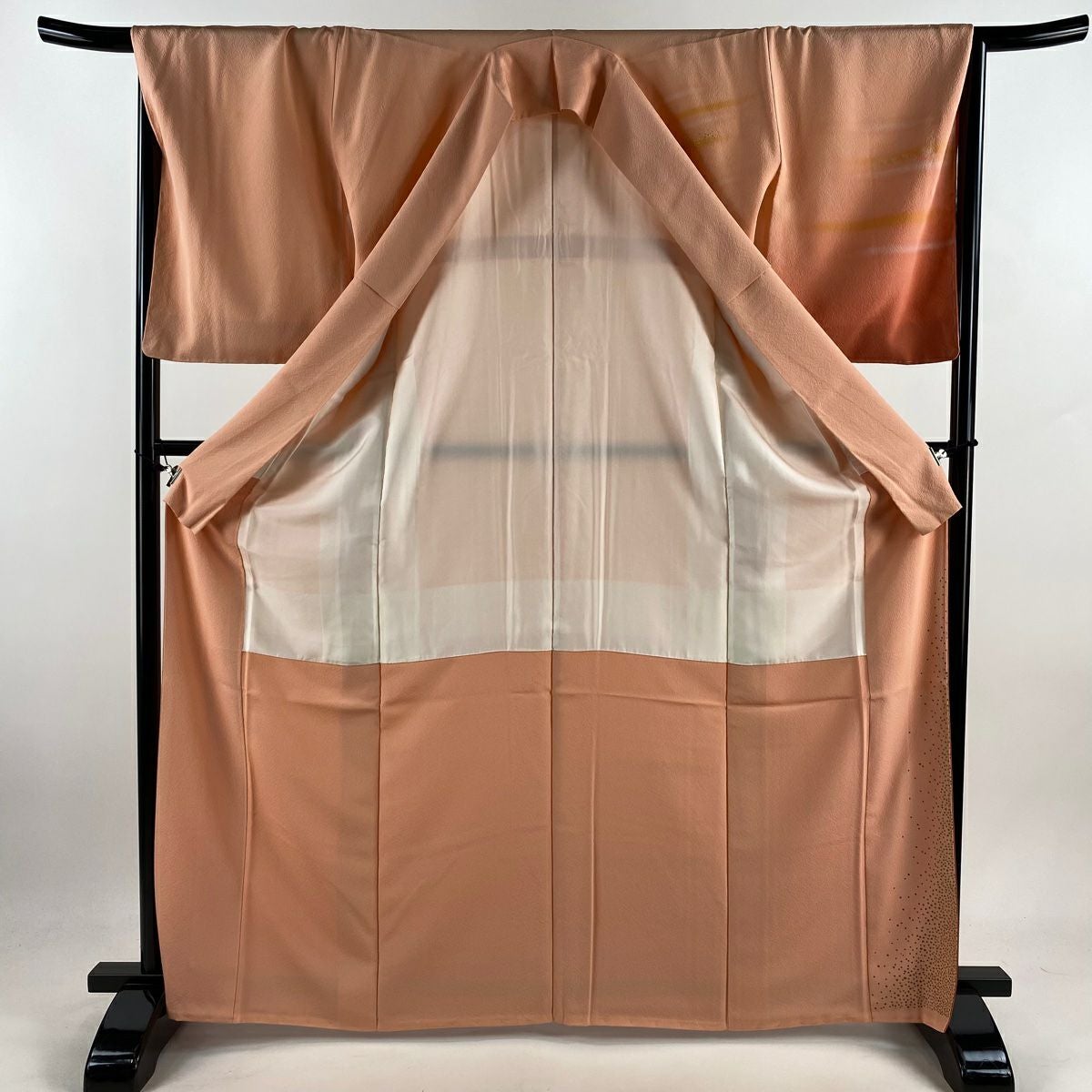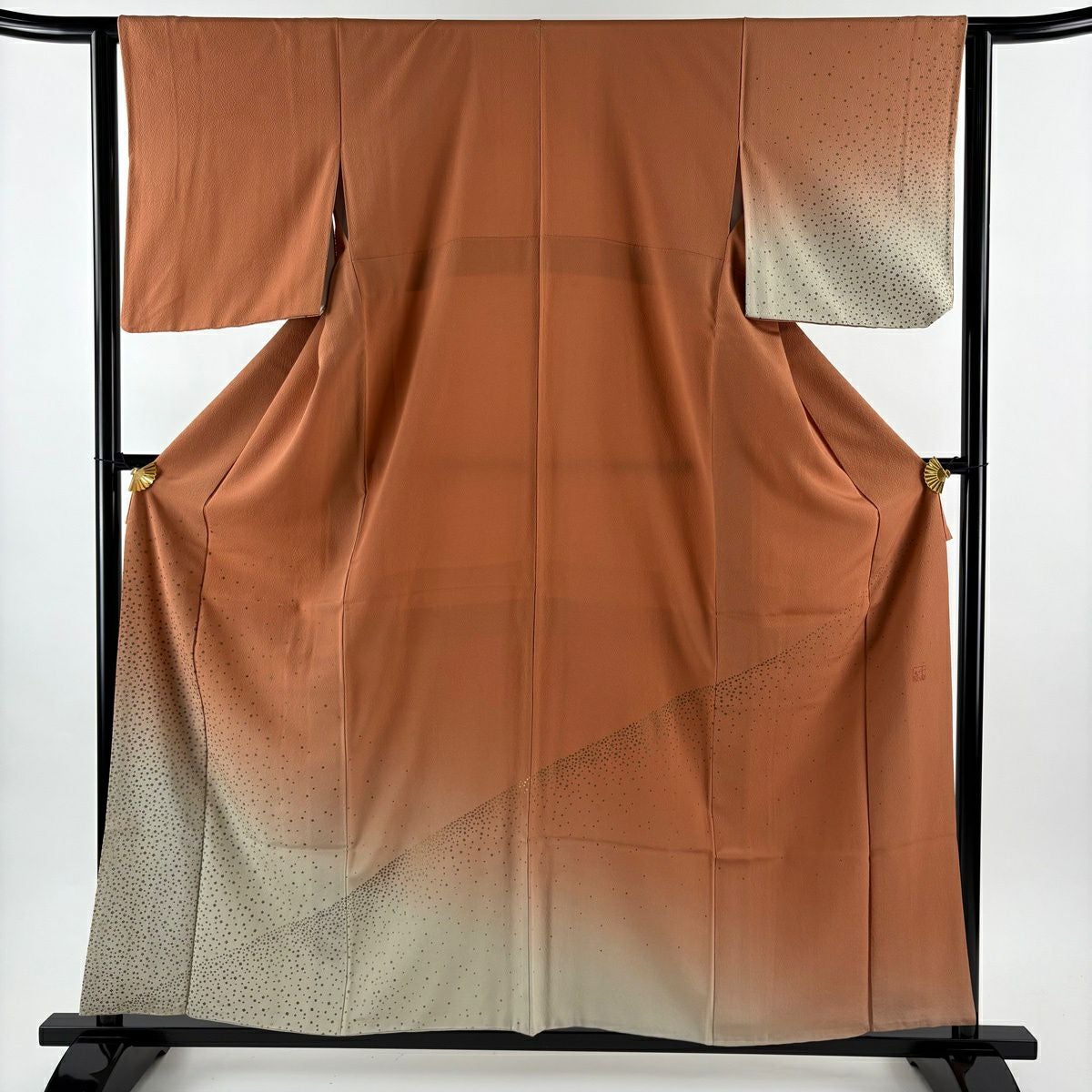 他の画像を見る 【在庫一掃】 【美品】 付下げ 身丈165.5cm 裄丈68cm L 袷 人間国宝 福田喜重 鈴乃屋 落款あり 霞 箔散らし 金彩 ぼかし 薄オレンジ 正絹 逸品 一つ紋 ¥ 12,540 税込