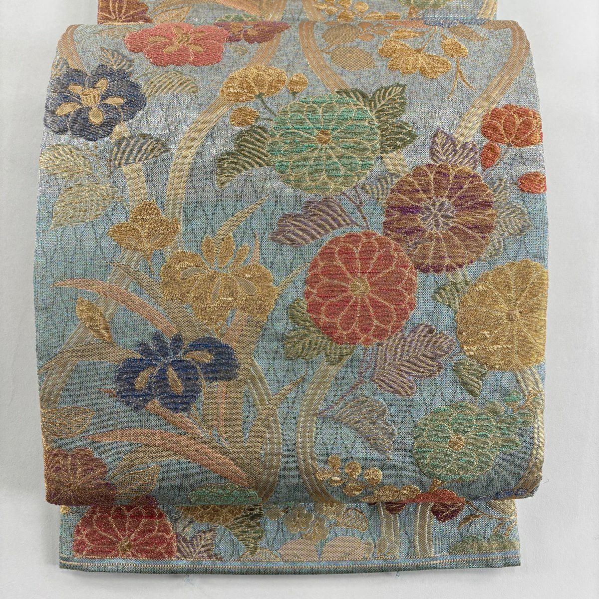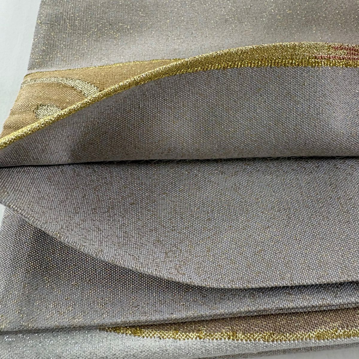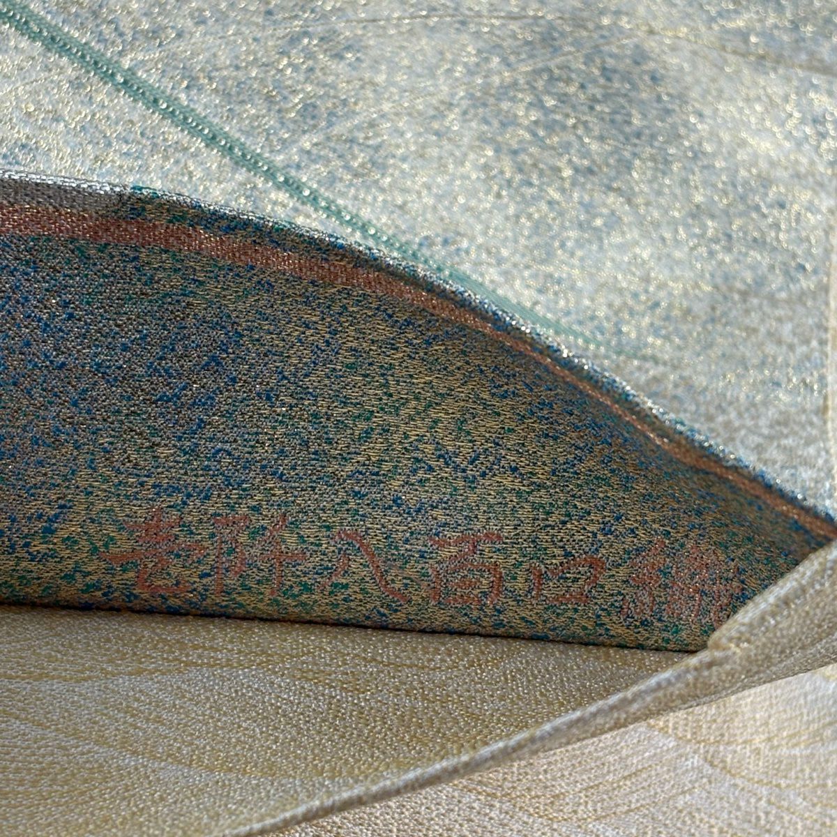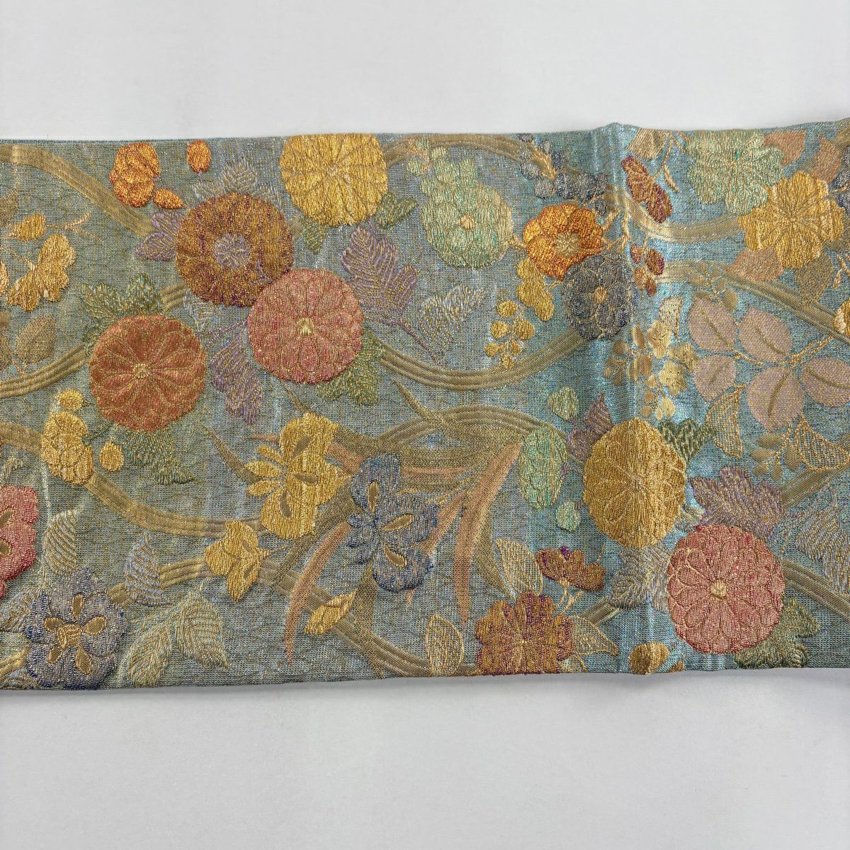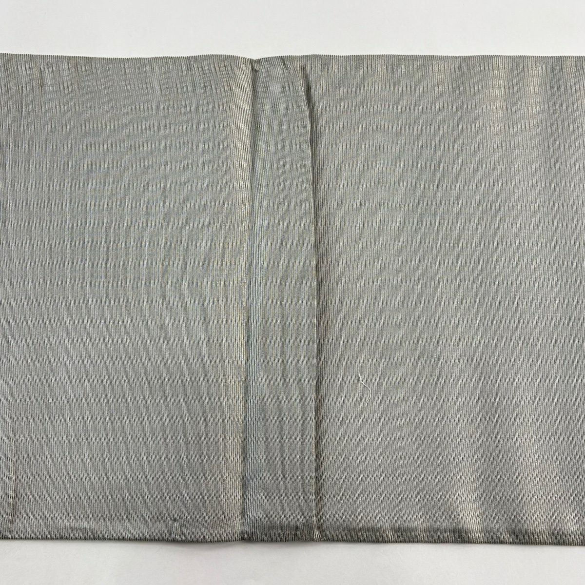 【美品】 袋帯 逸品 夏帯 花菱 金糸 箔 青灰色 六通 正絹