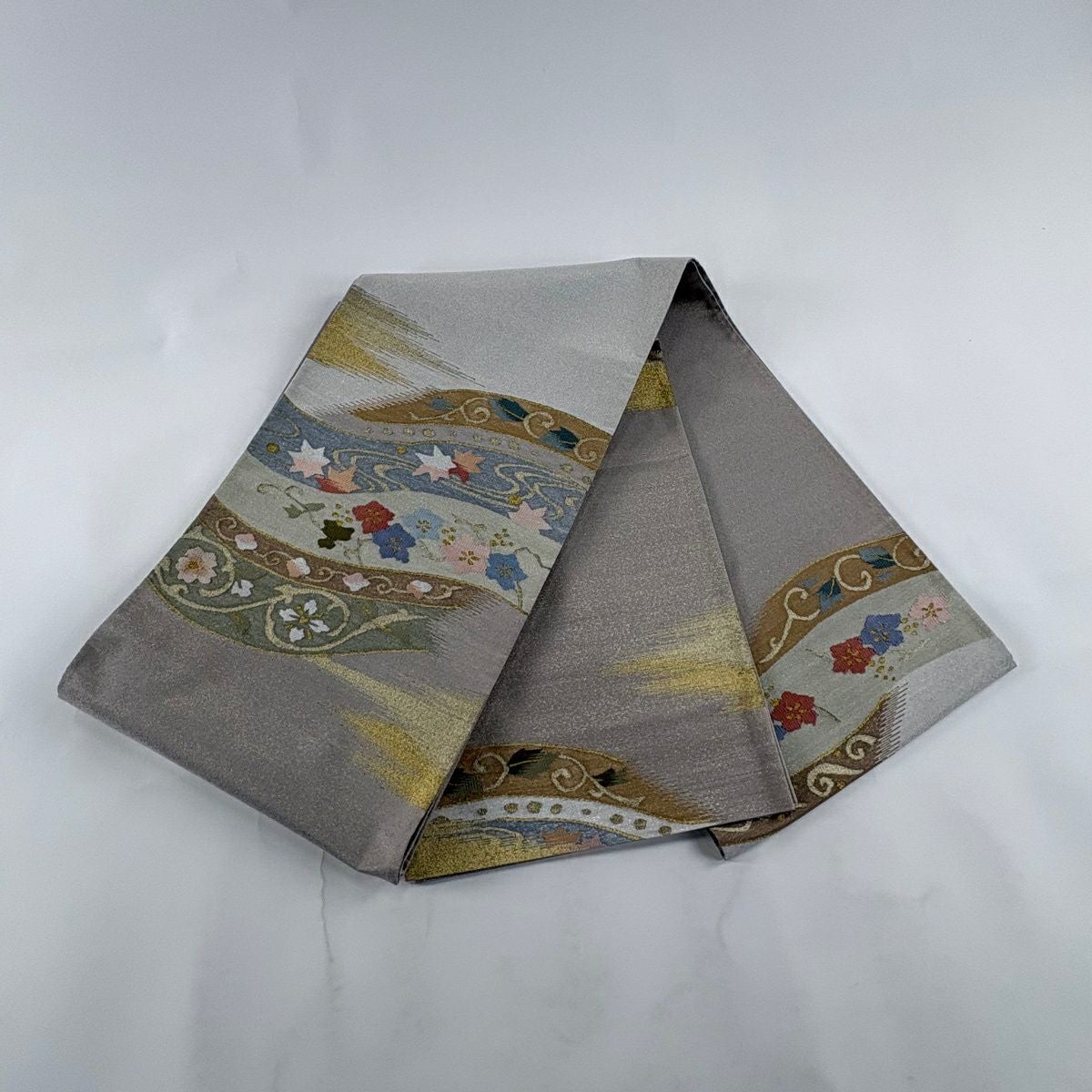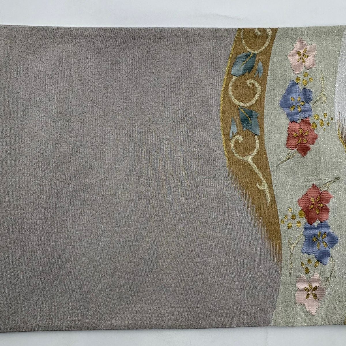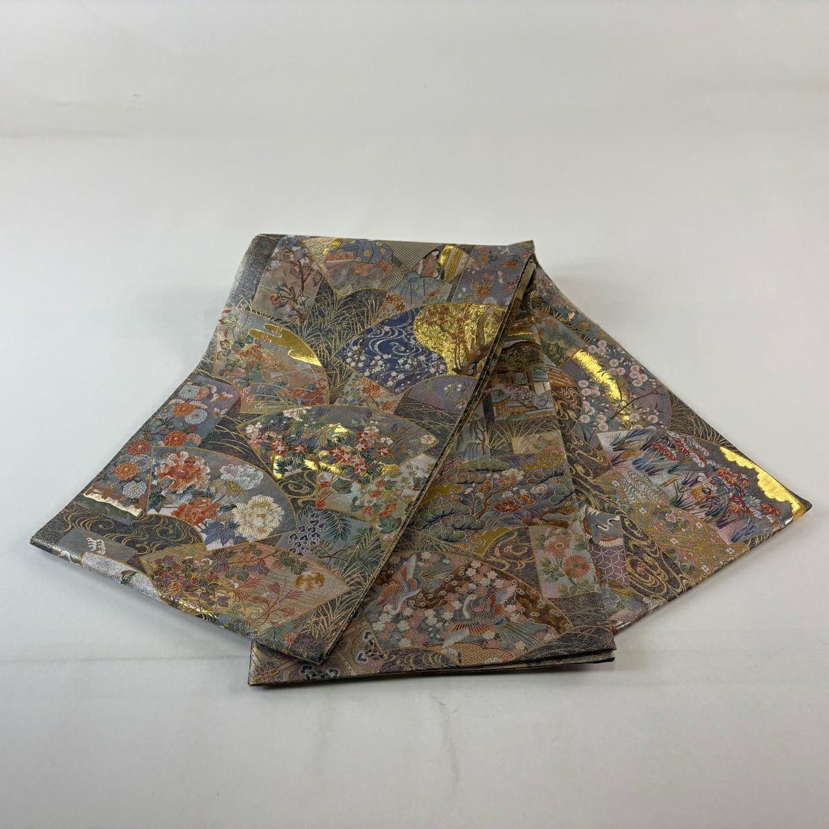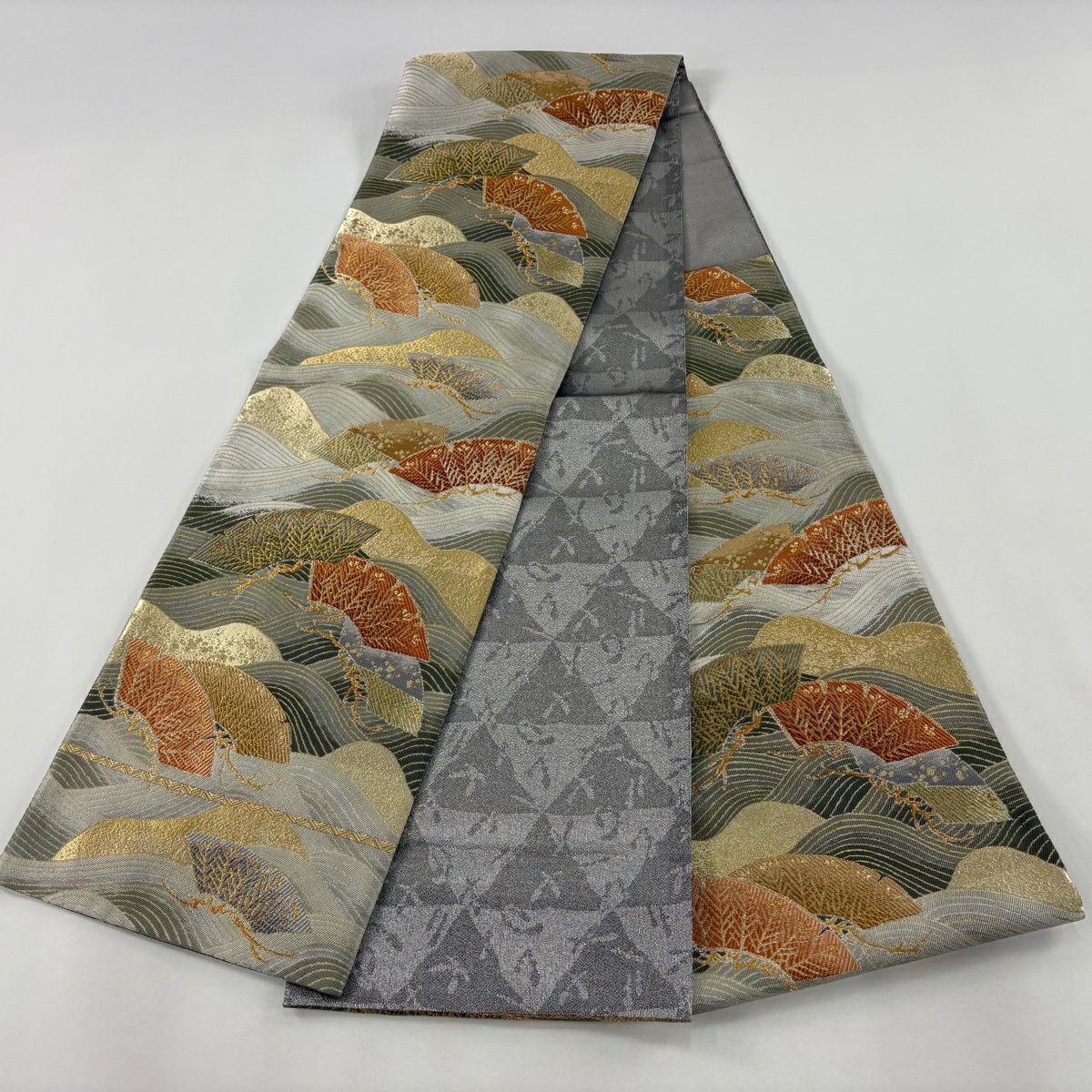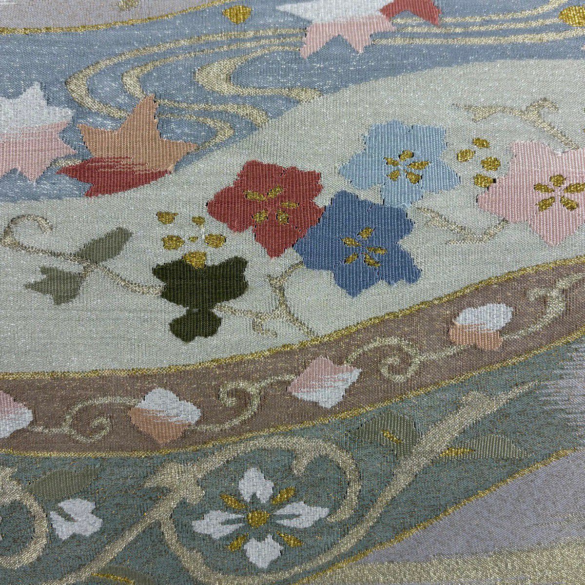 【美品】 袋帯 逸品 夏帯 花菱 金糸 箔 青灰色 六通 正絹