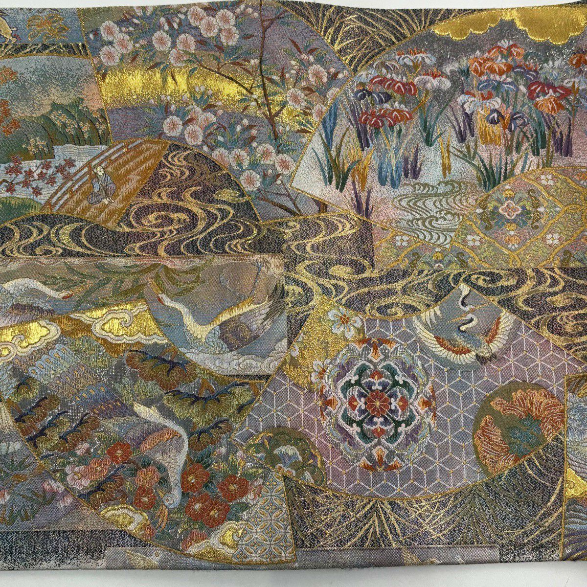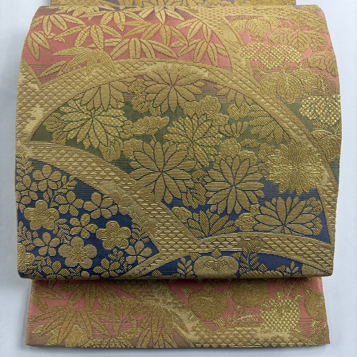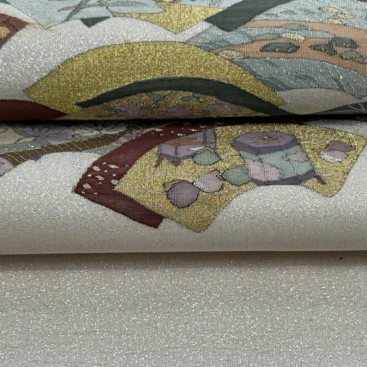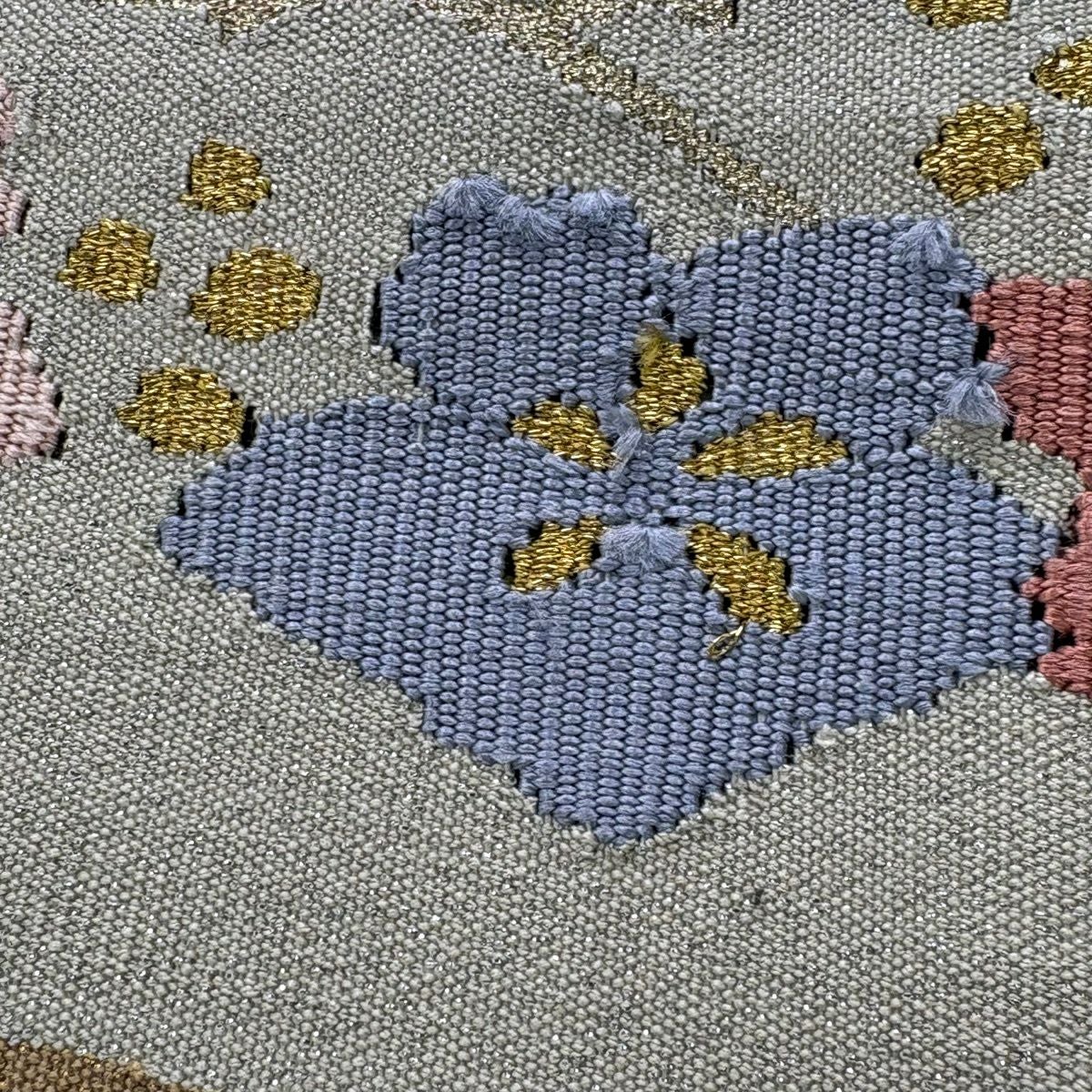 【美品】 袋帯 逸品 夏帯 花菱 金糸 箔 青灰色 六通 正絹