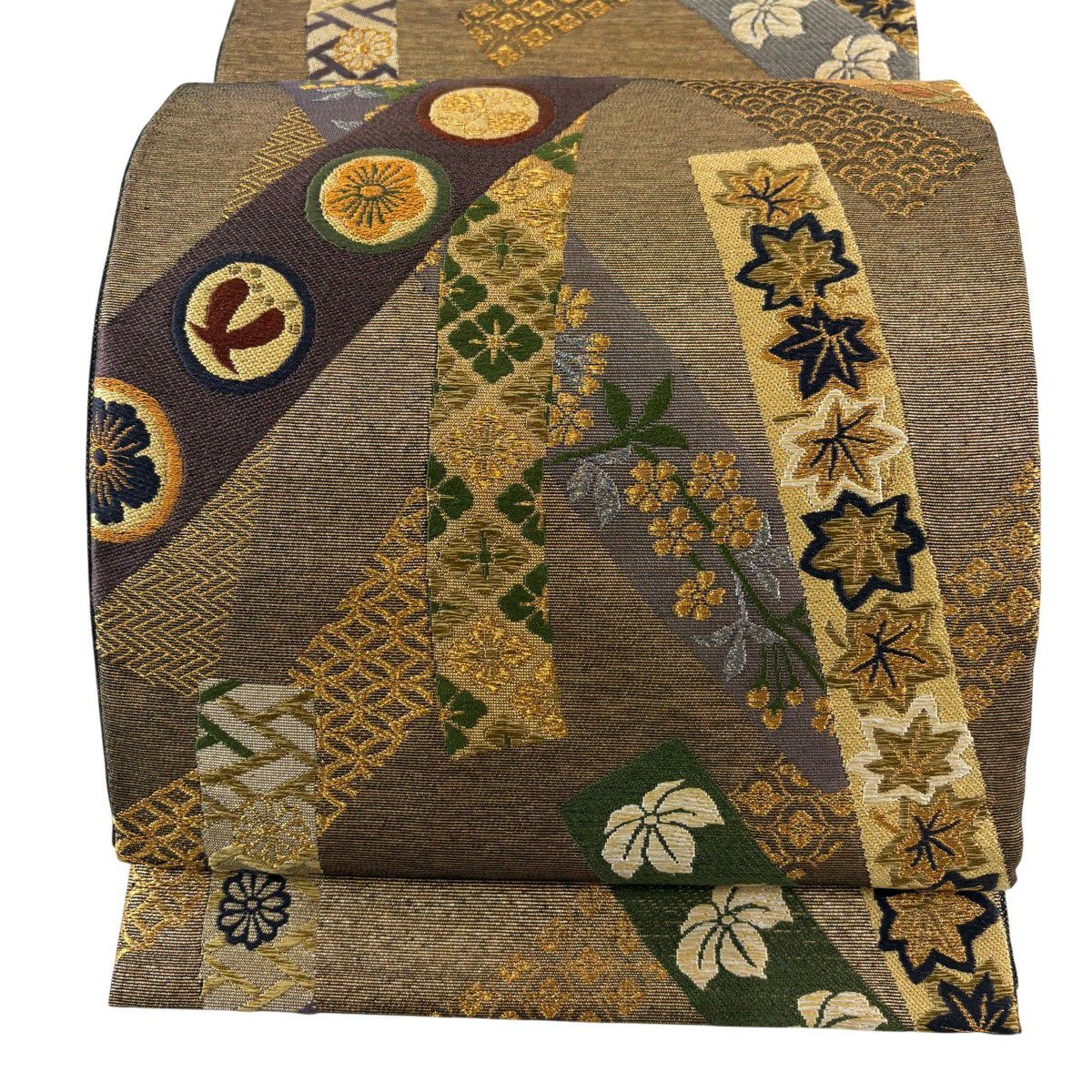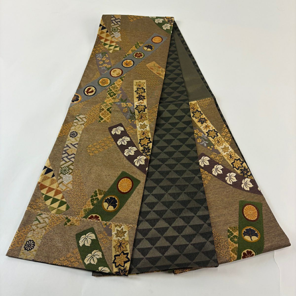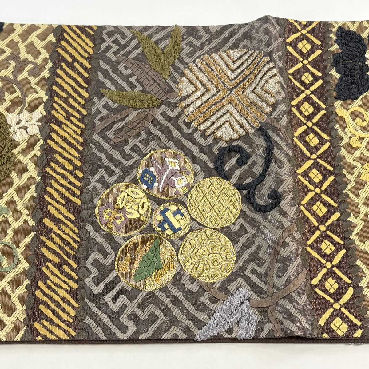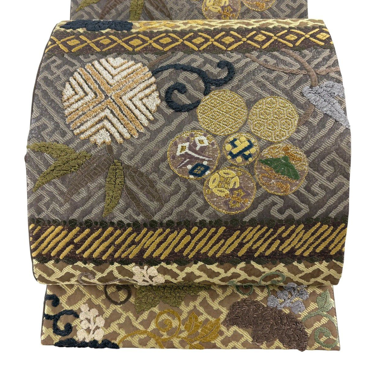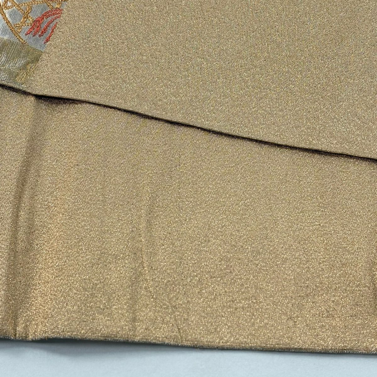 【美品】 袋帯 逸品 幾何学模様 金糸 薄茶色 お太鼓柄 正絹
