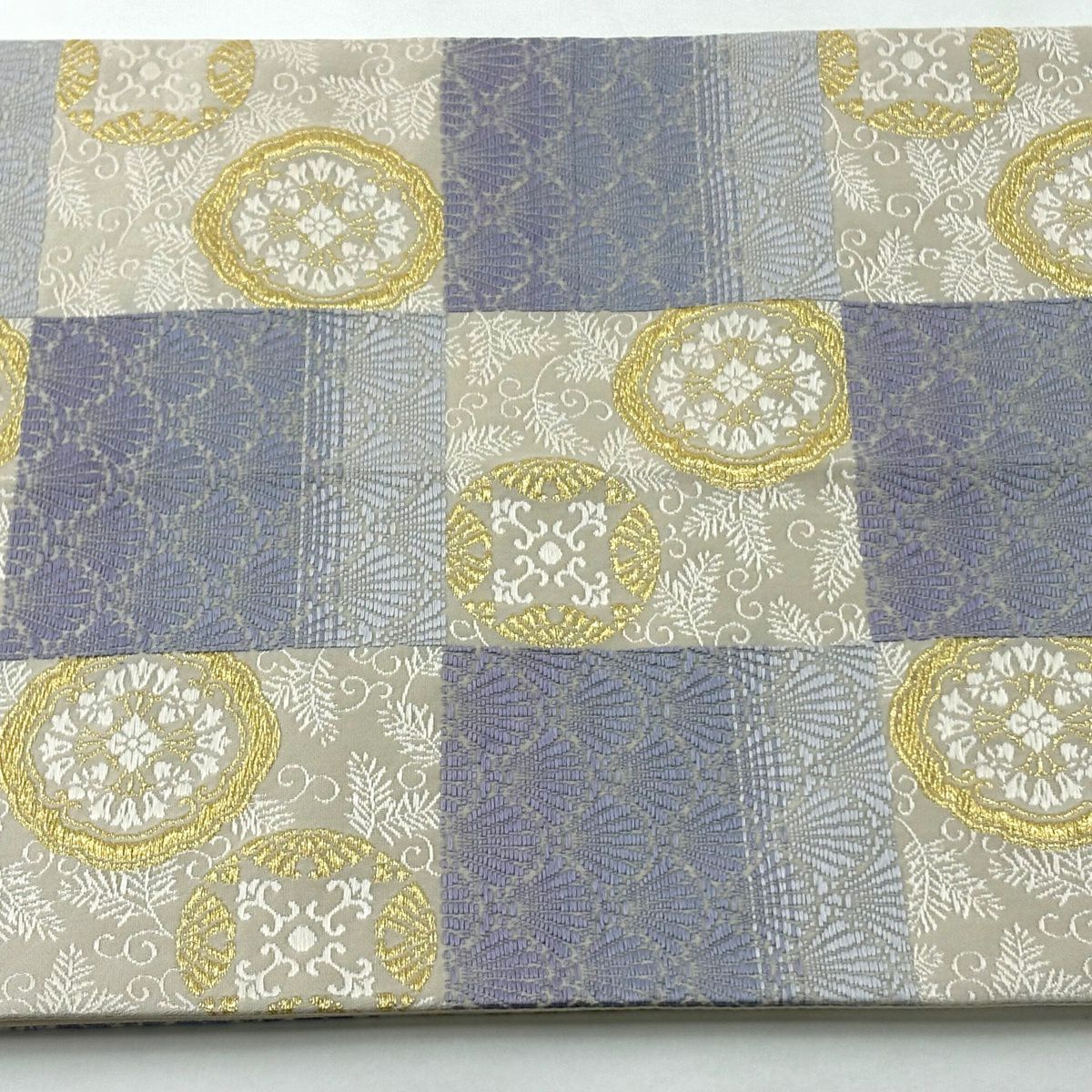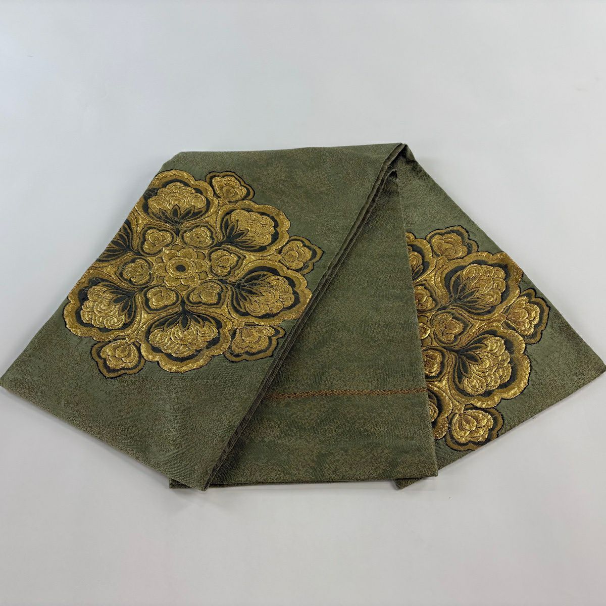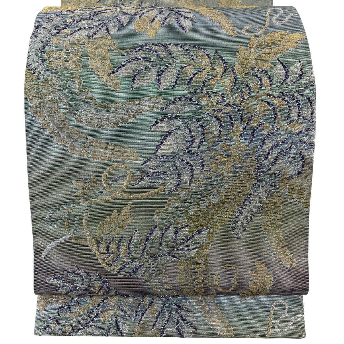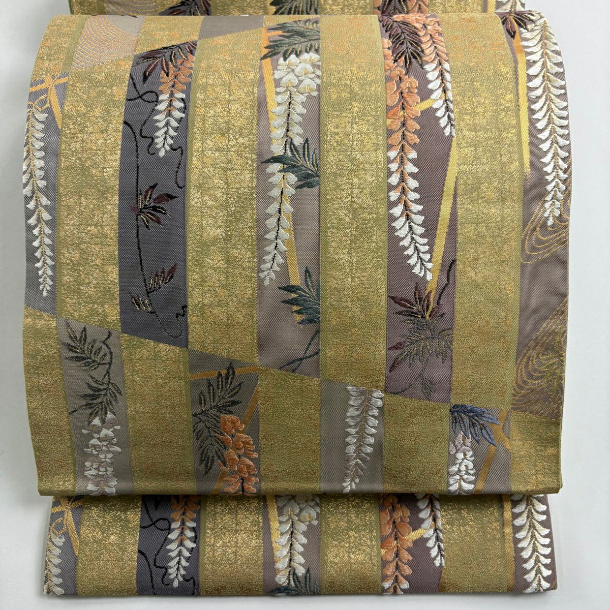 【美品】 袋帯 逸品 証紙あり 藤 格子 箔 灰緑 六通 正絹