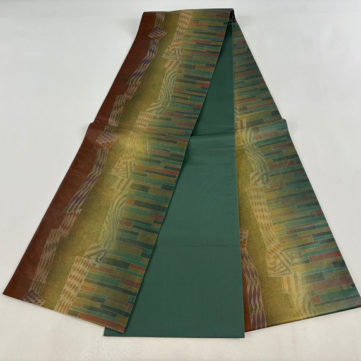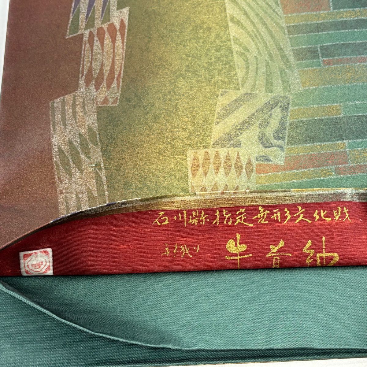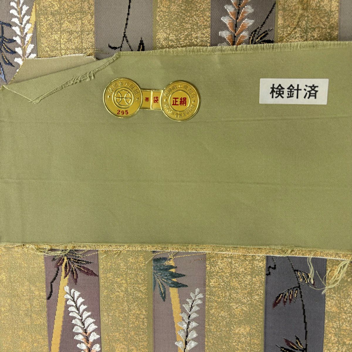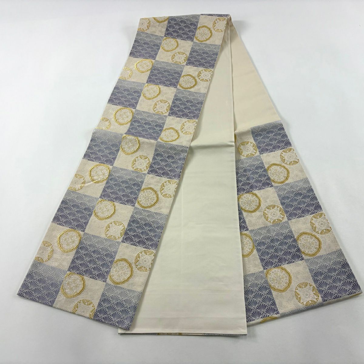【美品】 袋帯 逸品 証紙あり 藤 格子 箔 灰緑 六通 正絹