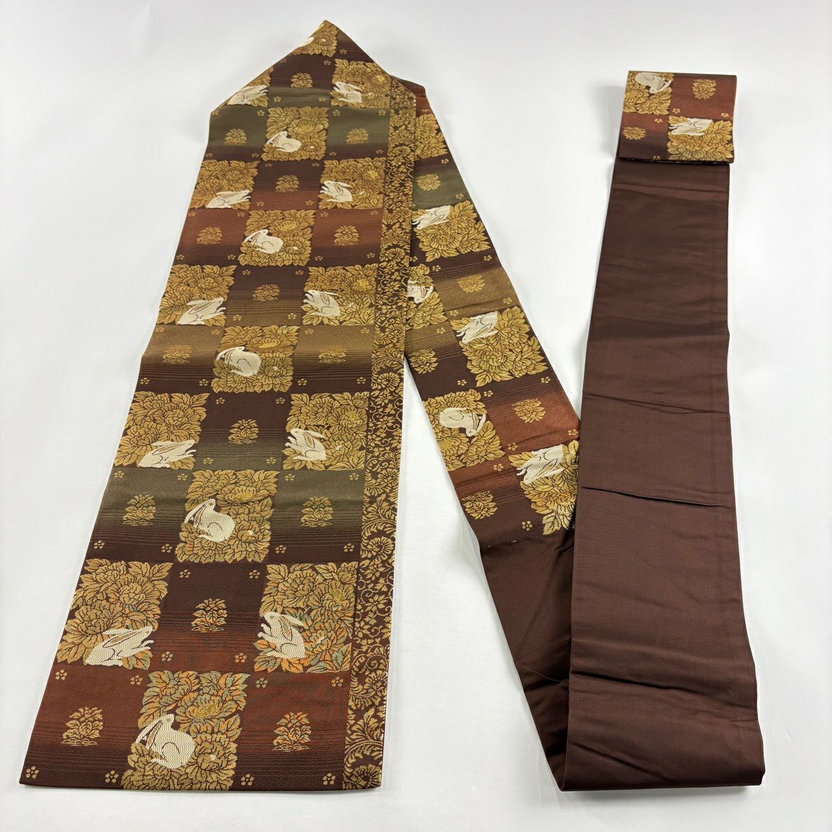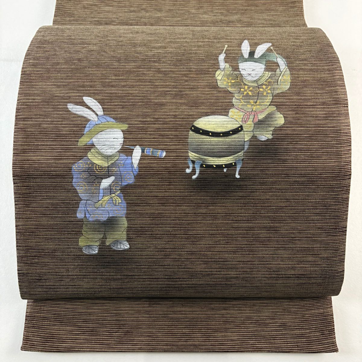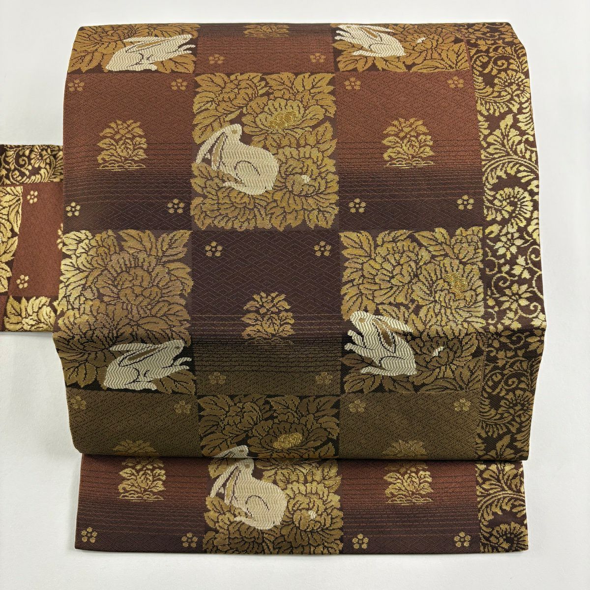 【美品】 袋帯 逸品 うさぎ 太鼓 金彩 灰茶 お太鼓柄 正絹
