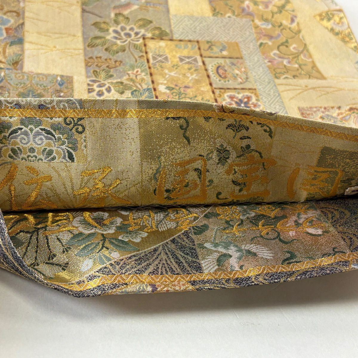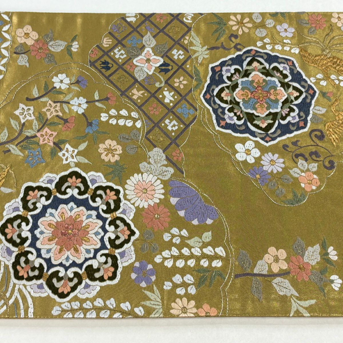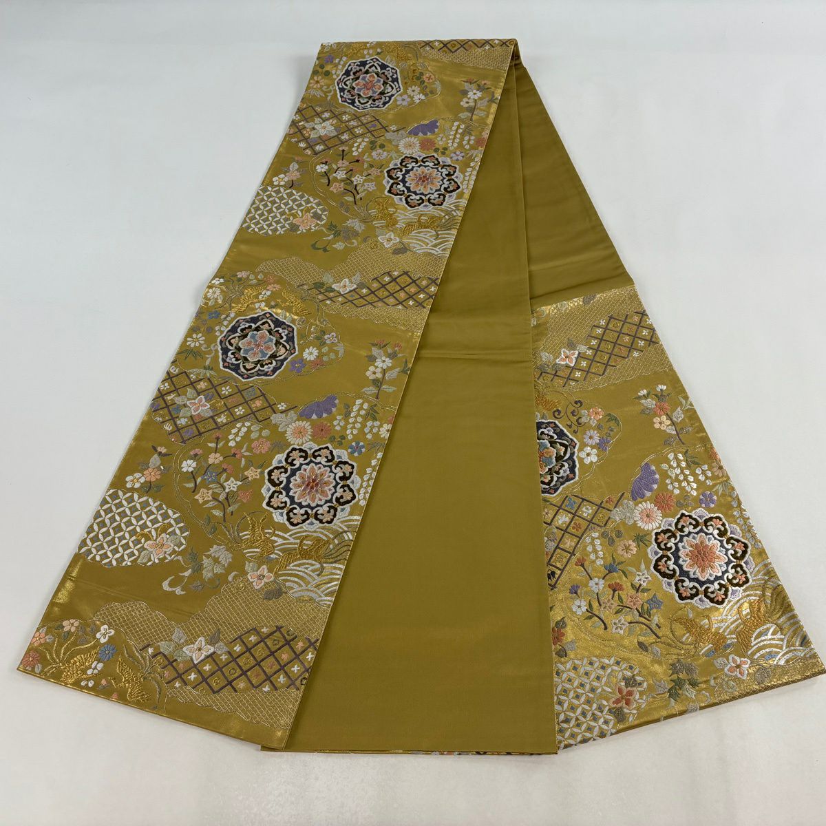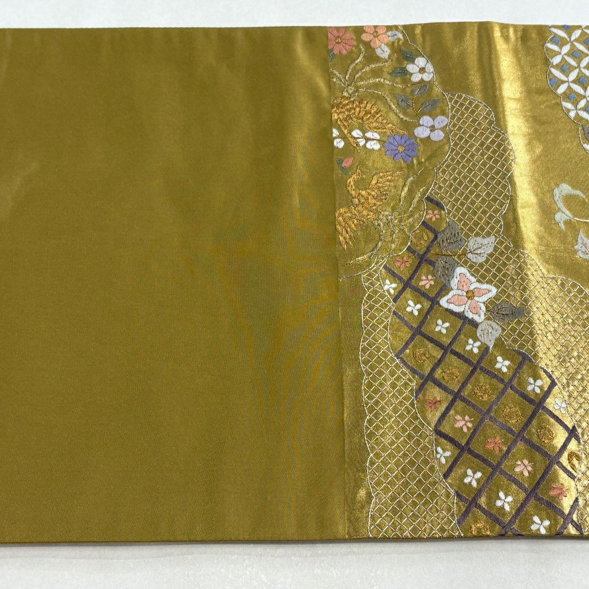 【美品】 袋帯 逸品 華文 花鳥 刺繍 金銀糸 金色 六通 正絹
