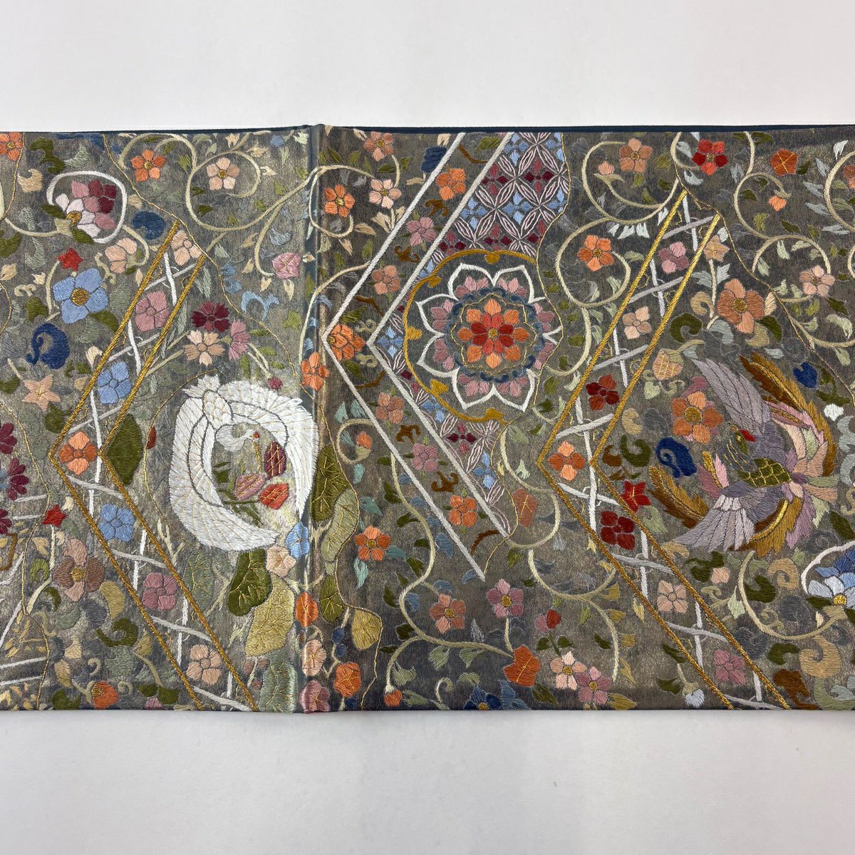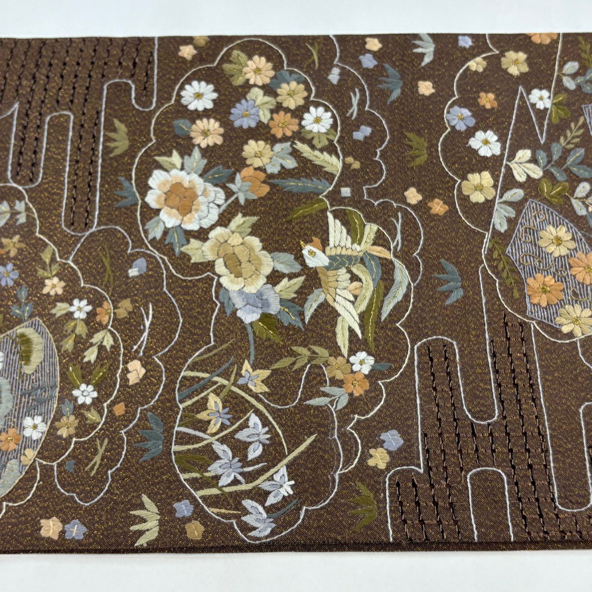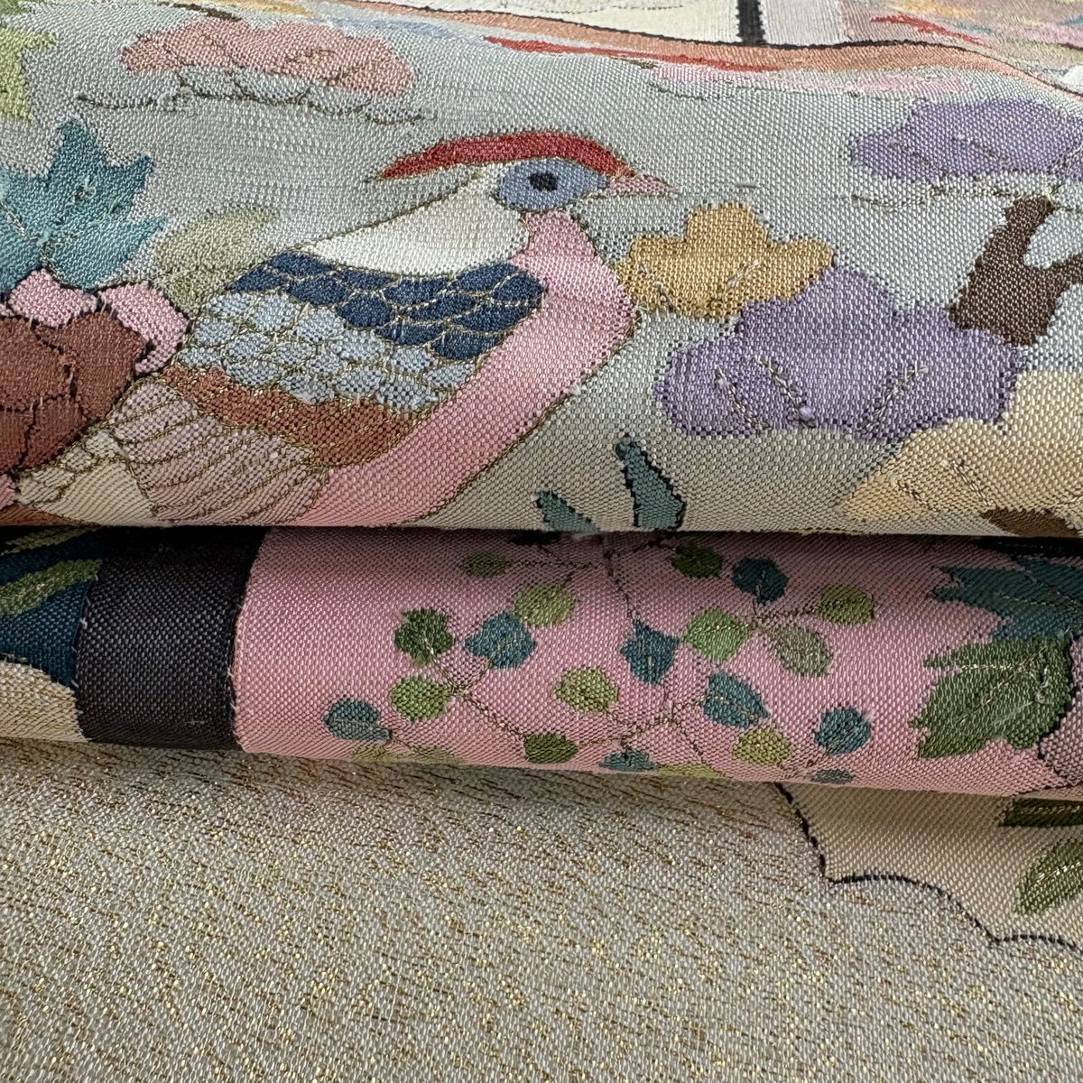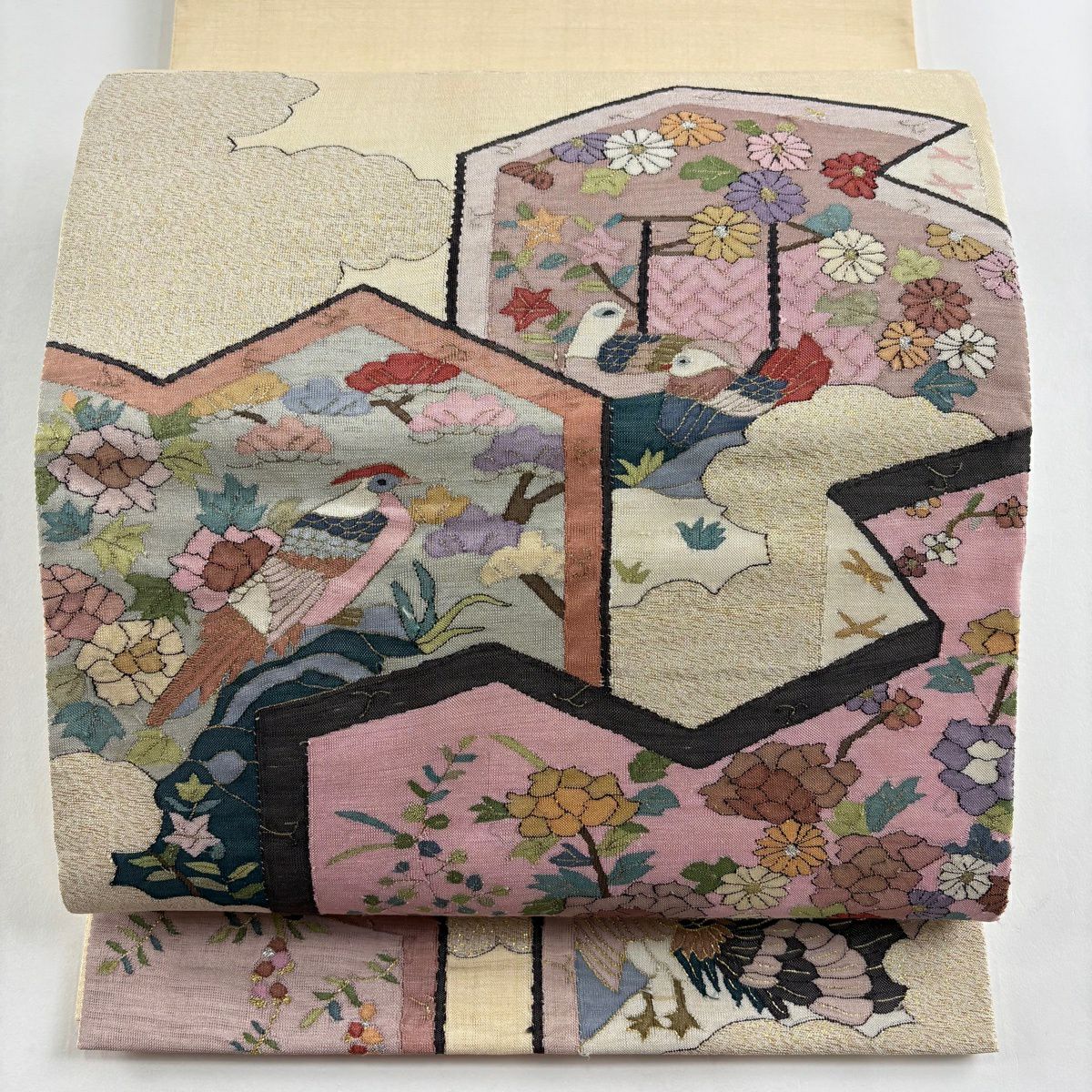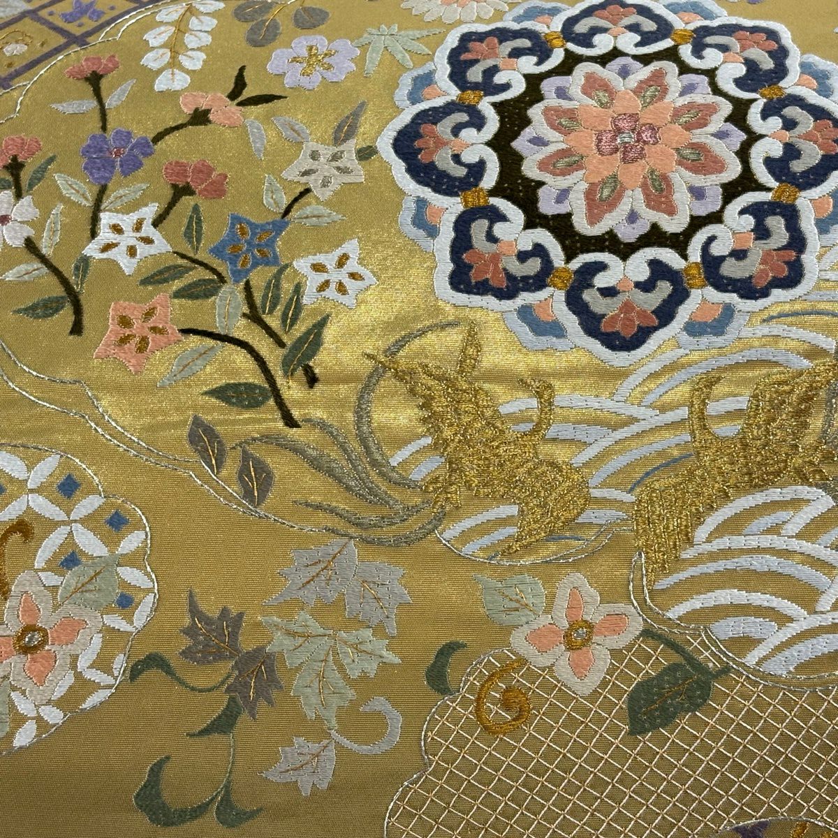 【美品】 袋帯 逸品 華文 花鳥 刺繍 金銀糸 金色 六通 正絹