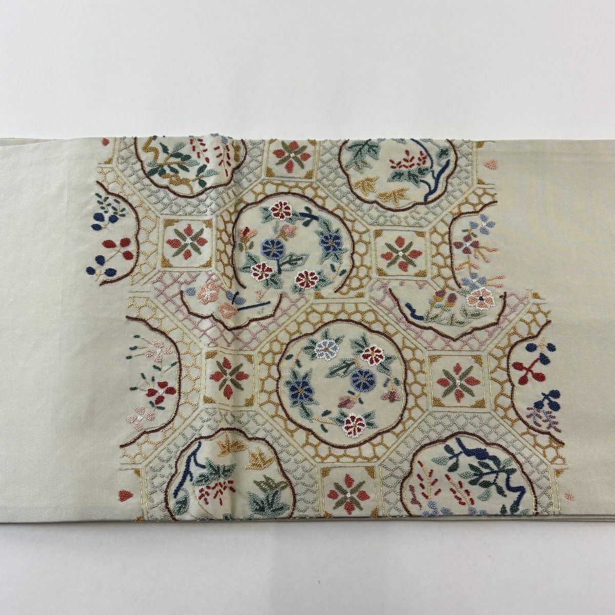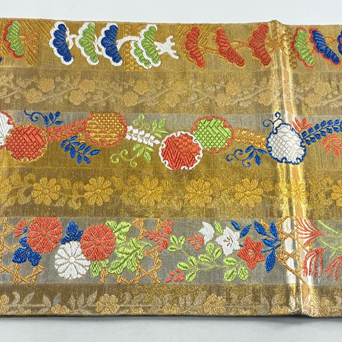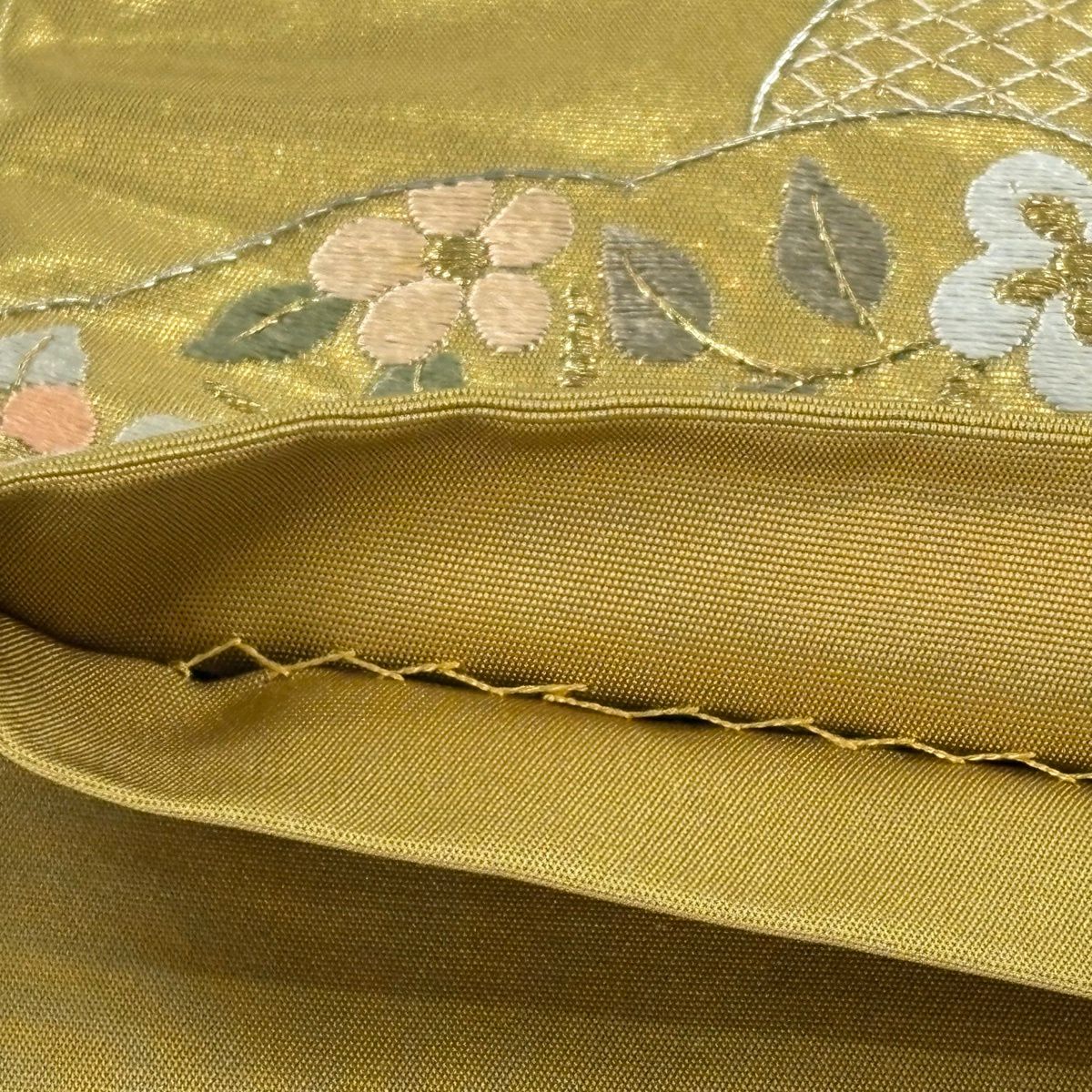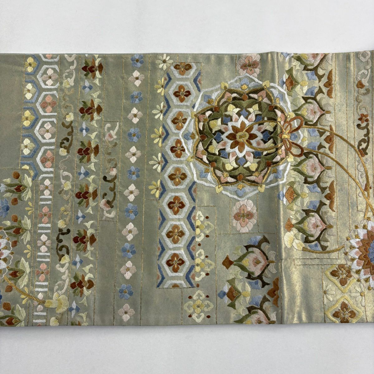 【美品】 袋帯 逸品 鏡裏文 草花 刺繍 金糸 金色 六通 正絹