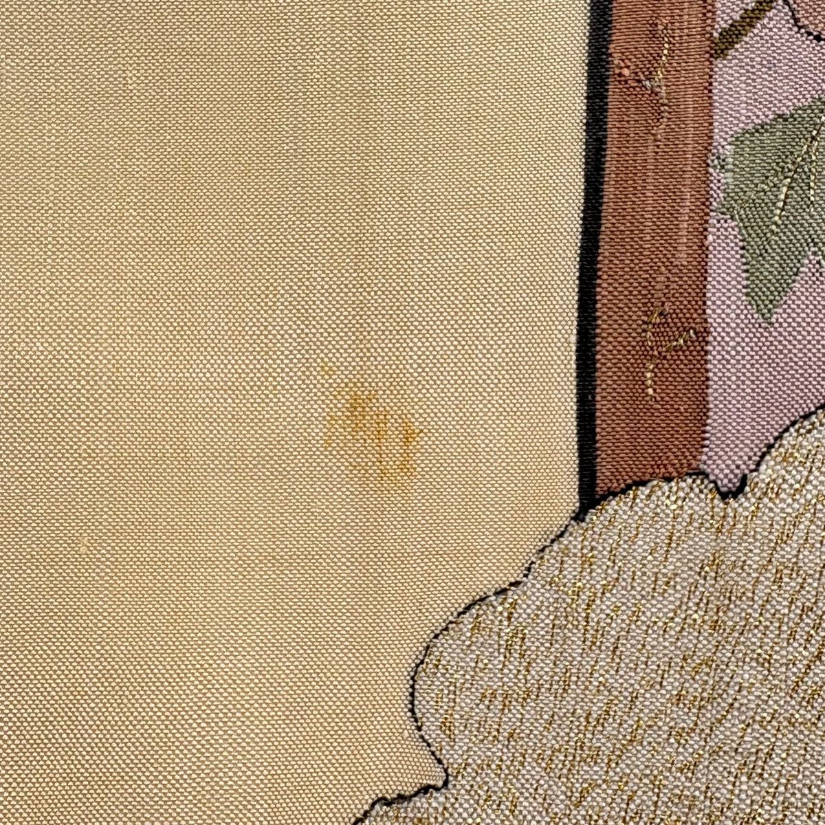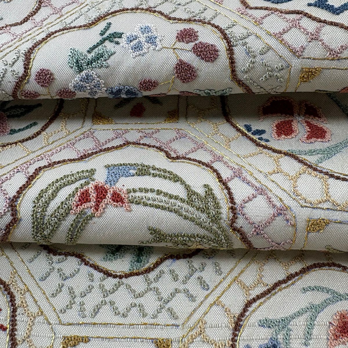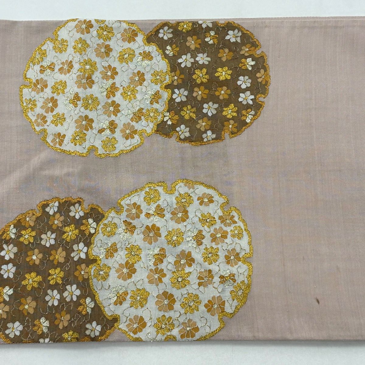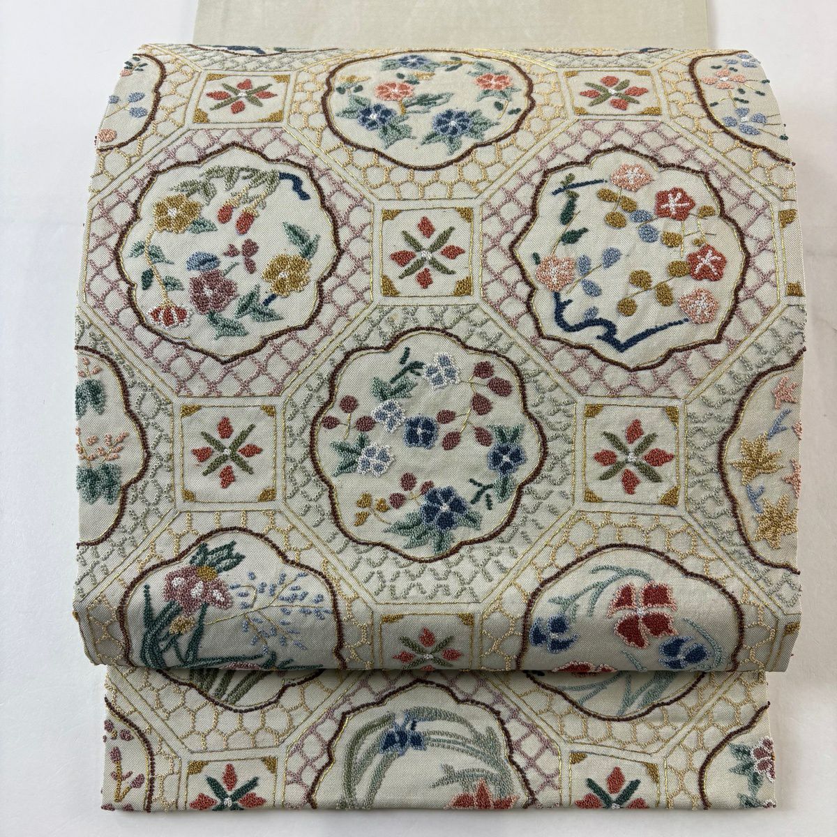 【美品】 袋帯 逸品 鏡裏文 草花 刺繍 金糸 金色 六通 正絹