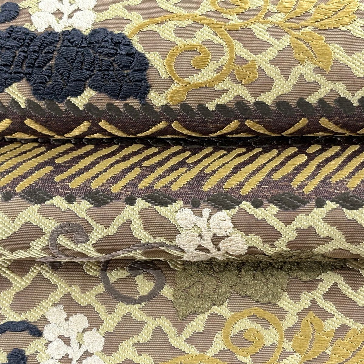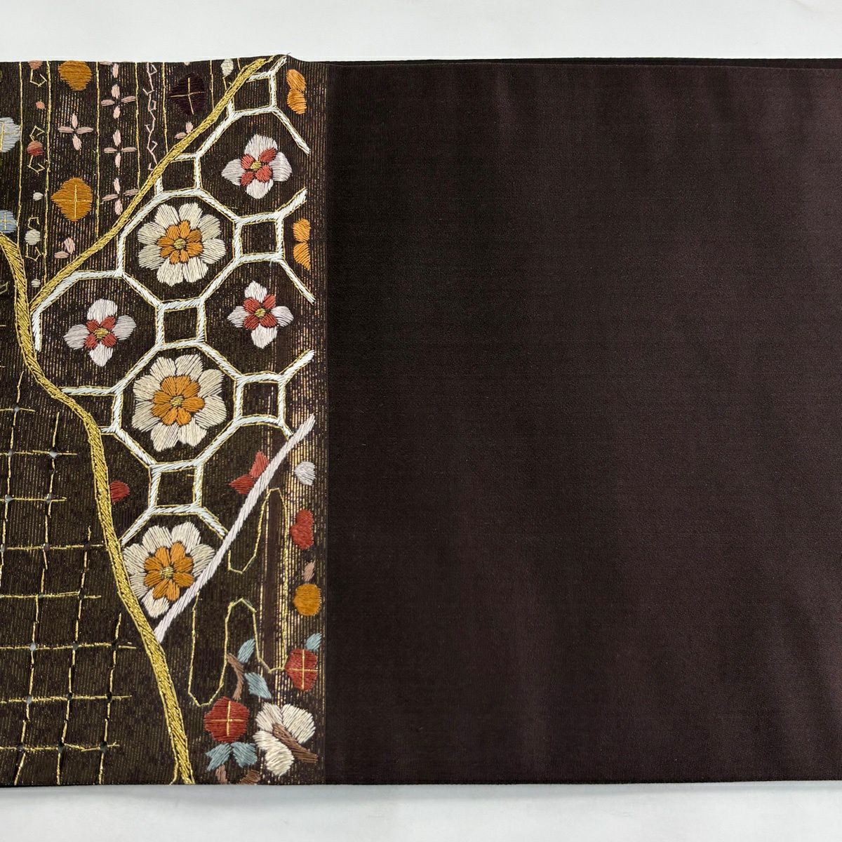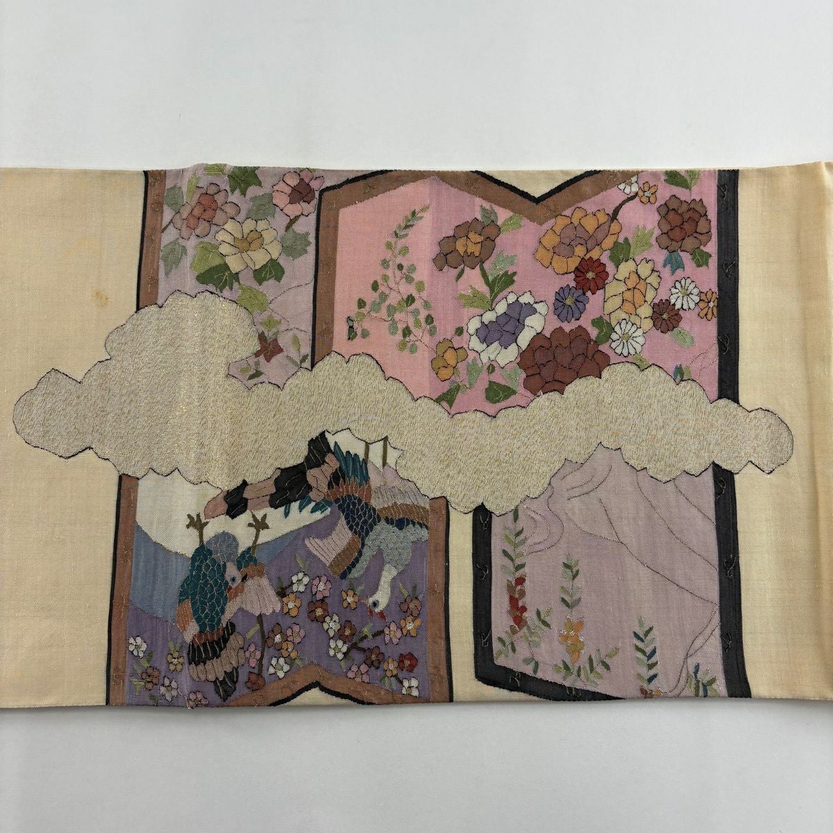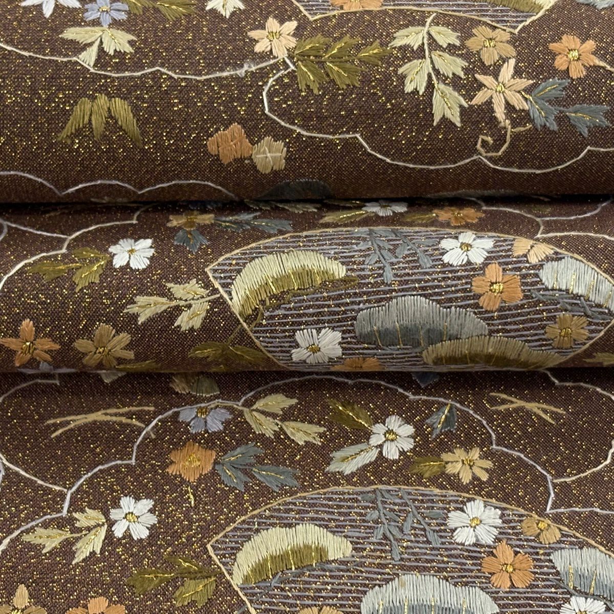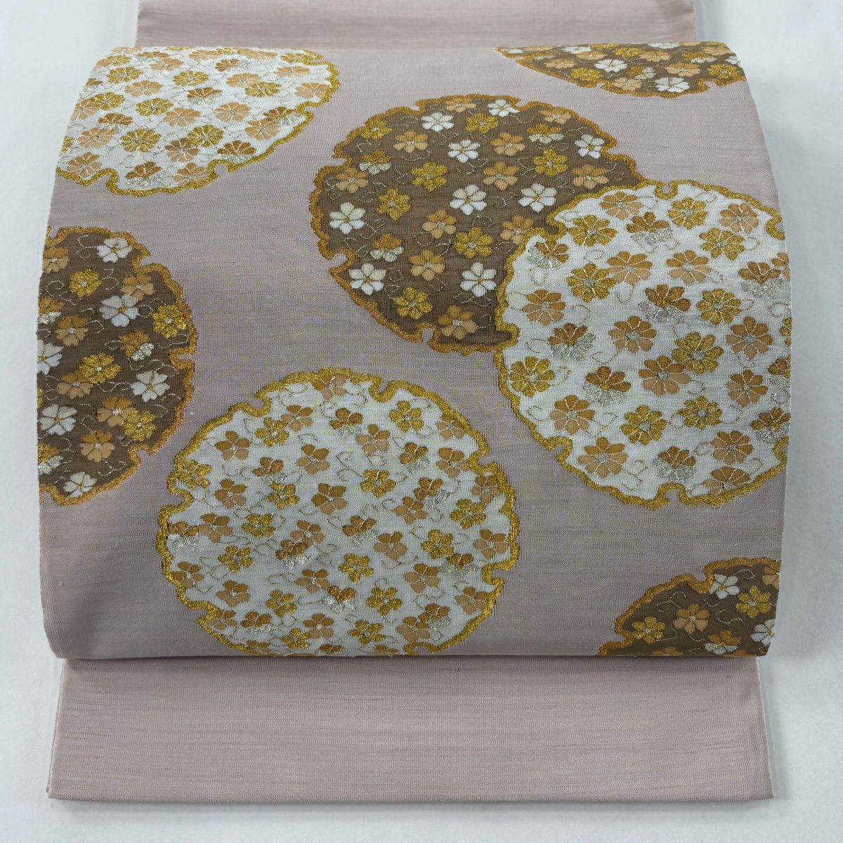 【美品】 袋帯 逸品 鏡裏文 草花 刺繍 金糸 金色 六通 正絹