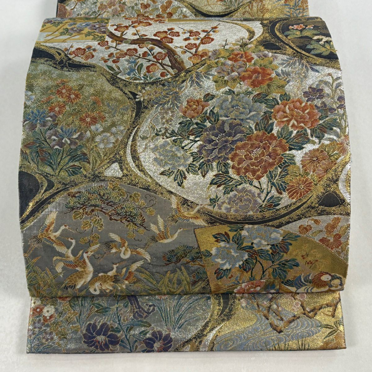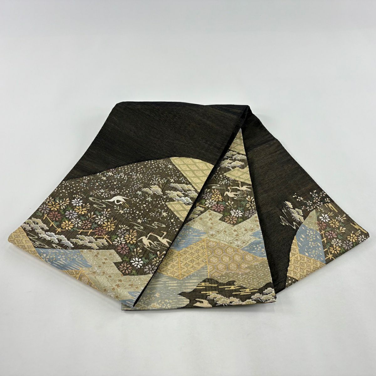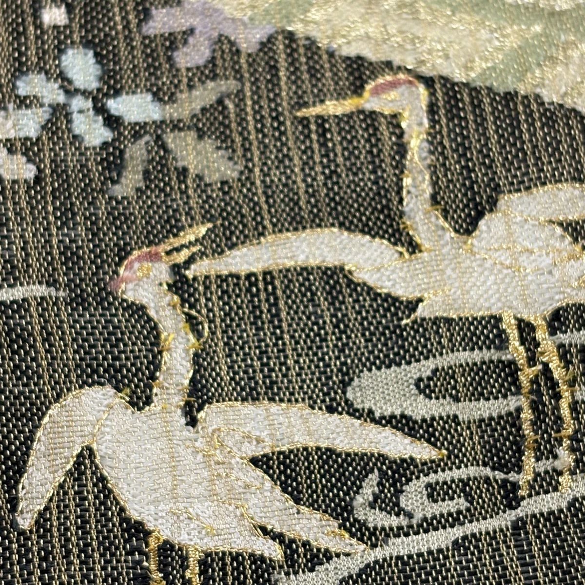 【美品】 袋帯 逸品 鶴 松 金銀糸 綴れ 黒 お太鼓柄 正絹