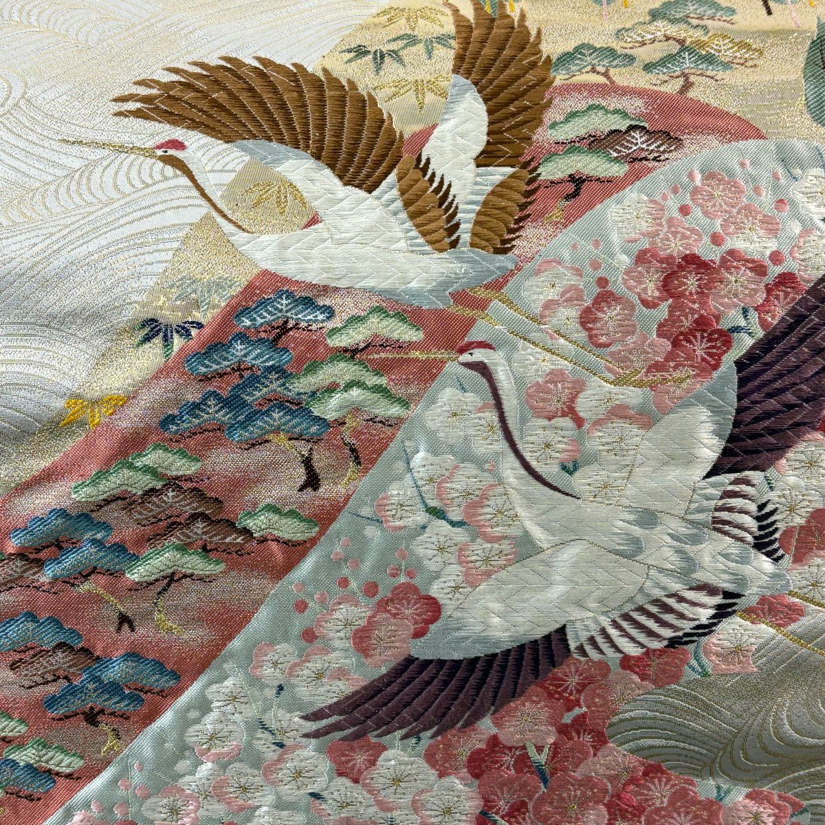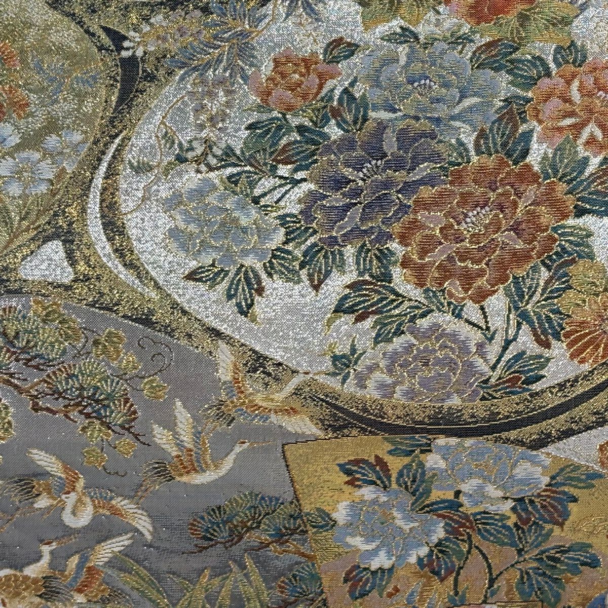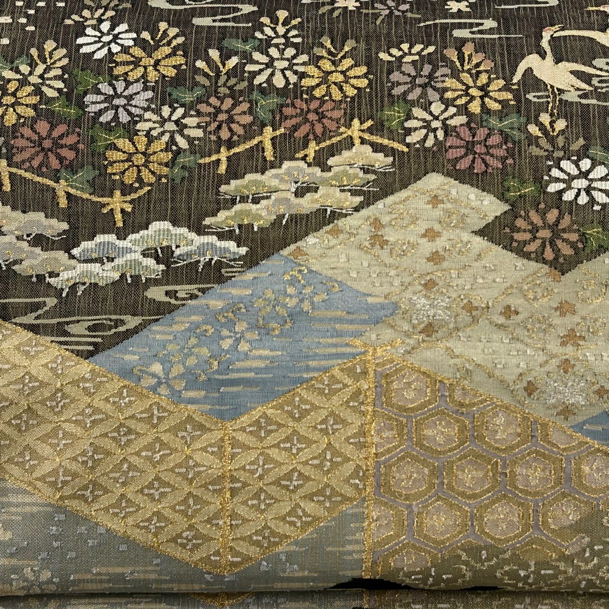 【美品】 袋帯 逸品 鶴 松 金銀糸 綴れ 黒 お太鼓柄 正絹