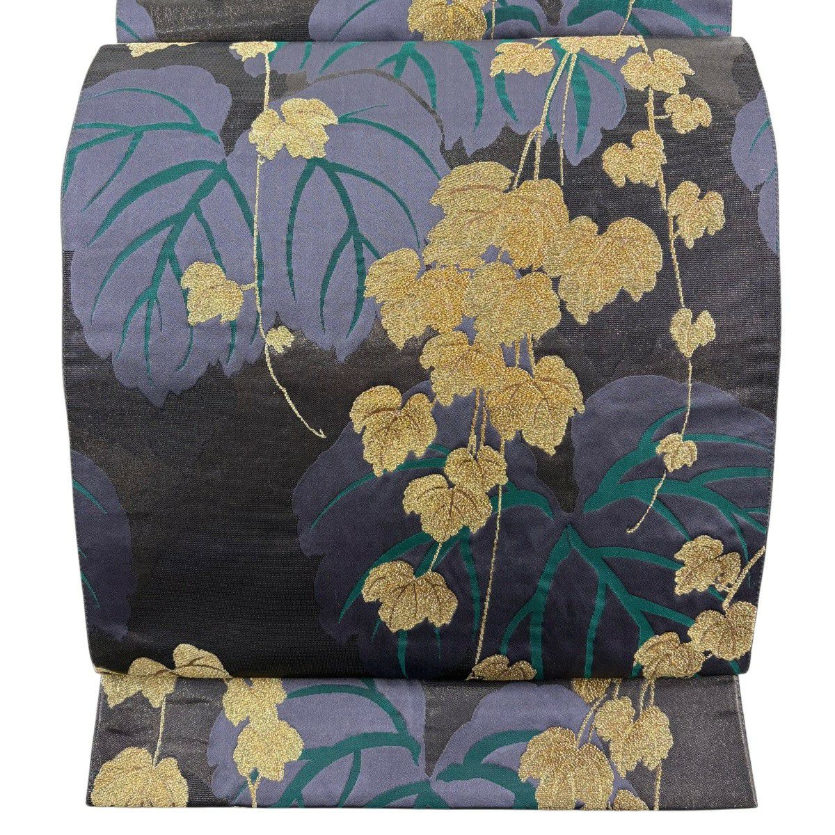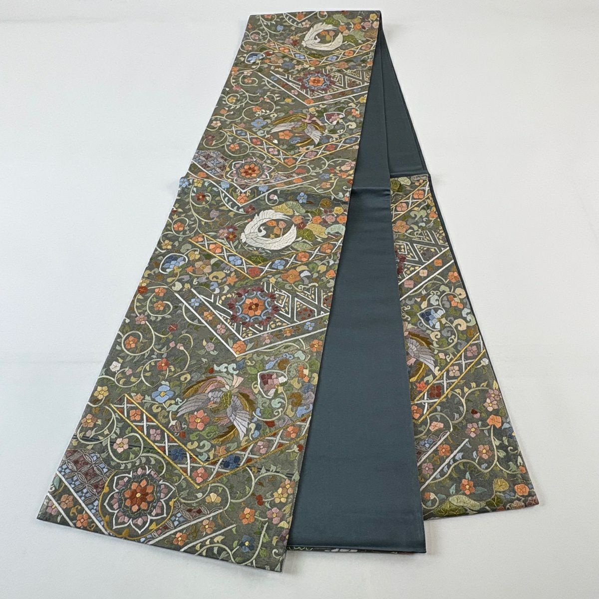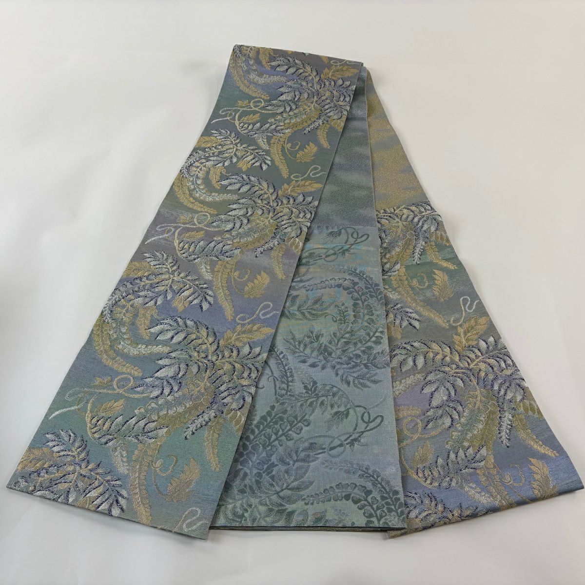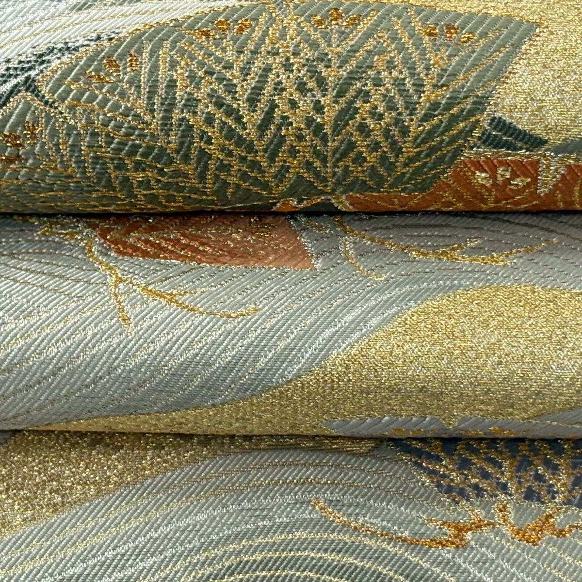 【美品】 袋帯 逸品 草花 唐草 金糸 箔 青灰色 六通 正絹