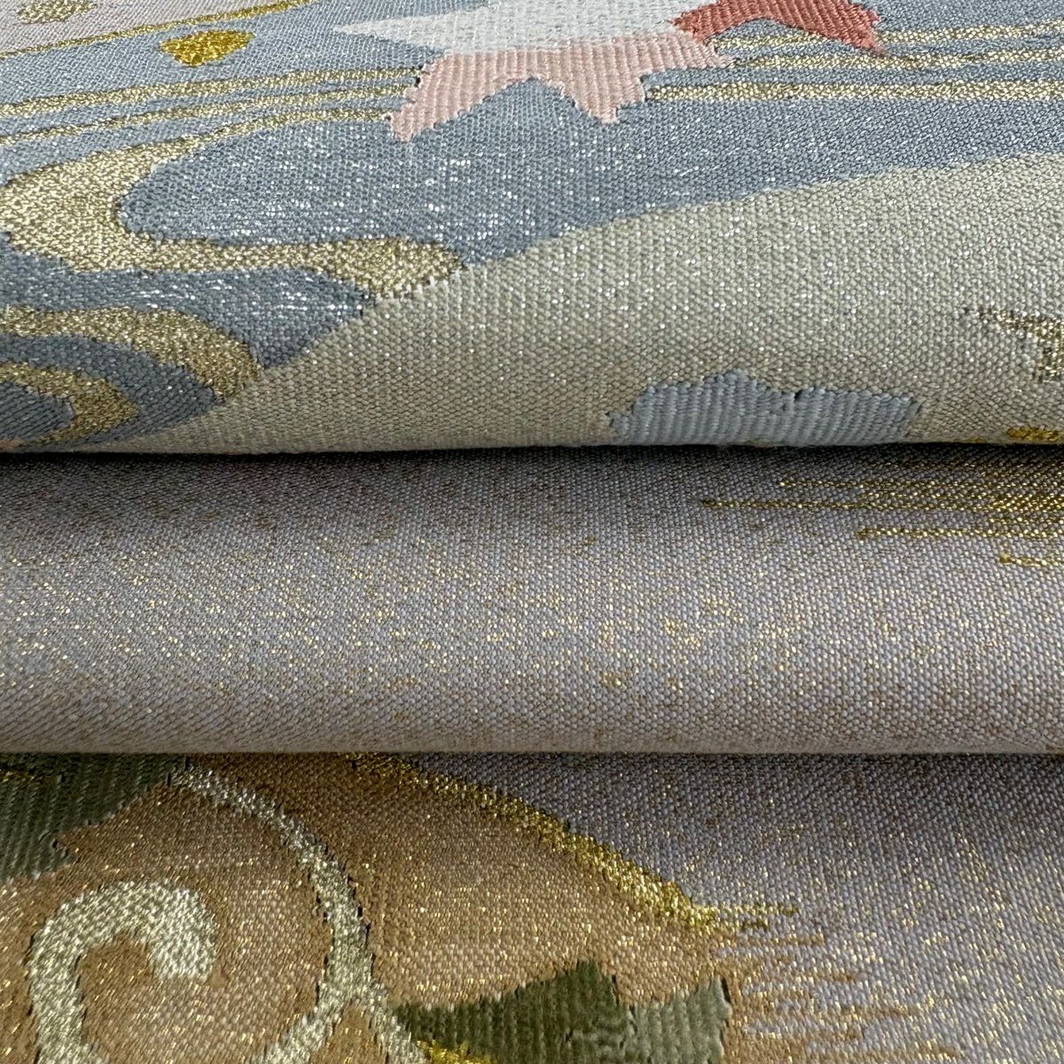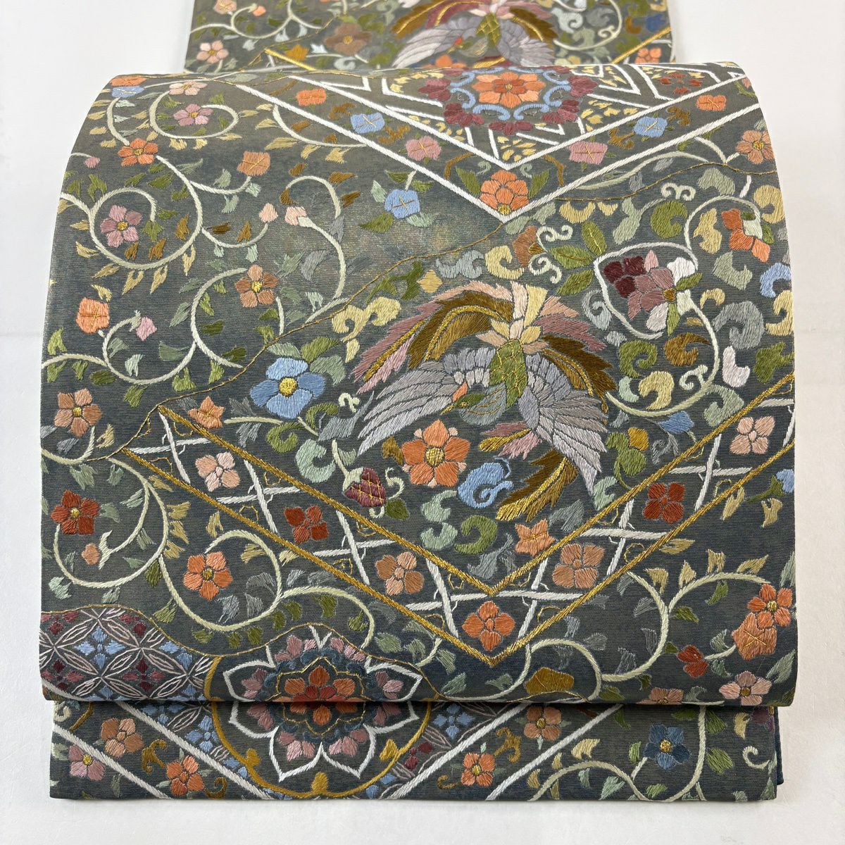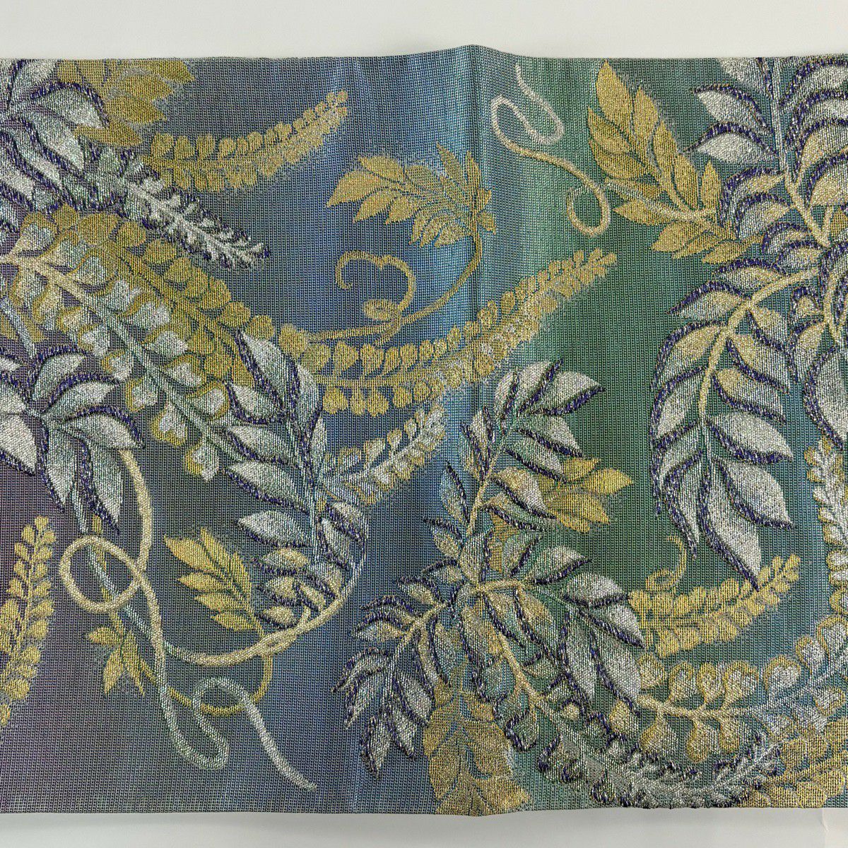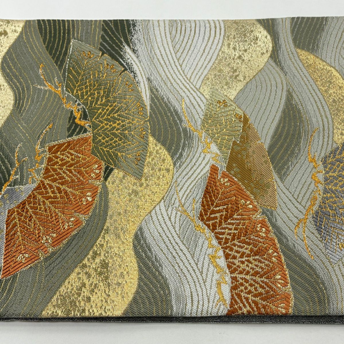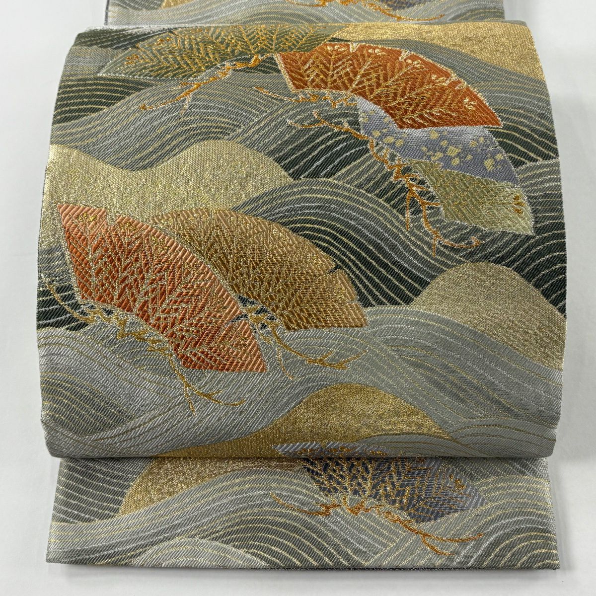 【美品】 袋帯 逸品 草花 唐草 金糸 箔 青灰色 六通 正絹