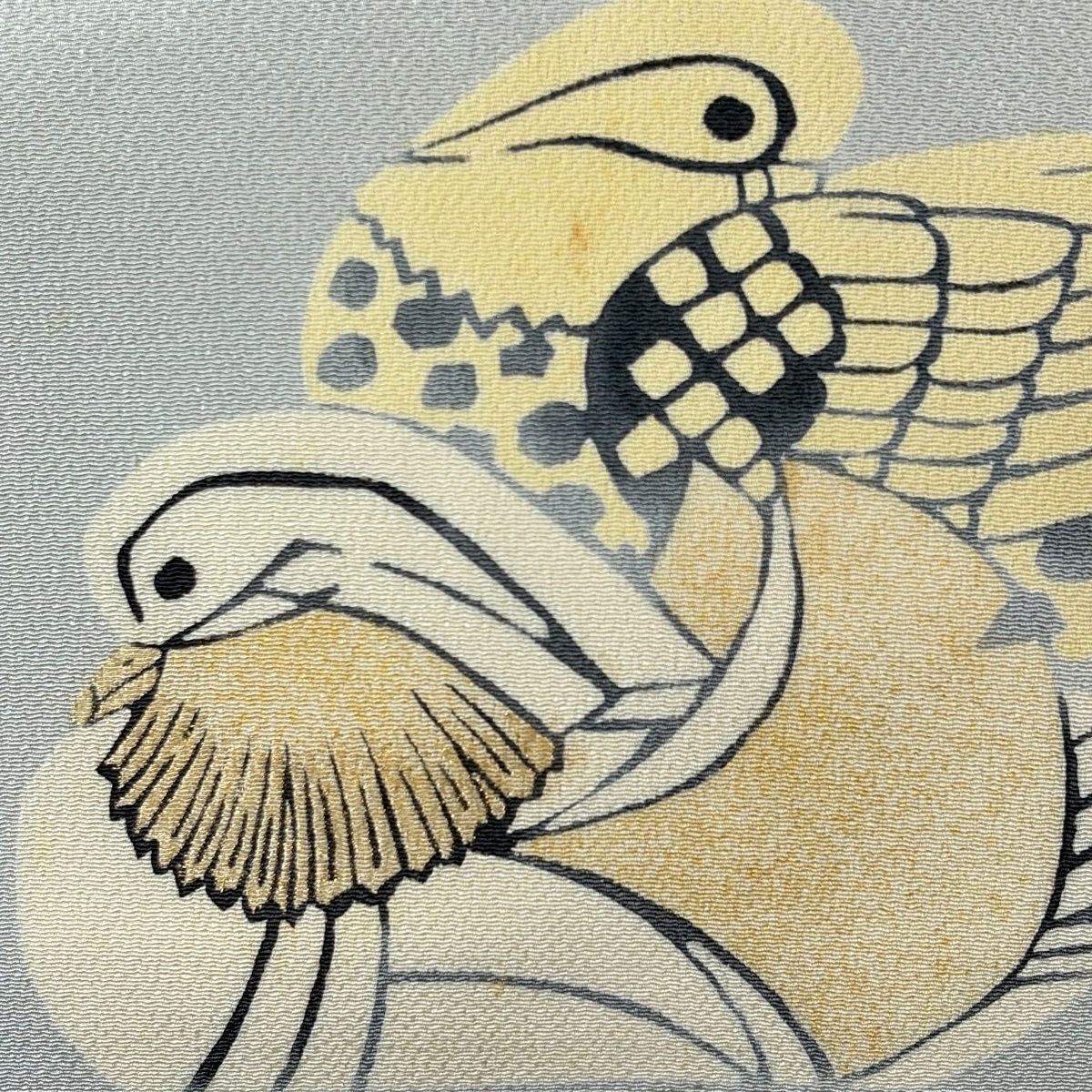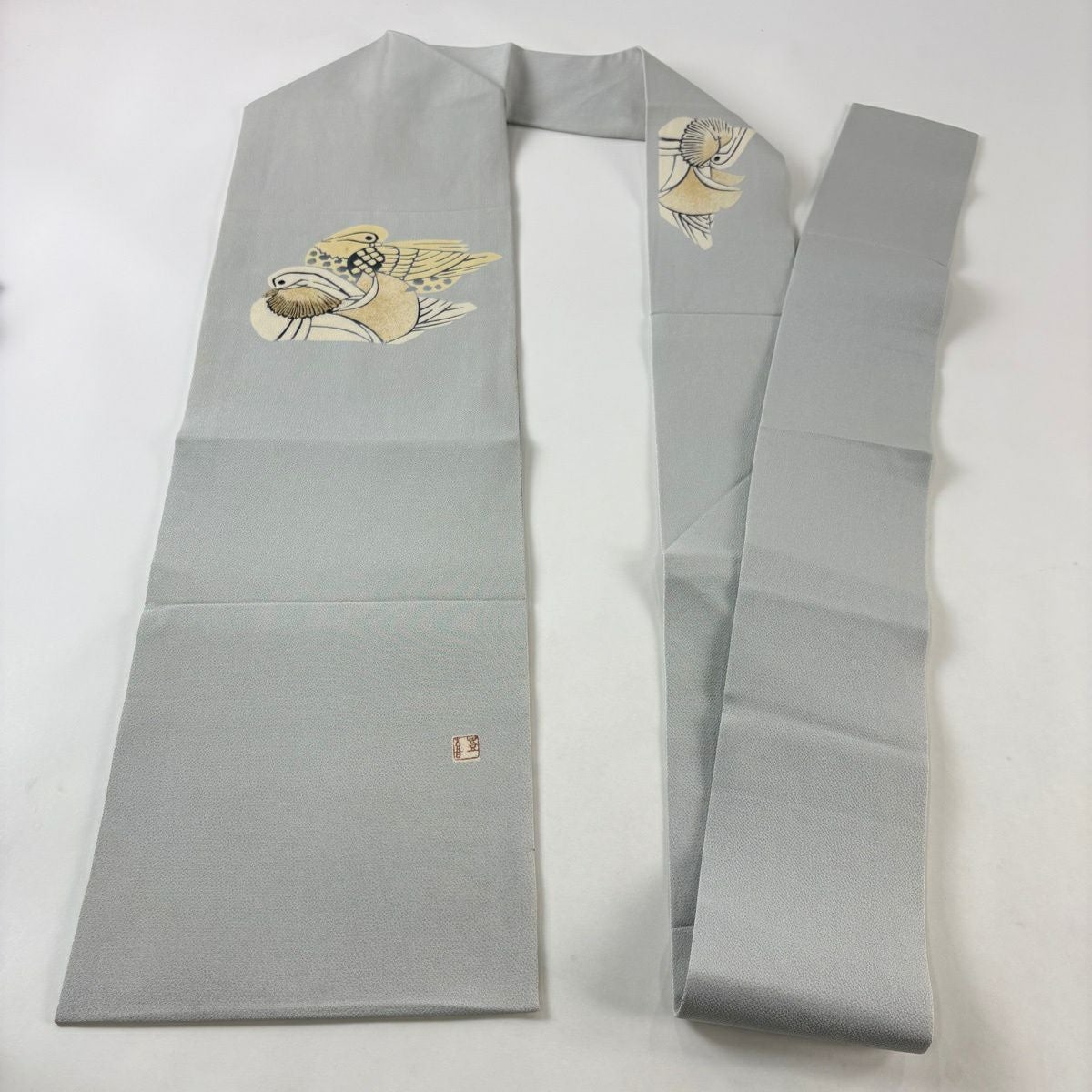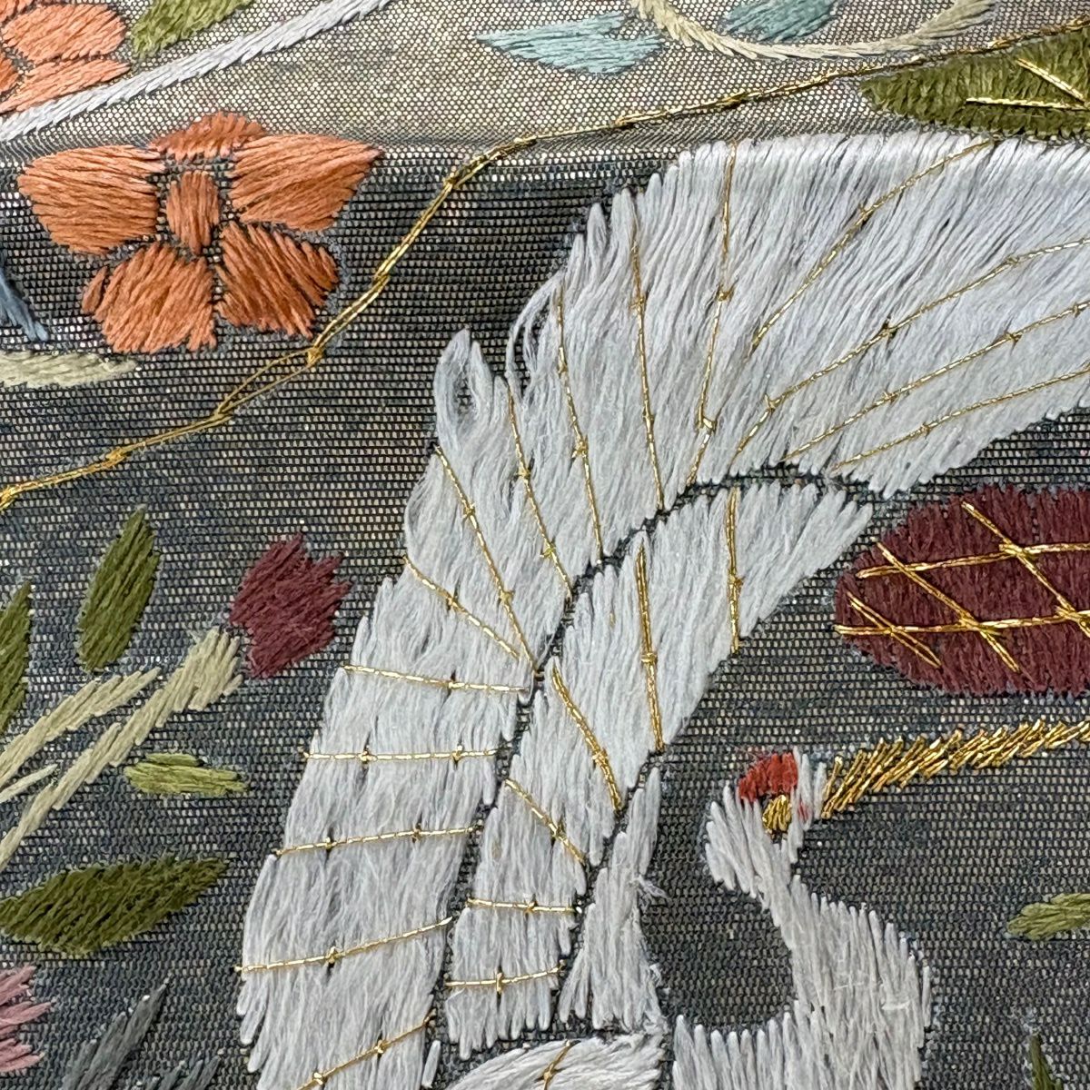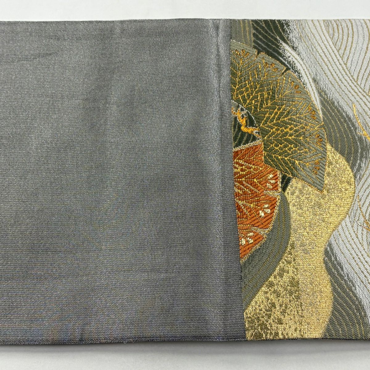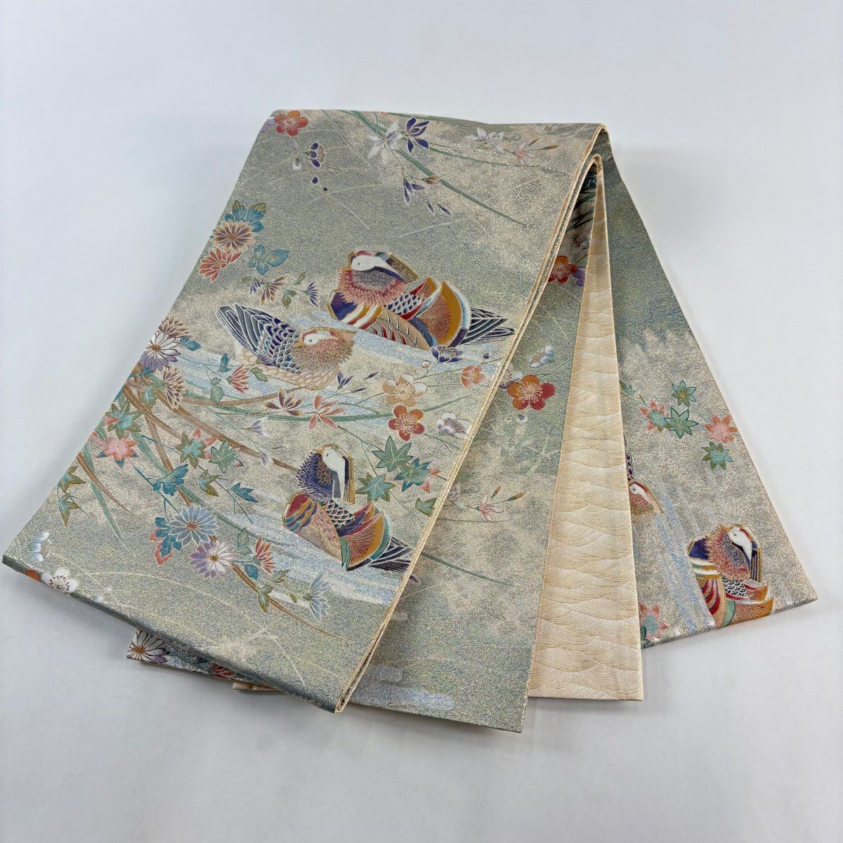 名古屋帯 逸品 羽田登喜 落款あり 鴛鴦 金糸 金彩 灰色 正絹