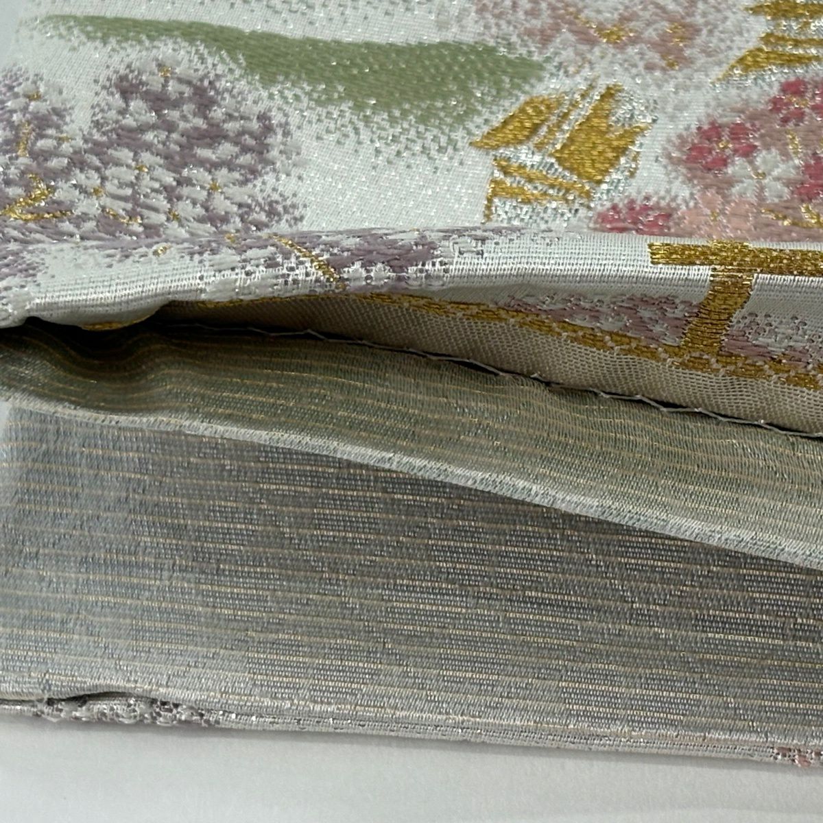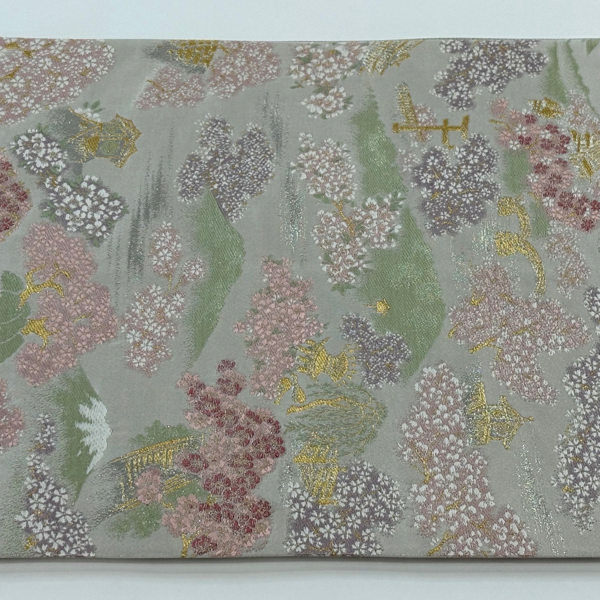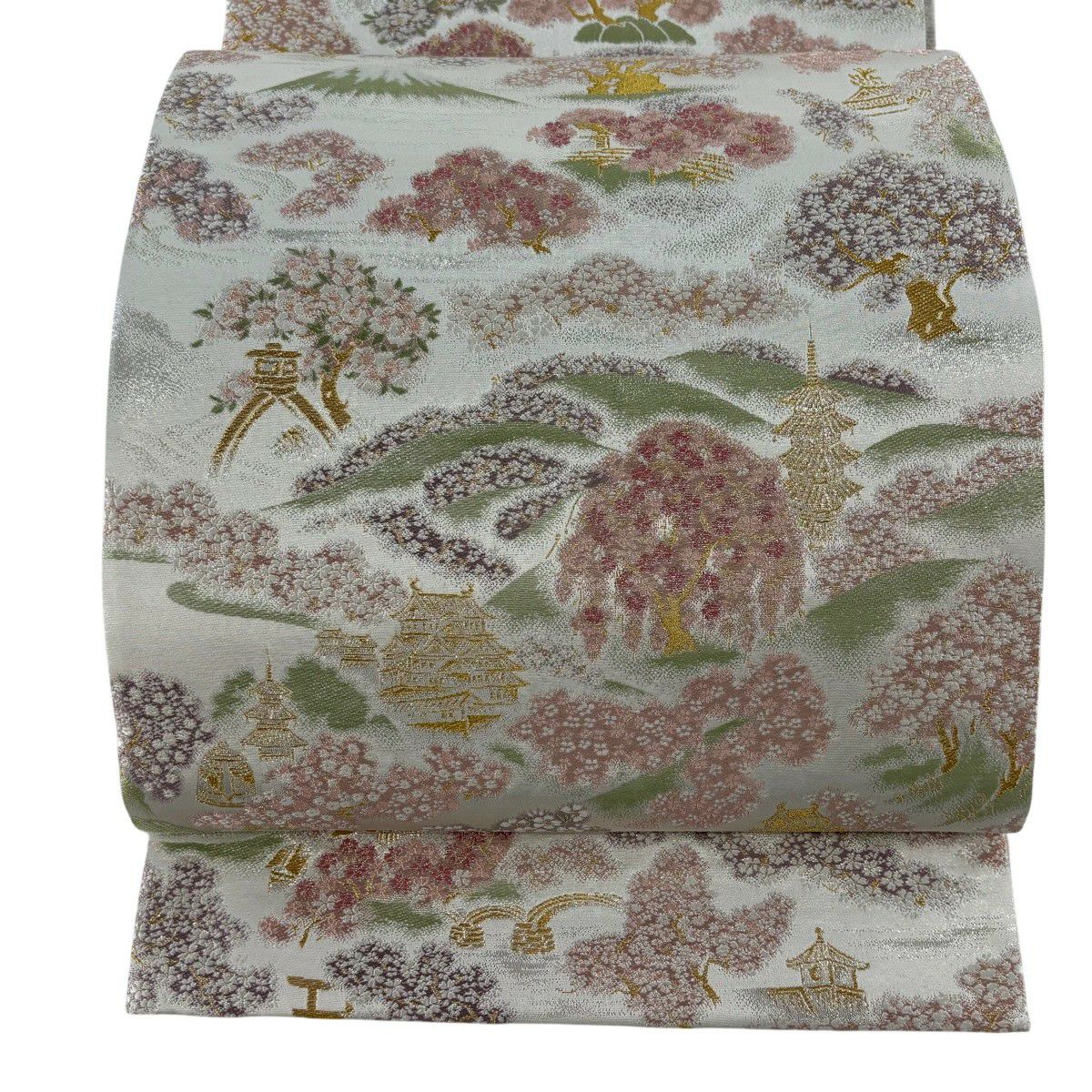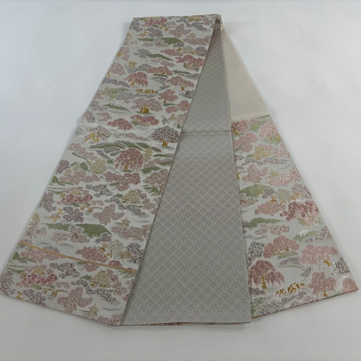【美品】 袋帯 逸品 富士山 桜 金銀糸 箔 灰白 六通 正絹