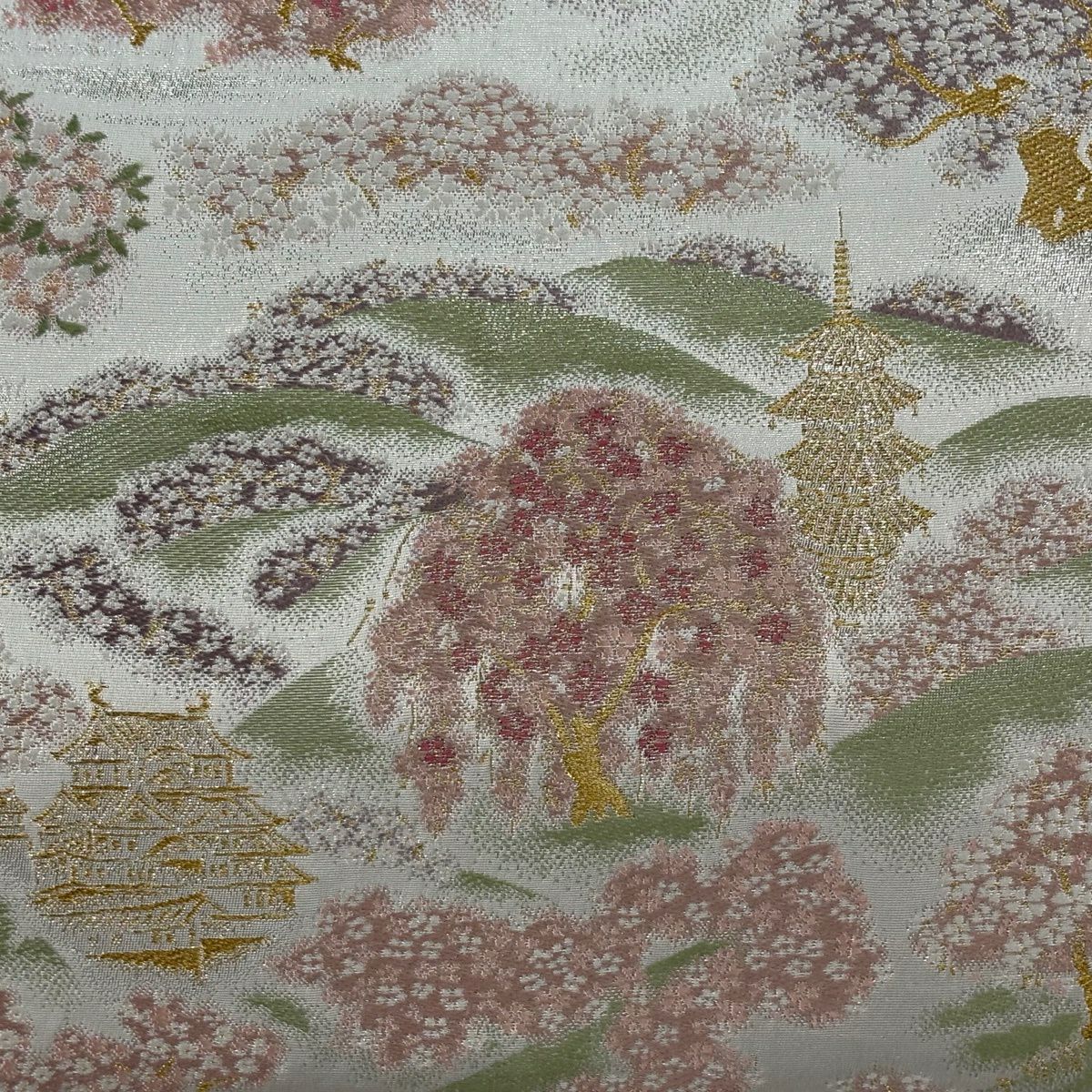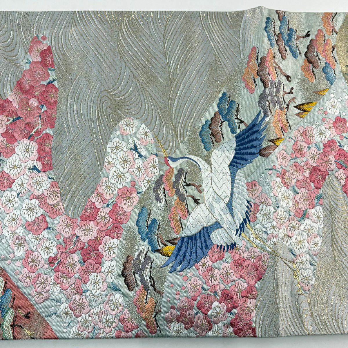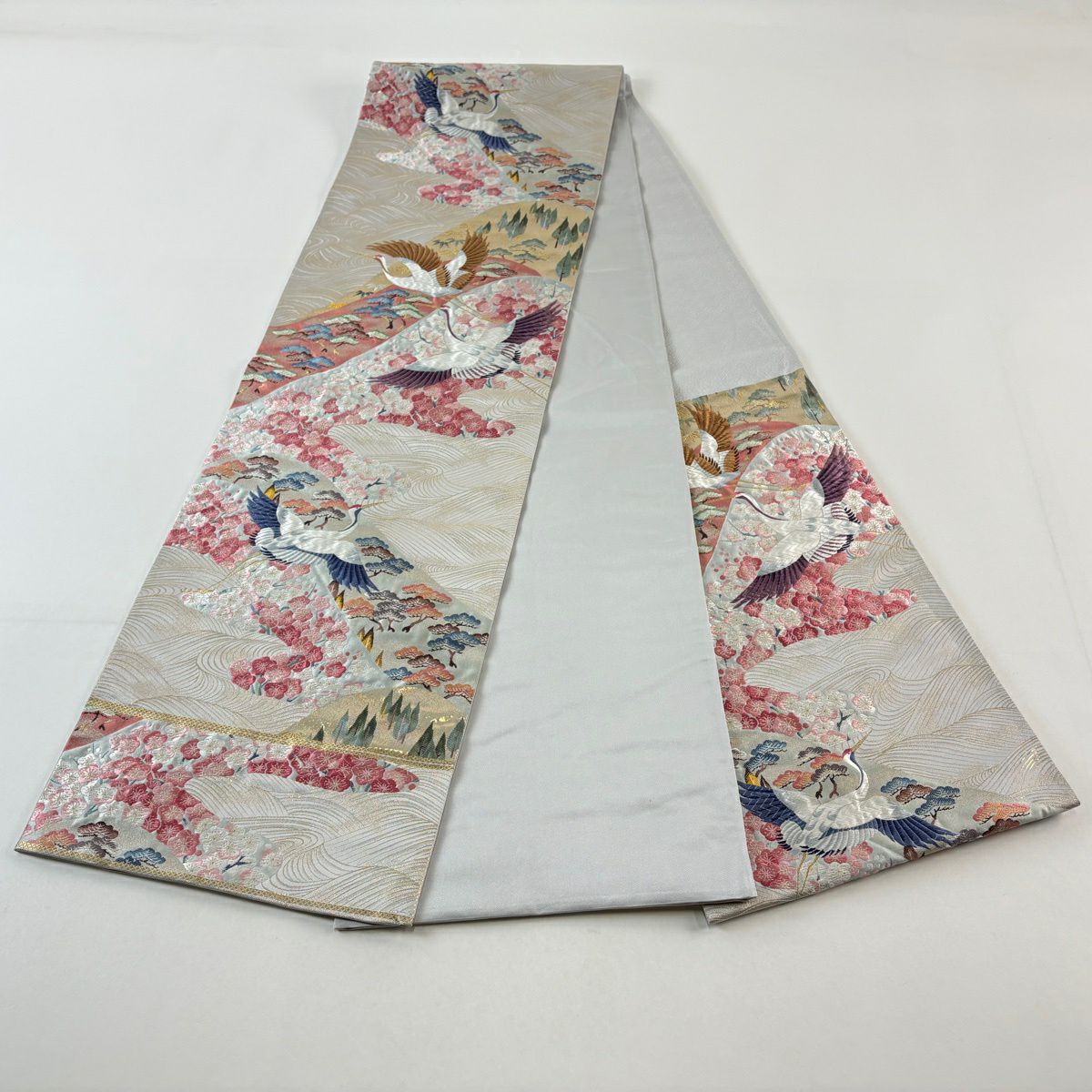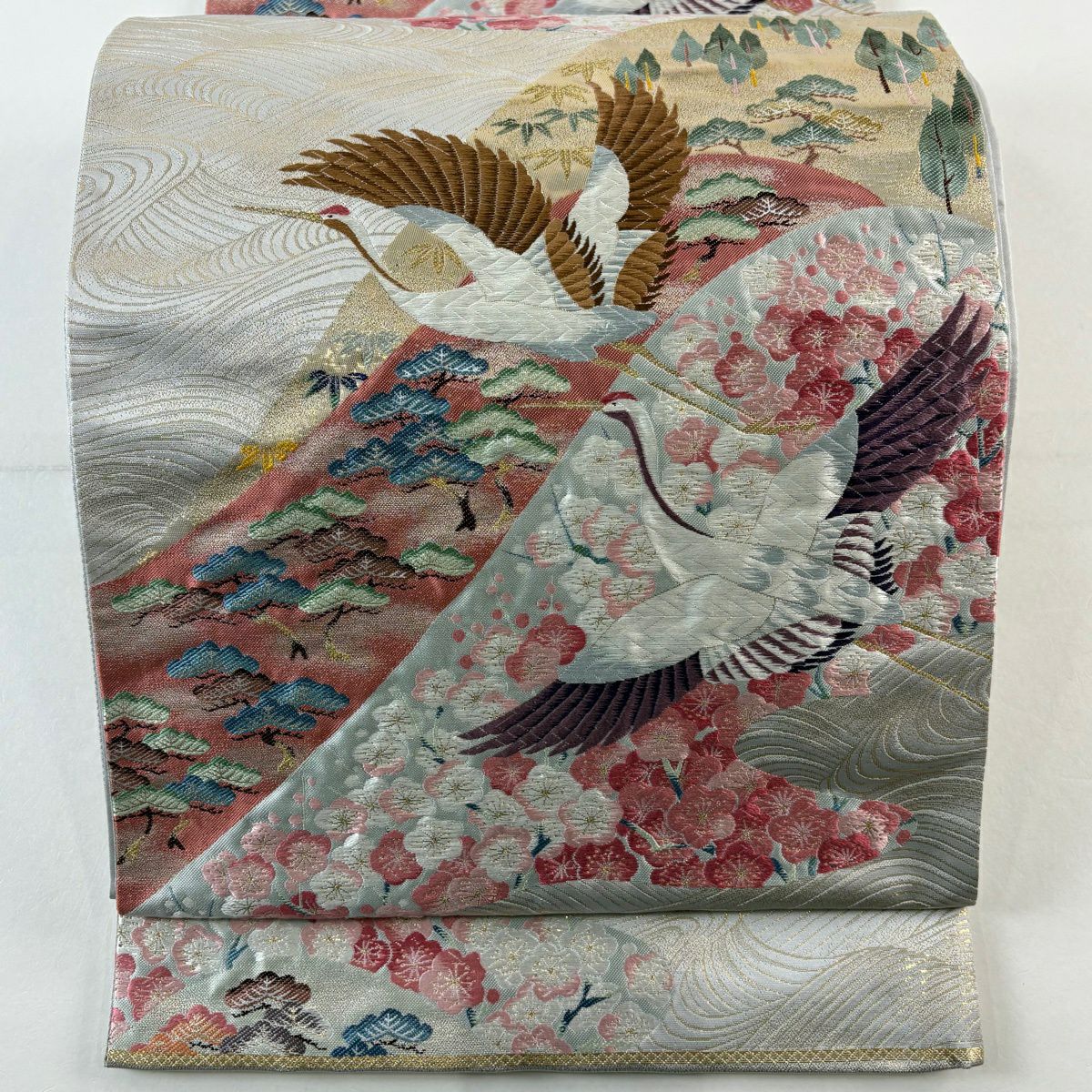 【美品】 袋帯 逸品 富士山 桜 金銀糸 箔 灰白 六通 正絹