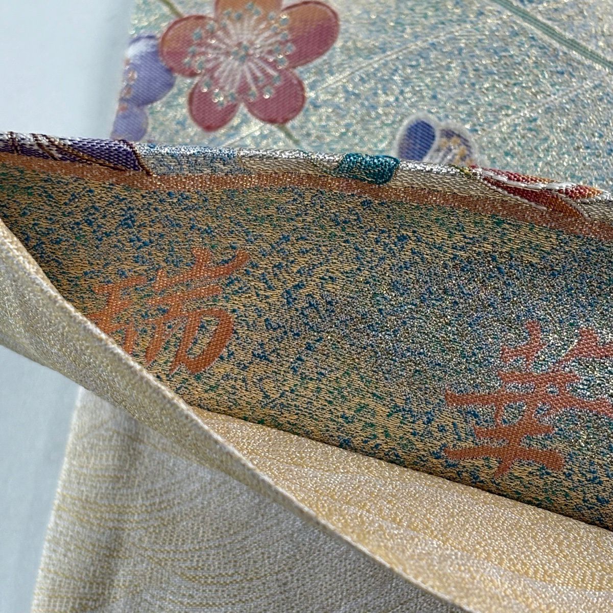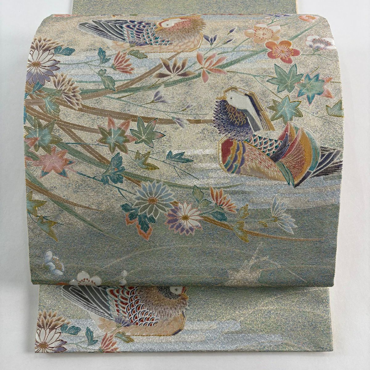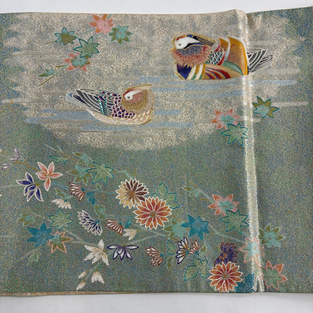 【美品】 袋帯 逸品 鴛鴦 梅 金糸 箔 薄緑 お太鼓柄 正絹