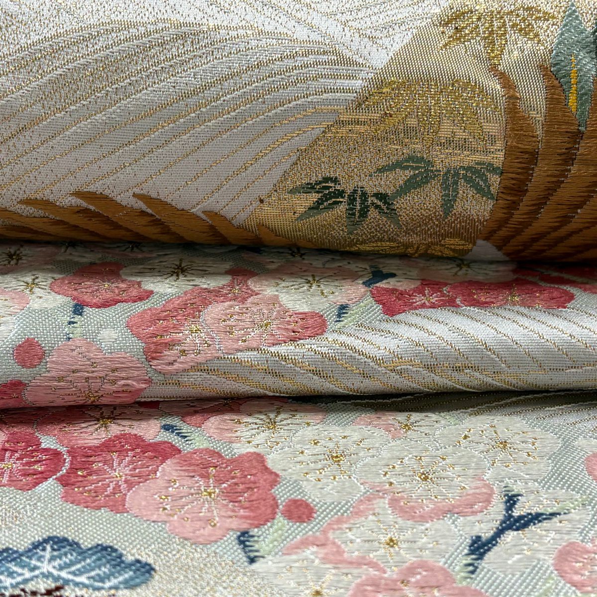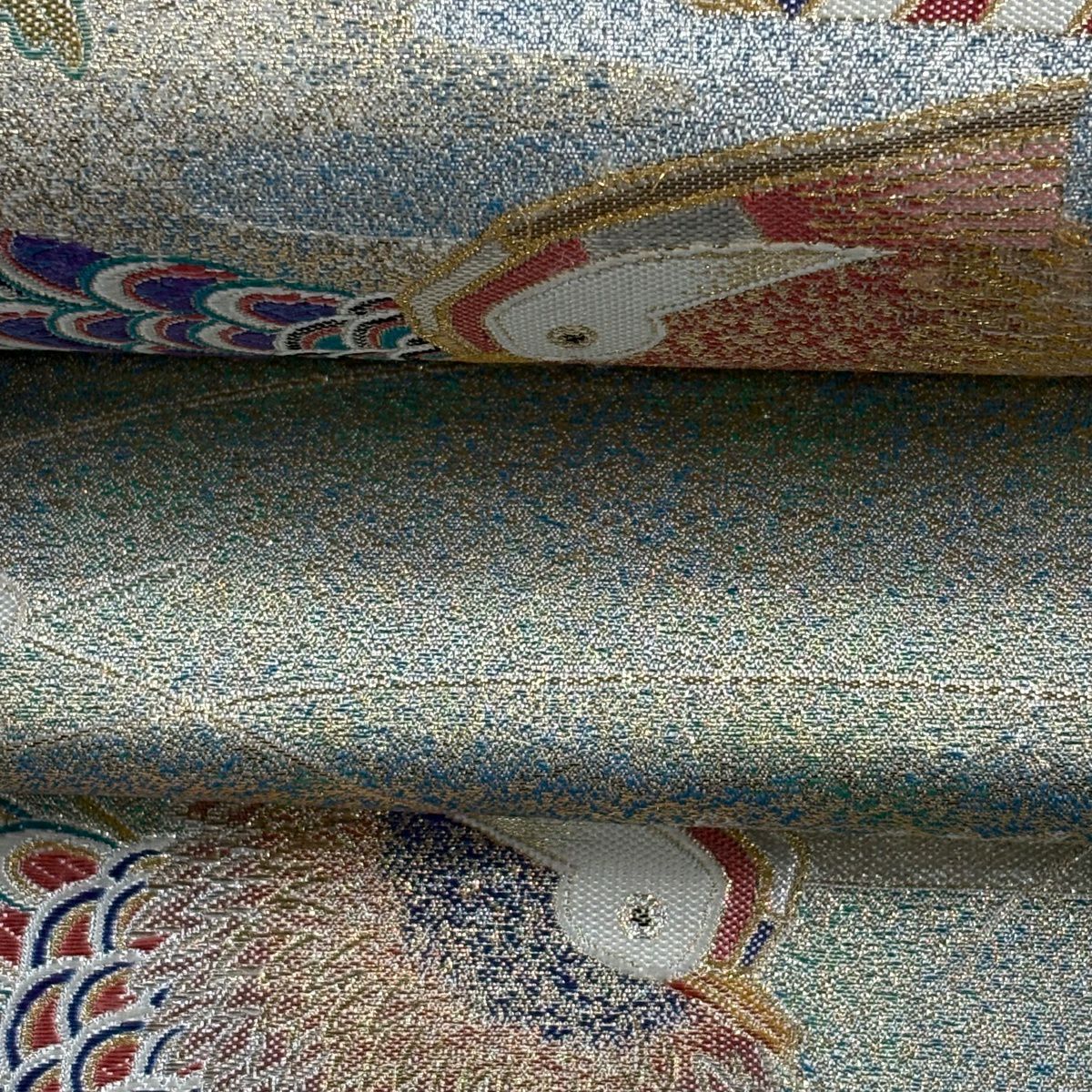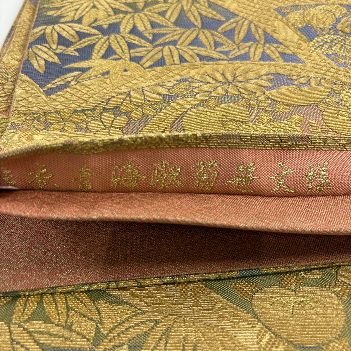 【美品】 袋帯 逸品 鴛鴦 梅 金糸 箔 薄緑 お太鼓柄 正絹