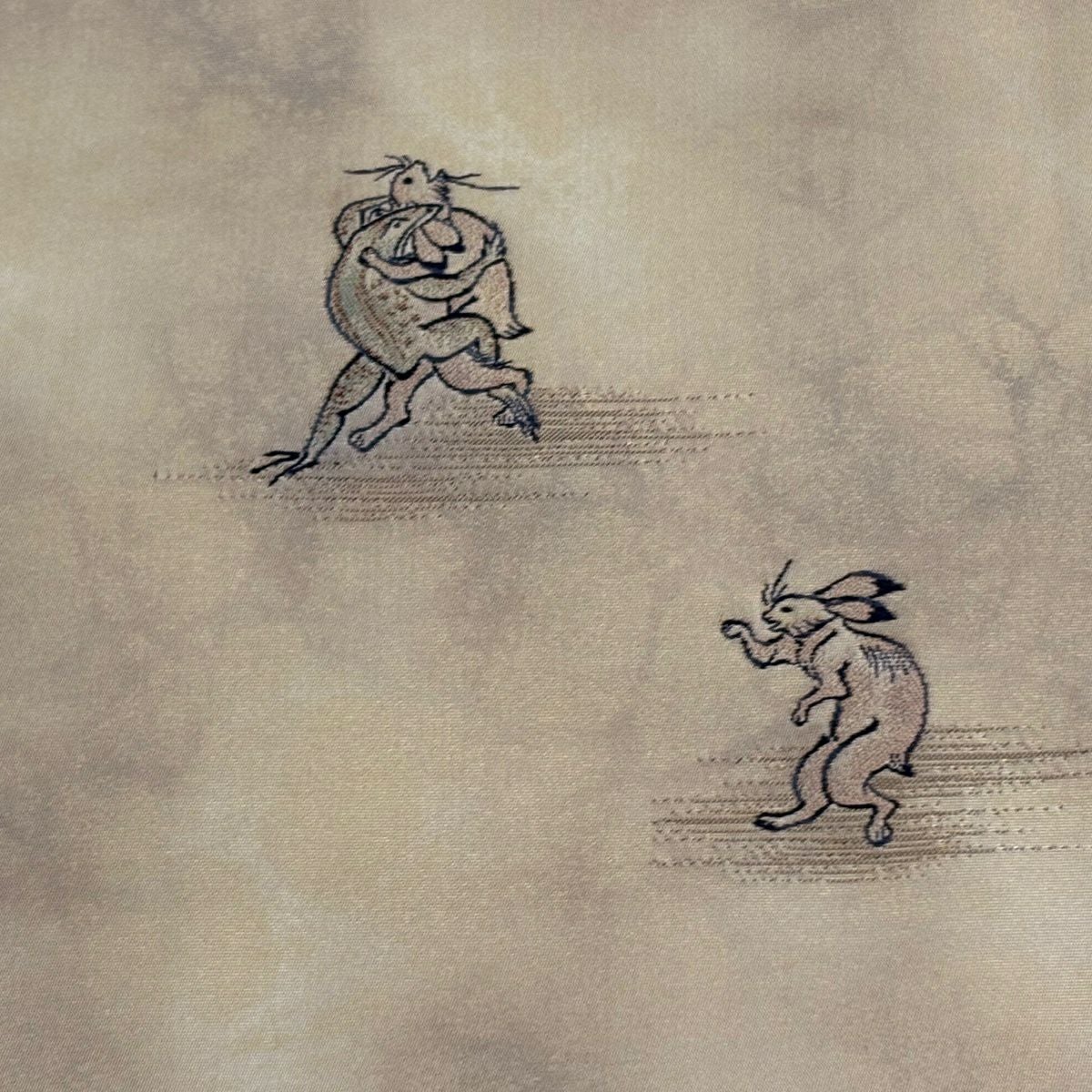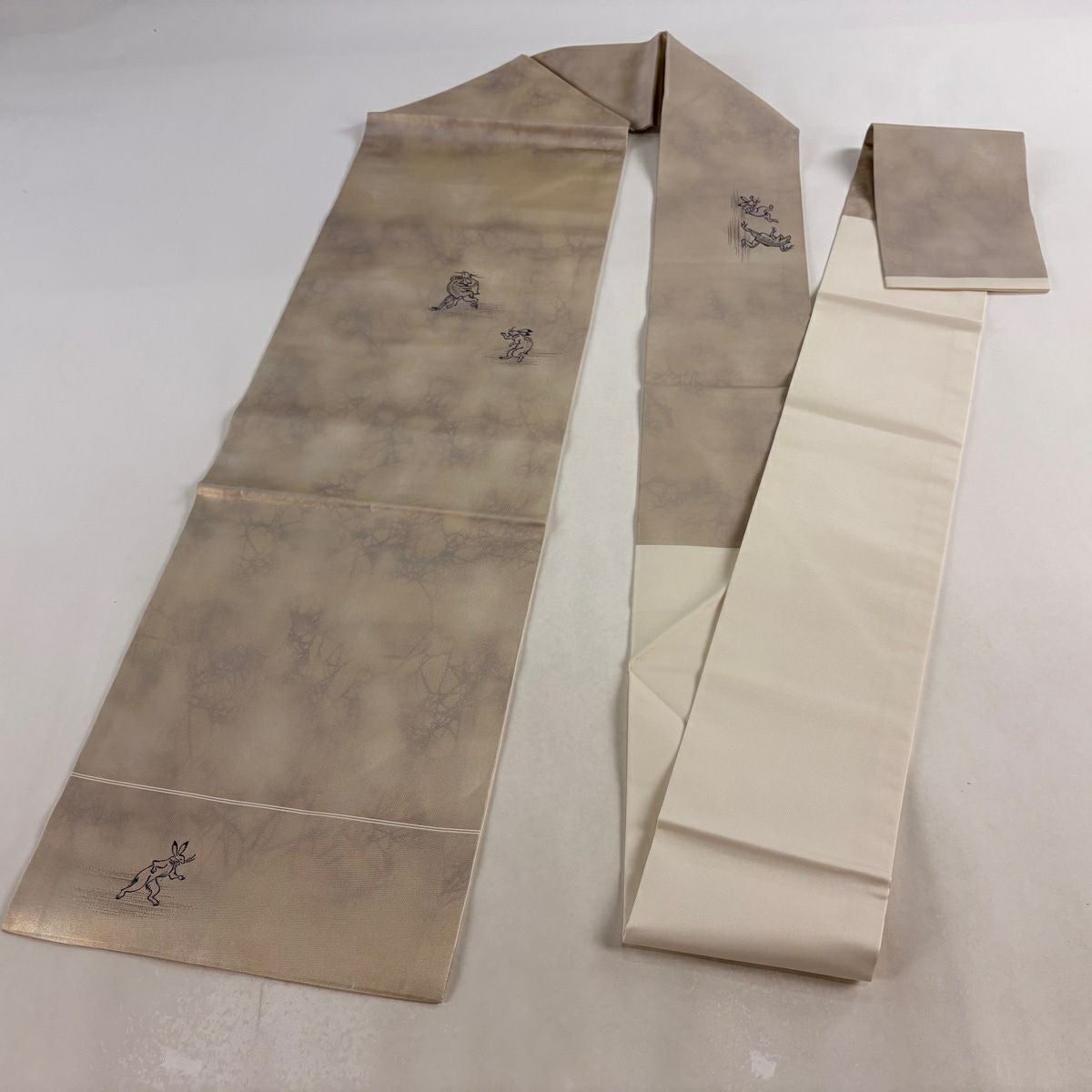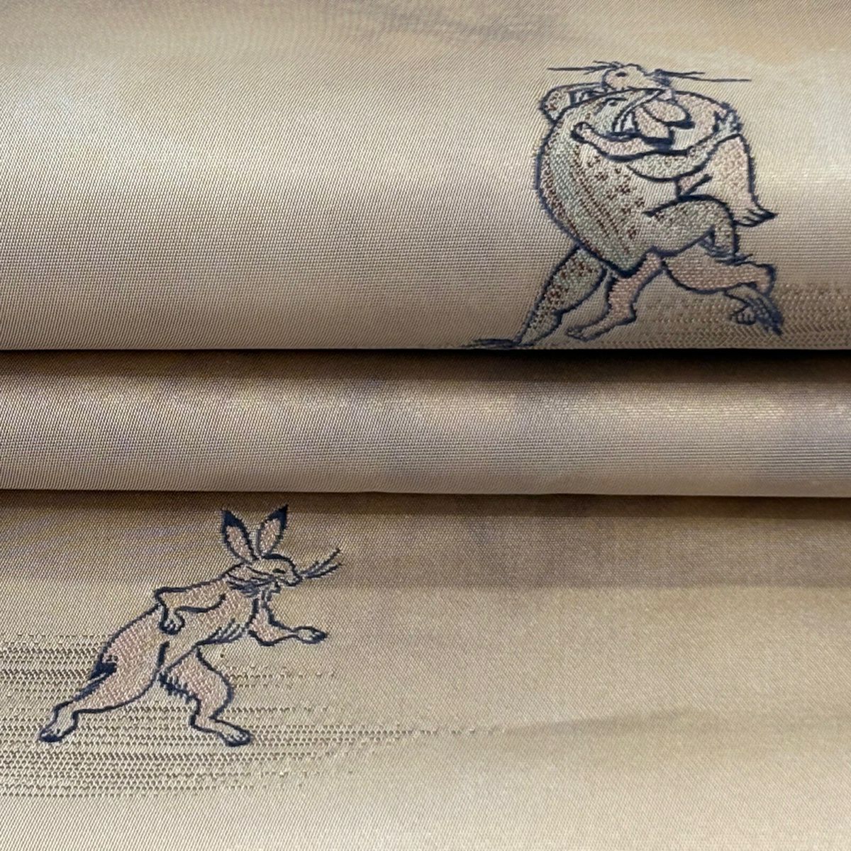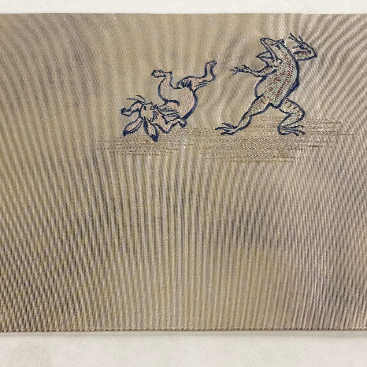 【美品】 名古屋帯 逸品 落款あり 鳥獣戯画 箔 薄茶色 正絹