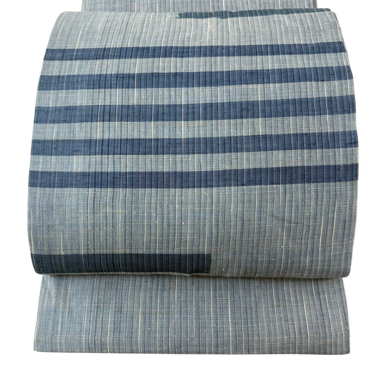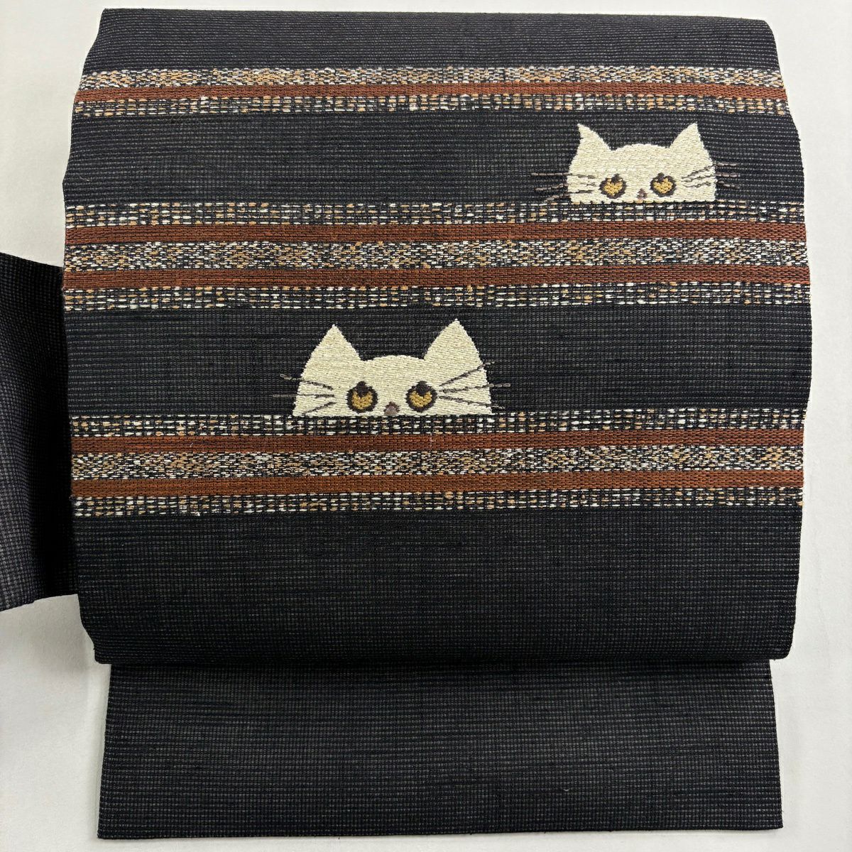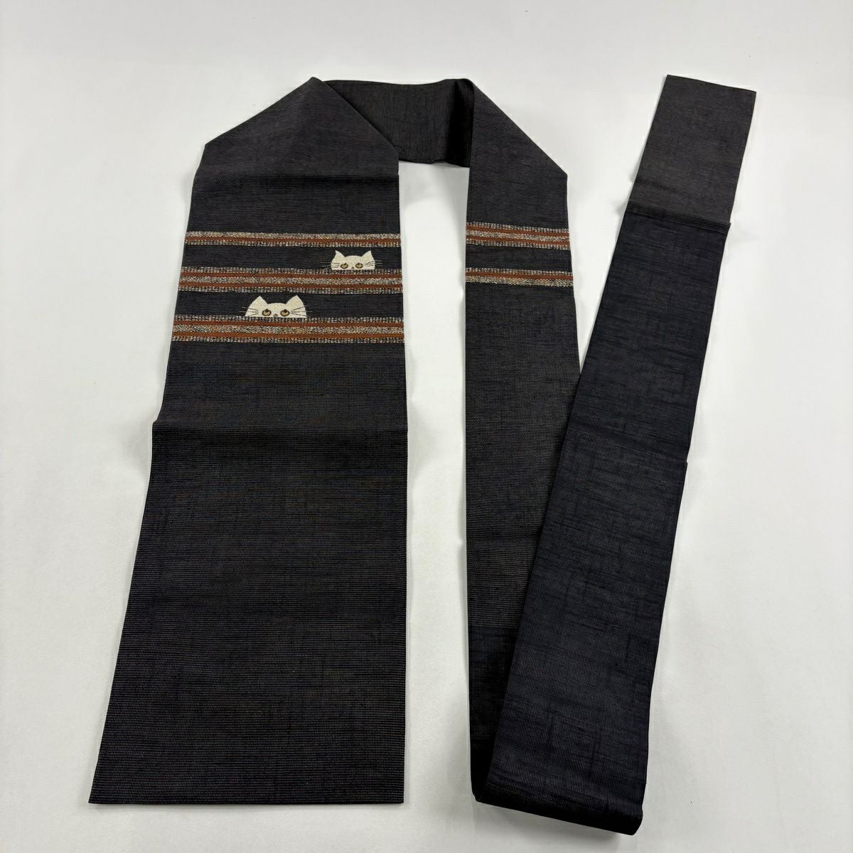 【美品】 名古屋帯 逸品 夏帯 猫 縞 刺繍 金彩 黒灰 正絹