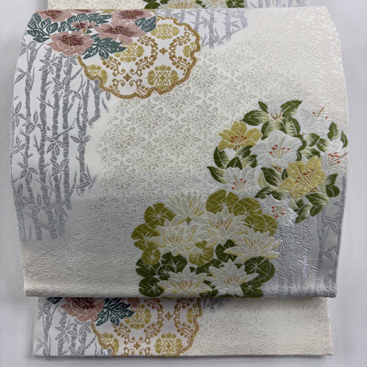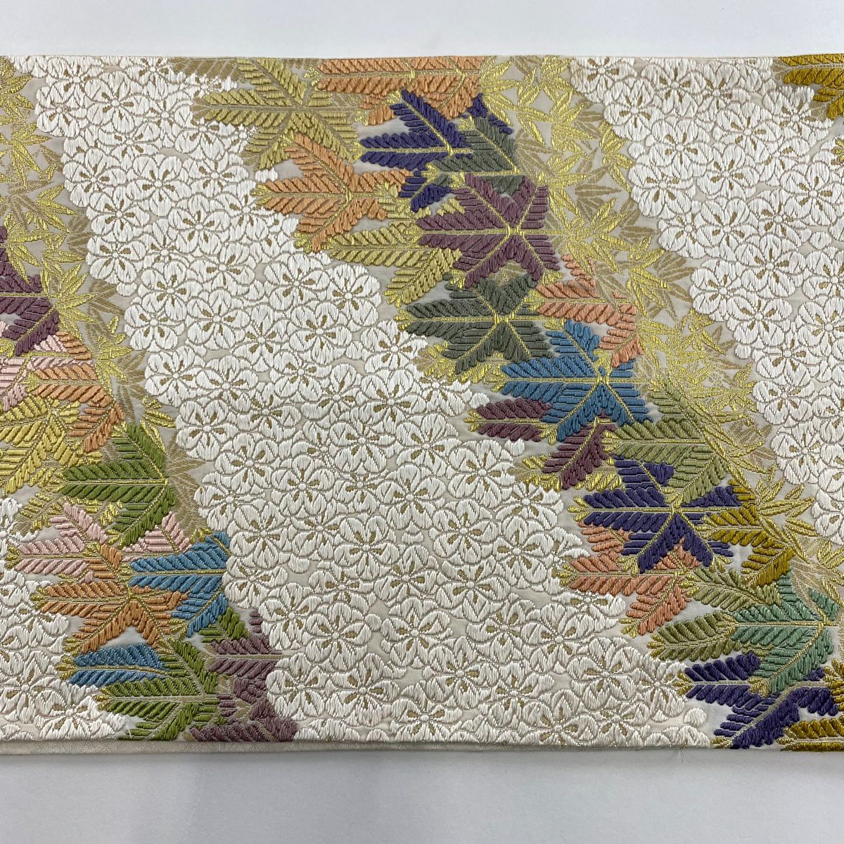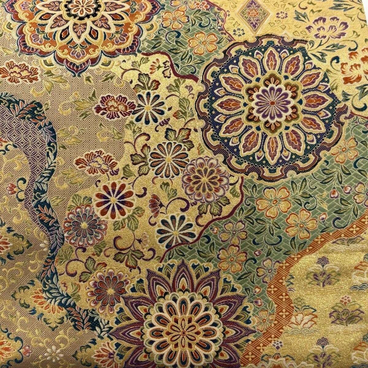 【美品】 袋帯 逸品 枝花 雪輪 唐織 金糸 クリーム 六通 正絹