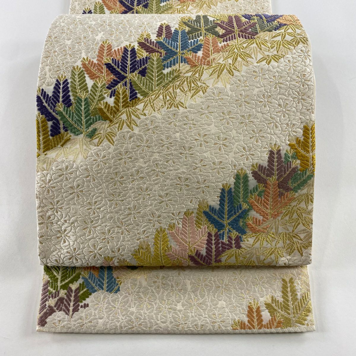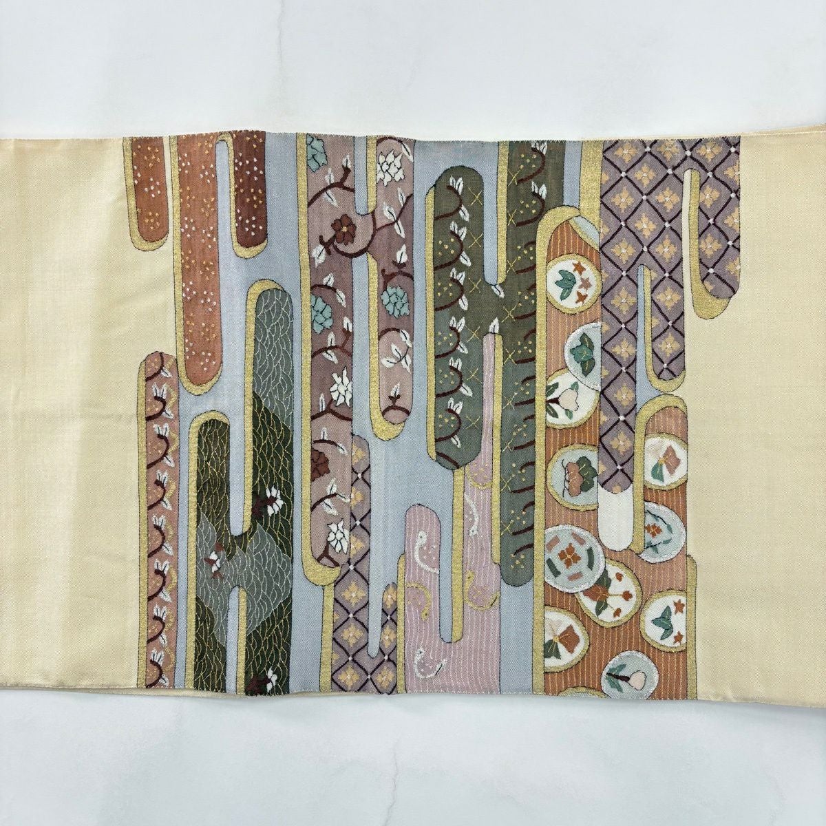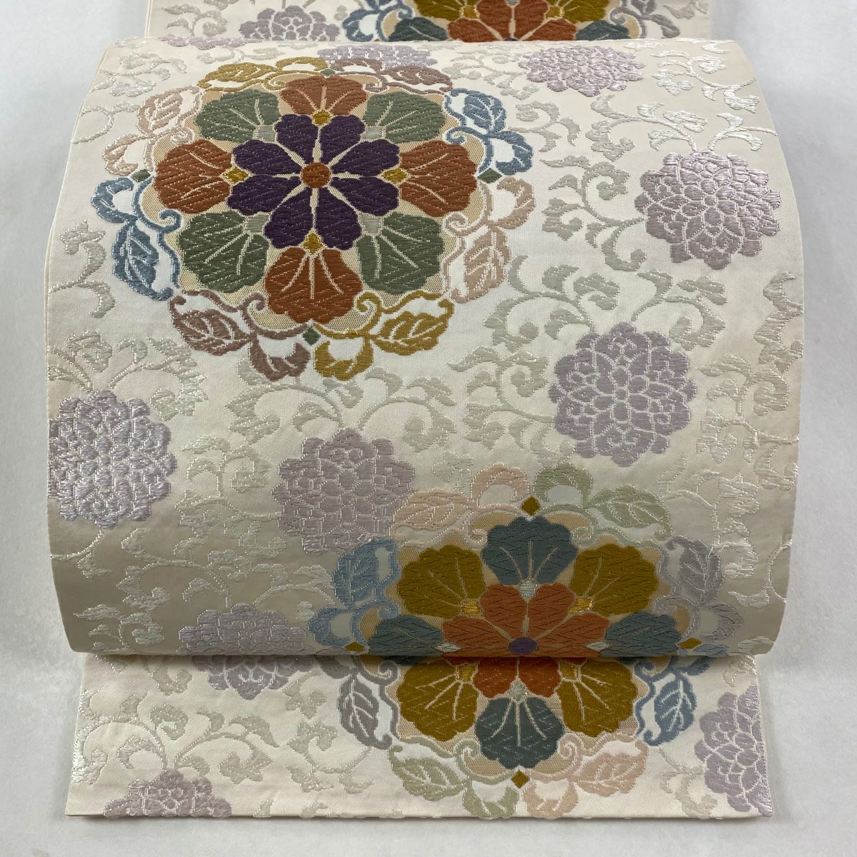 【美品】 袋帯 逸品 枝花 雪輪 唐織 金糸 クリーム 六通 正絹