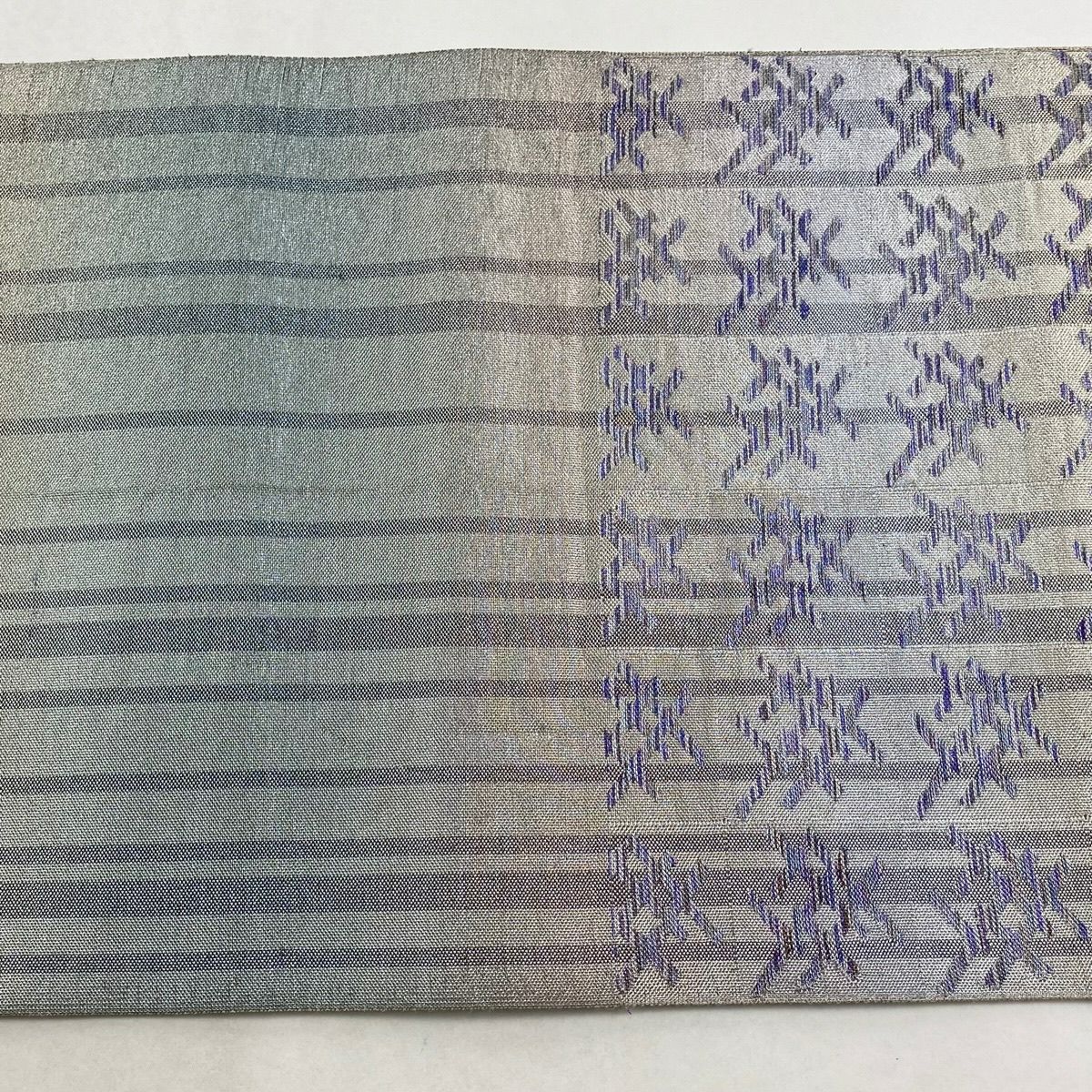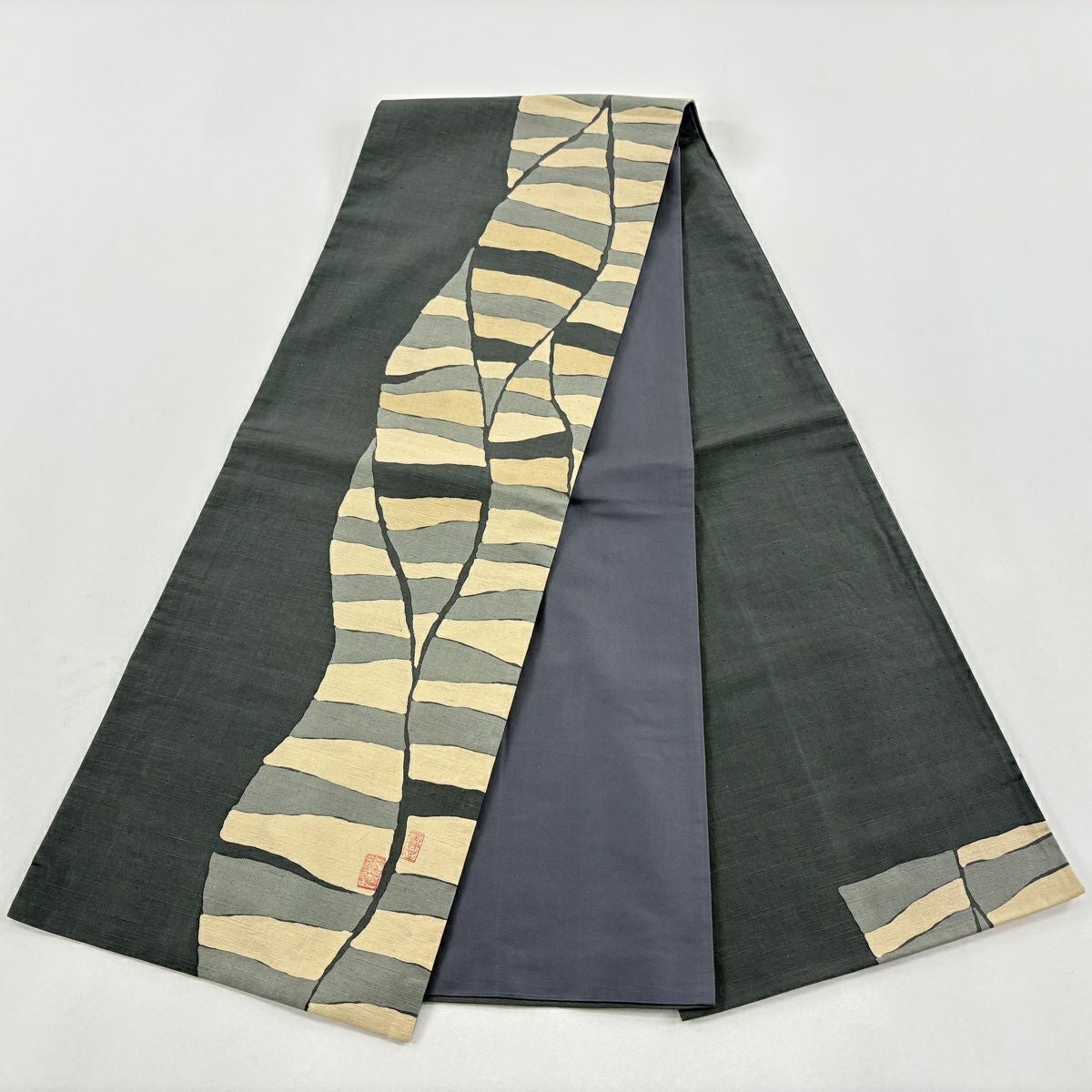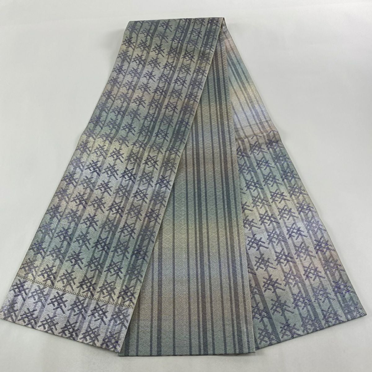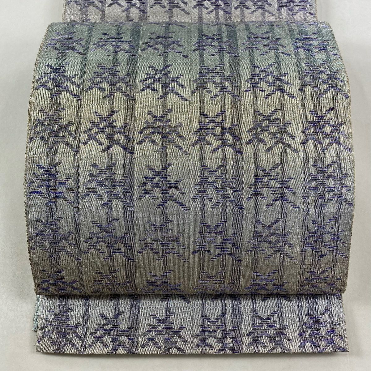 袋名古屋帯 逸品 洛楽人 落款あり 紬地 縞 幾何学 青灰色 正絹