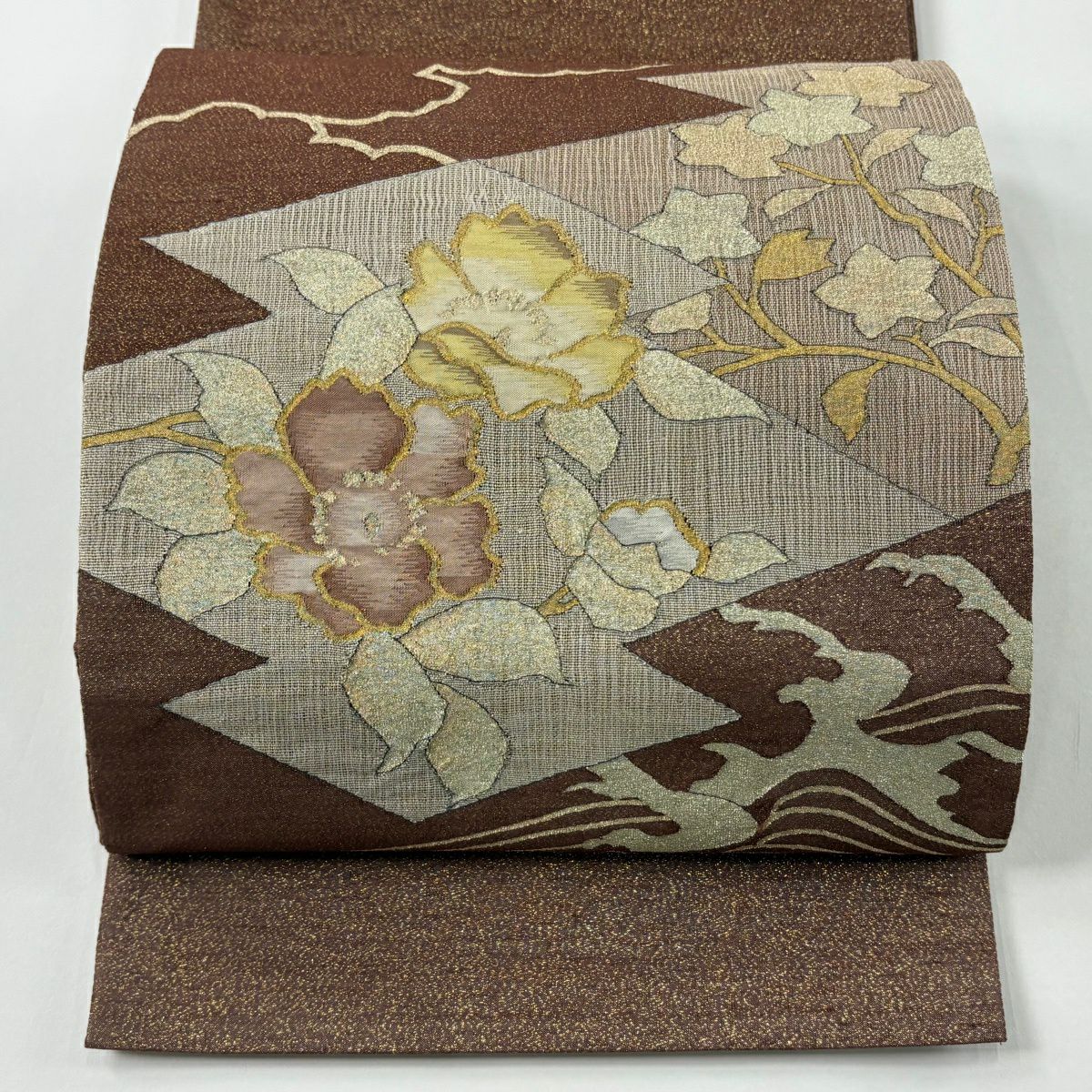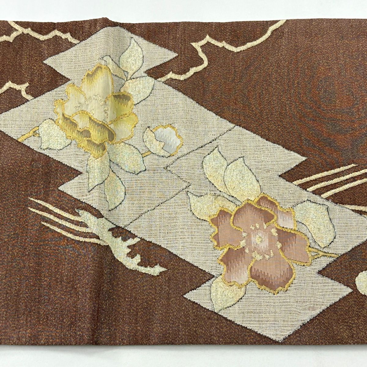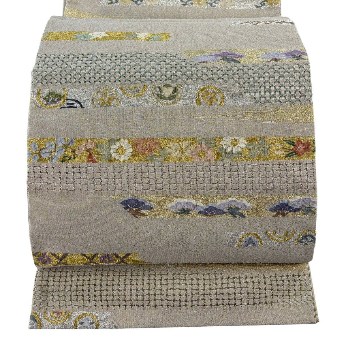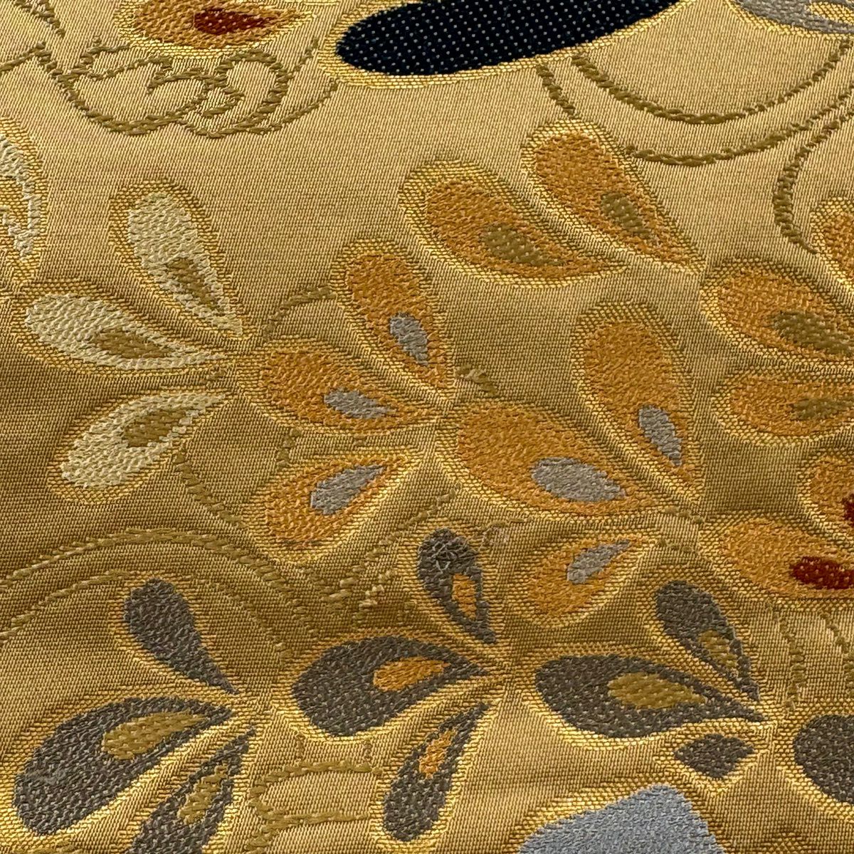 袋帯 逸品 龍村美術織物 落款あり 花 金銀糸 薄茶色 全通 正絹
