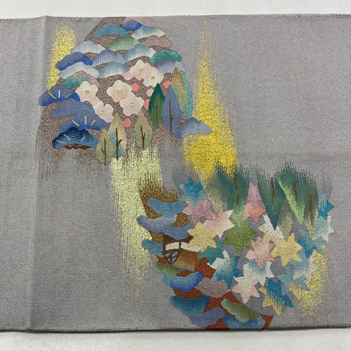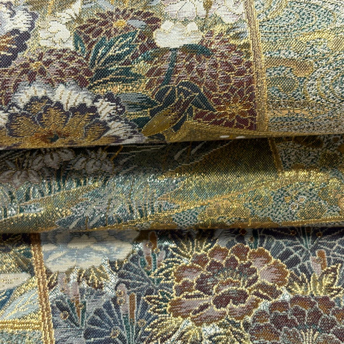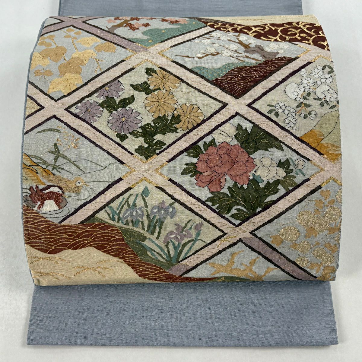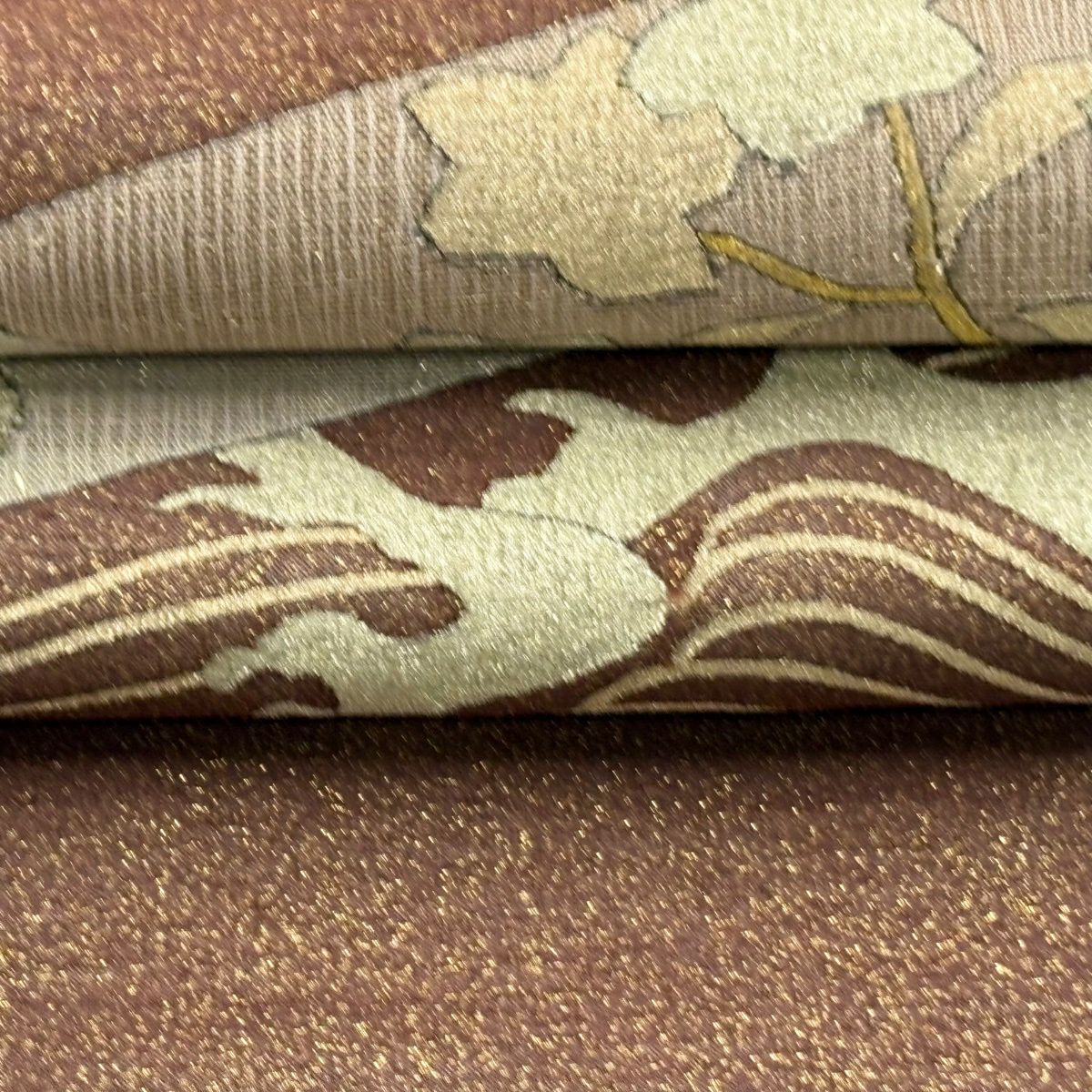 袋帯 逸品 龍村美術織物 落款あり 花 金銀糸 薄茶色 全通 正絹