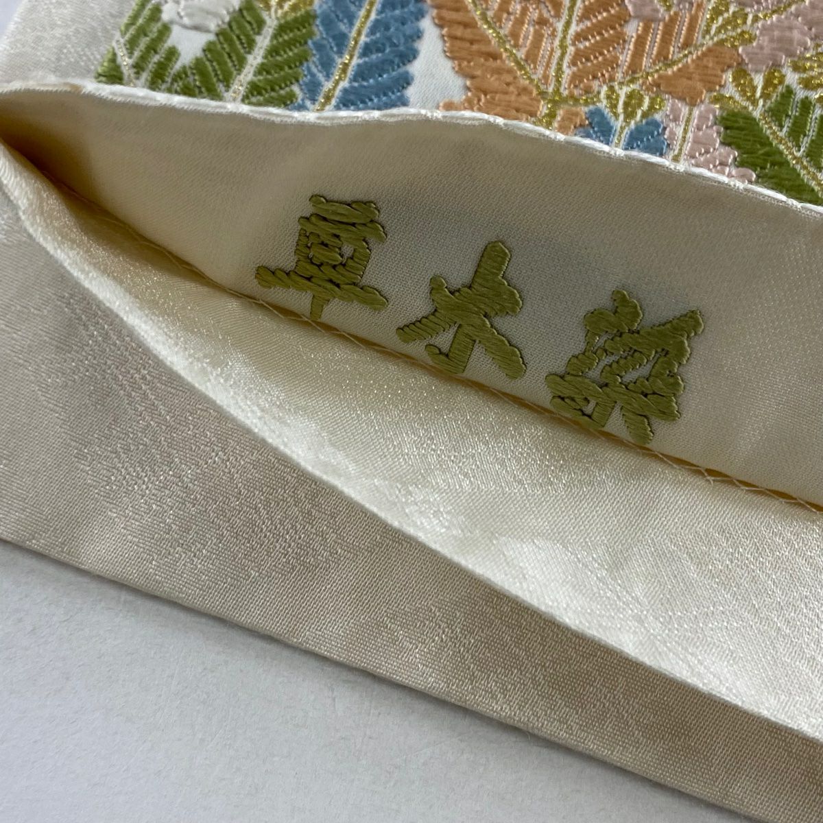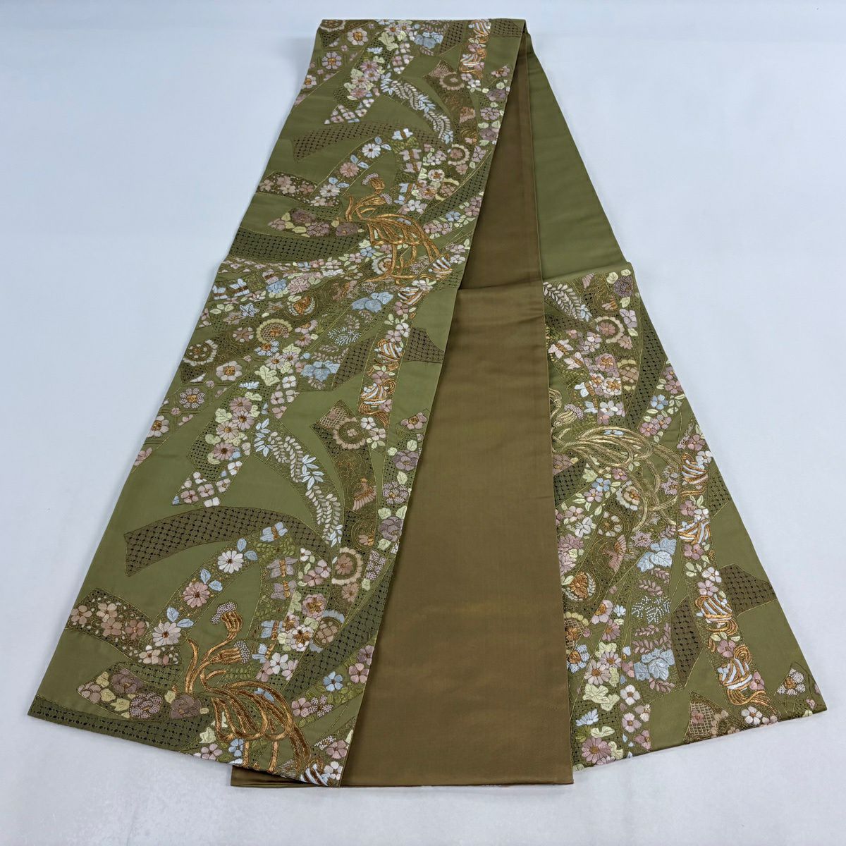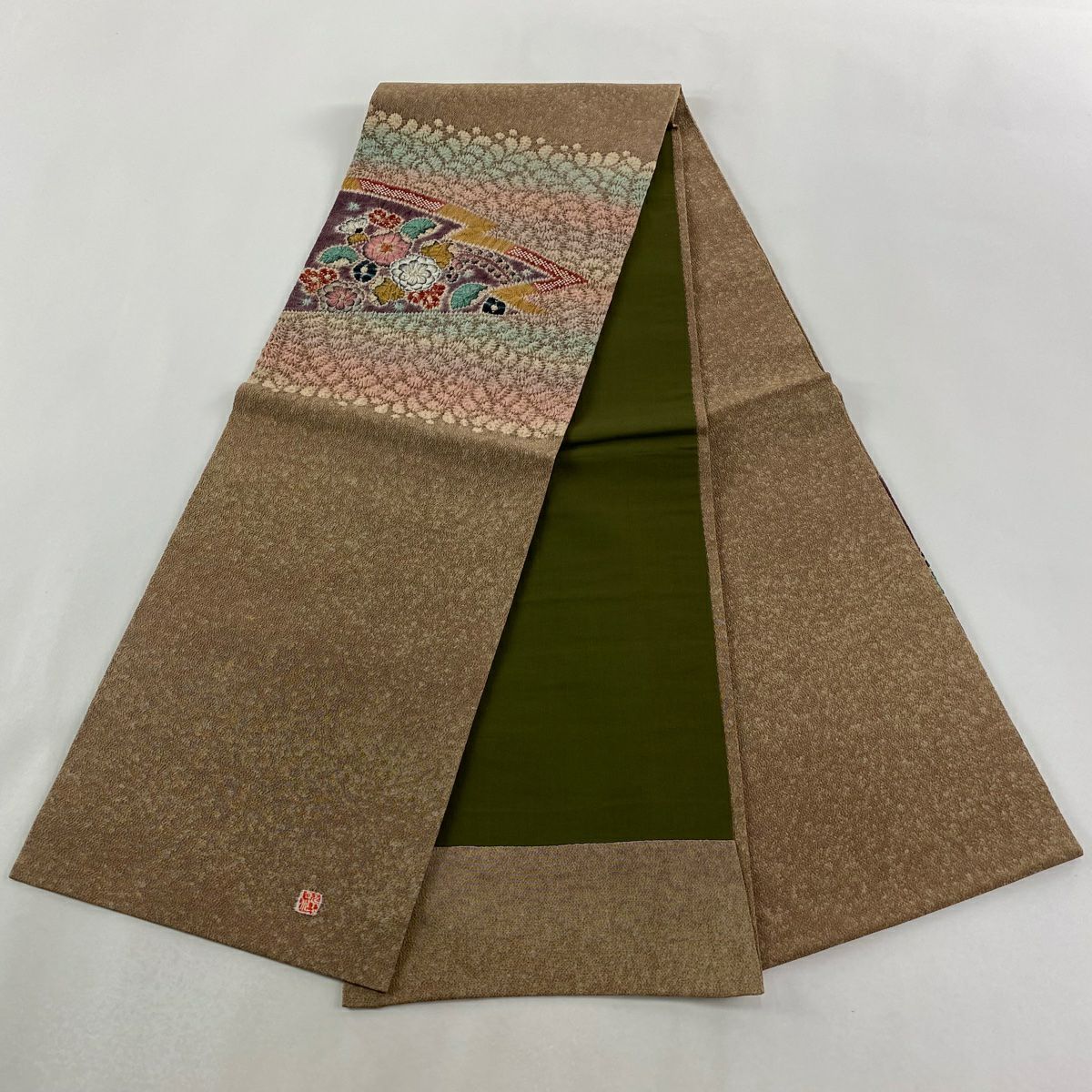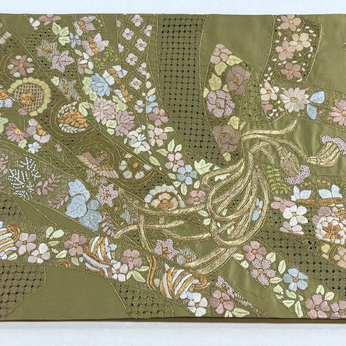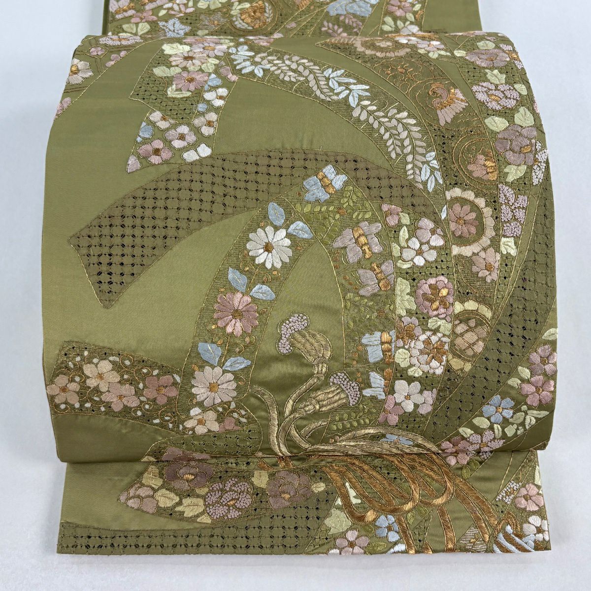 【美品】 袋帯 逸品 束ね熨斗 草花 刺繍 金糸 鶯色 六通 正絹