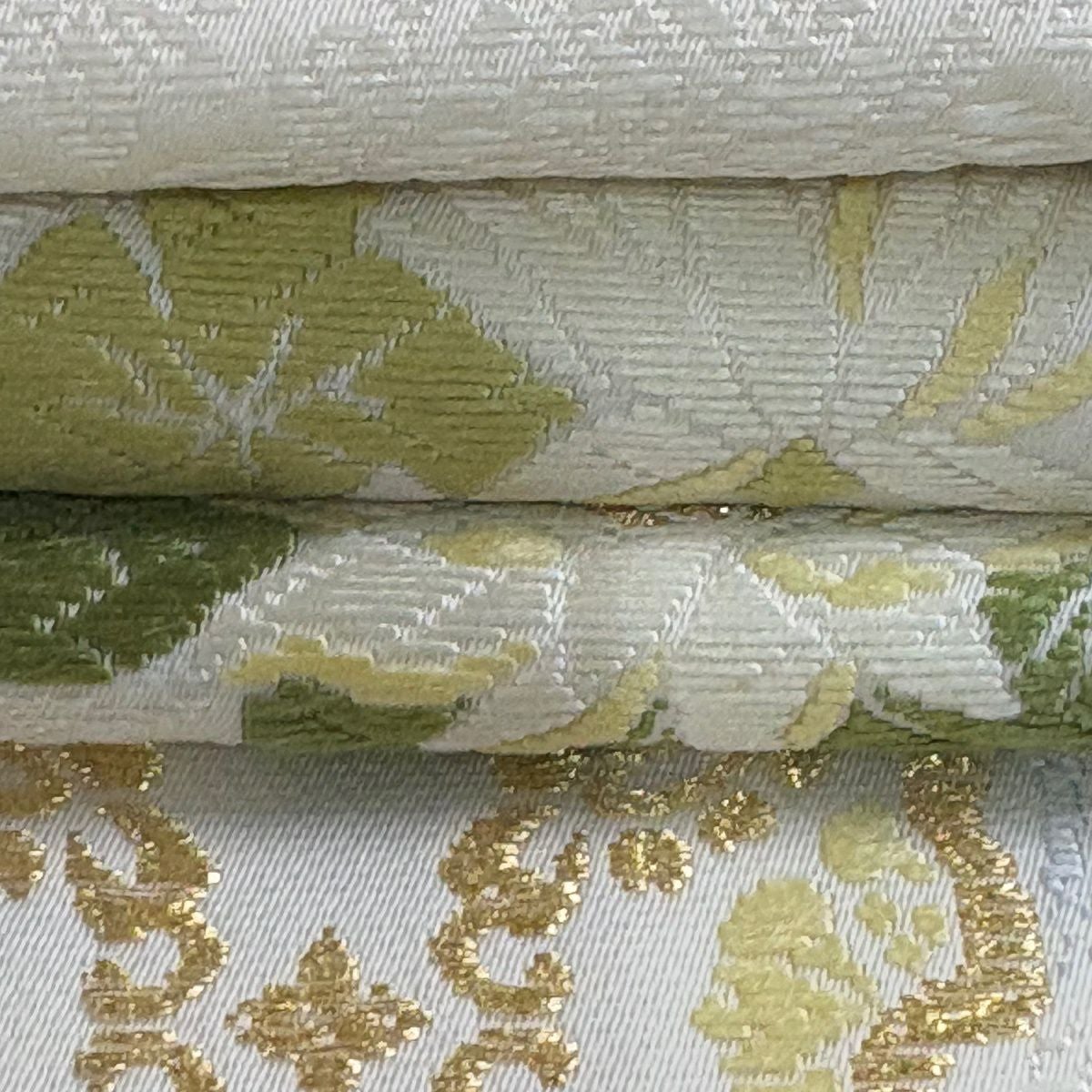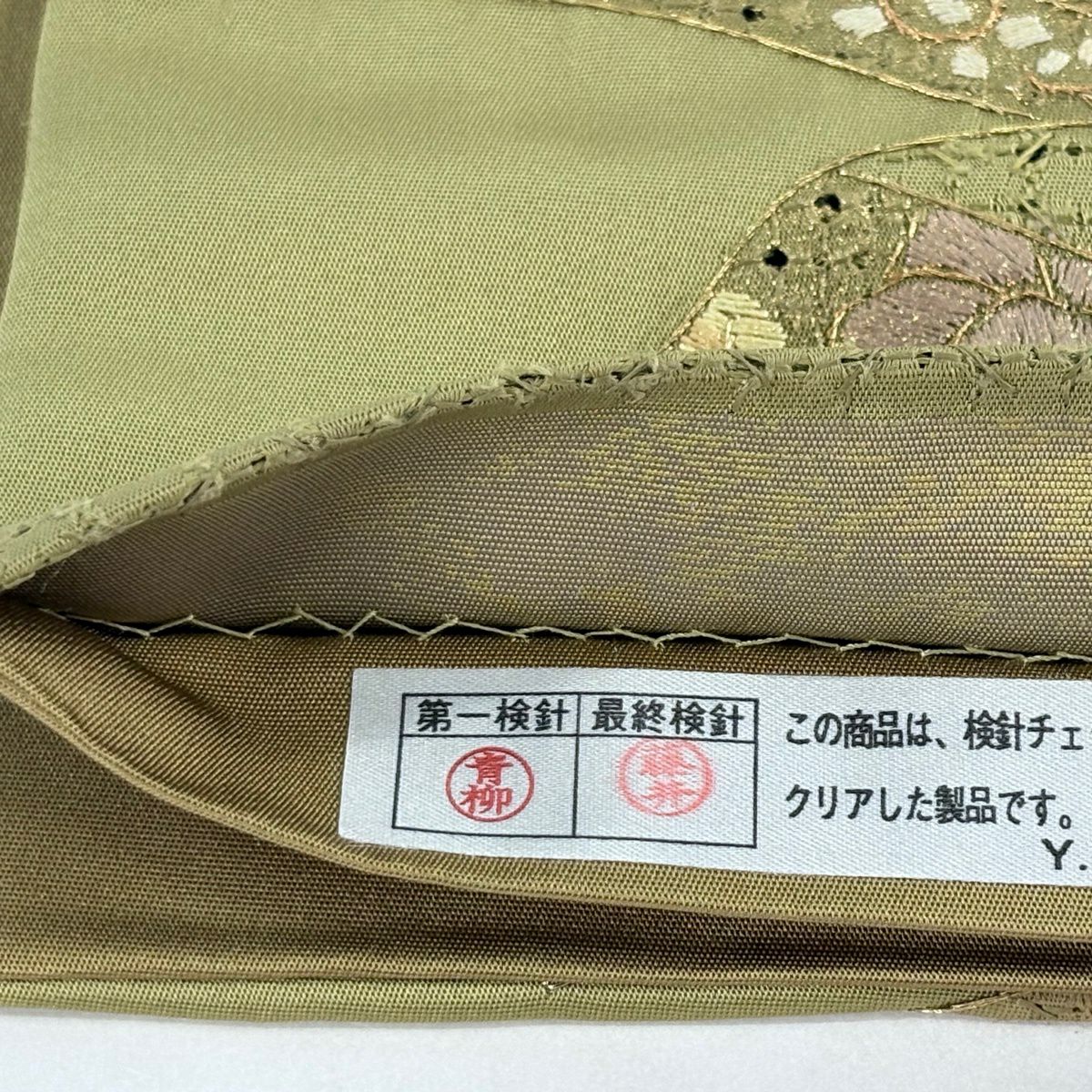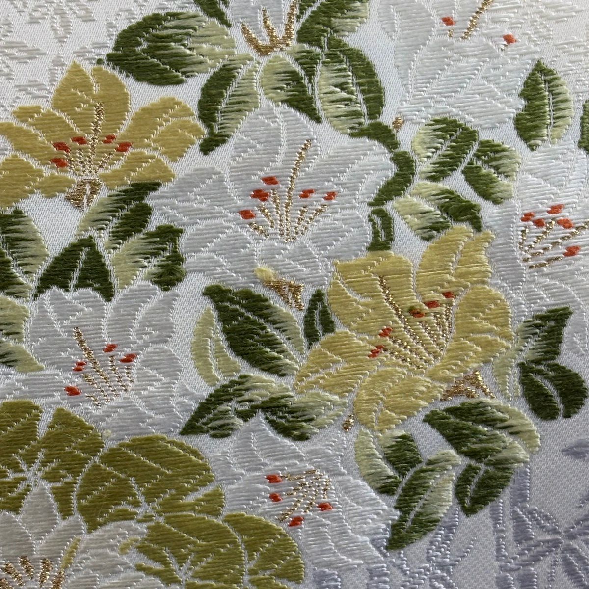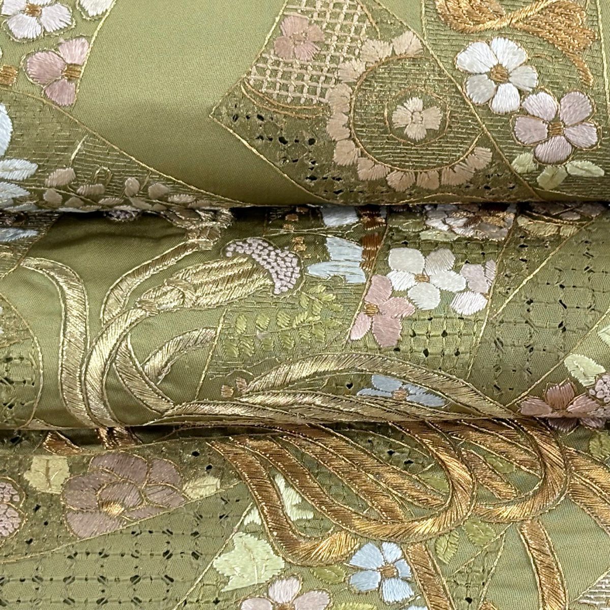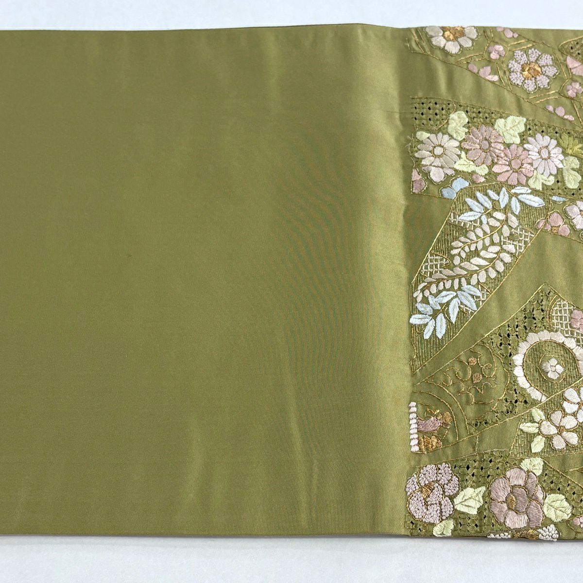 【美品】 袋帯 逸品 束ね熨斗 草花 刺繍 金糸 鶯色 六通 正絹