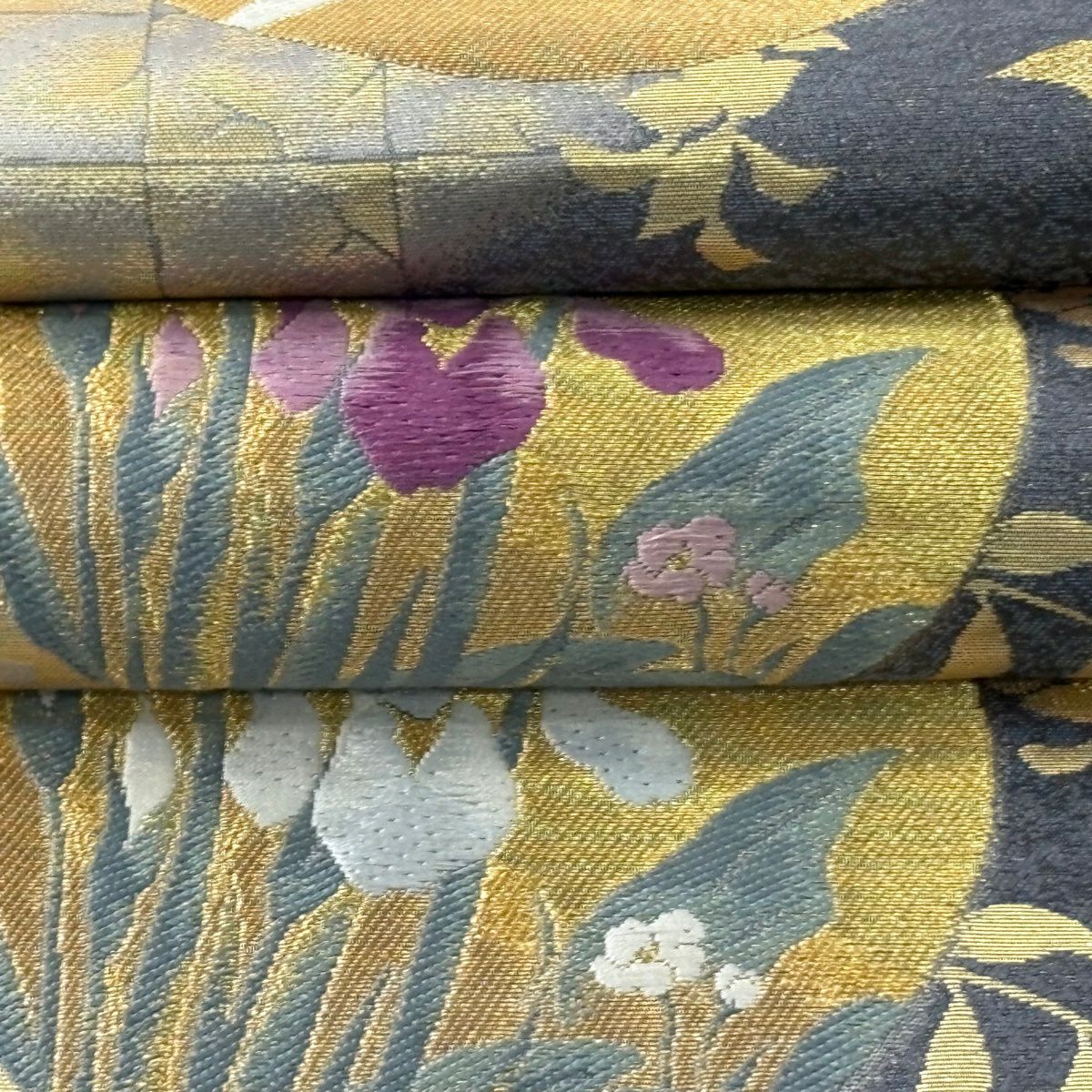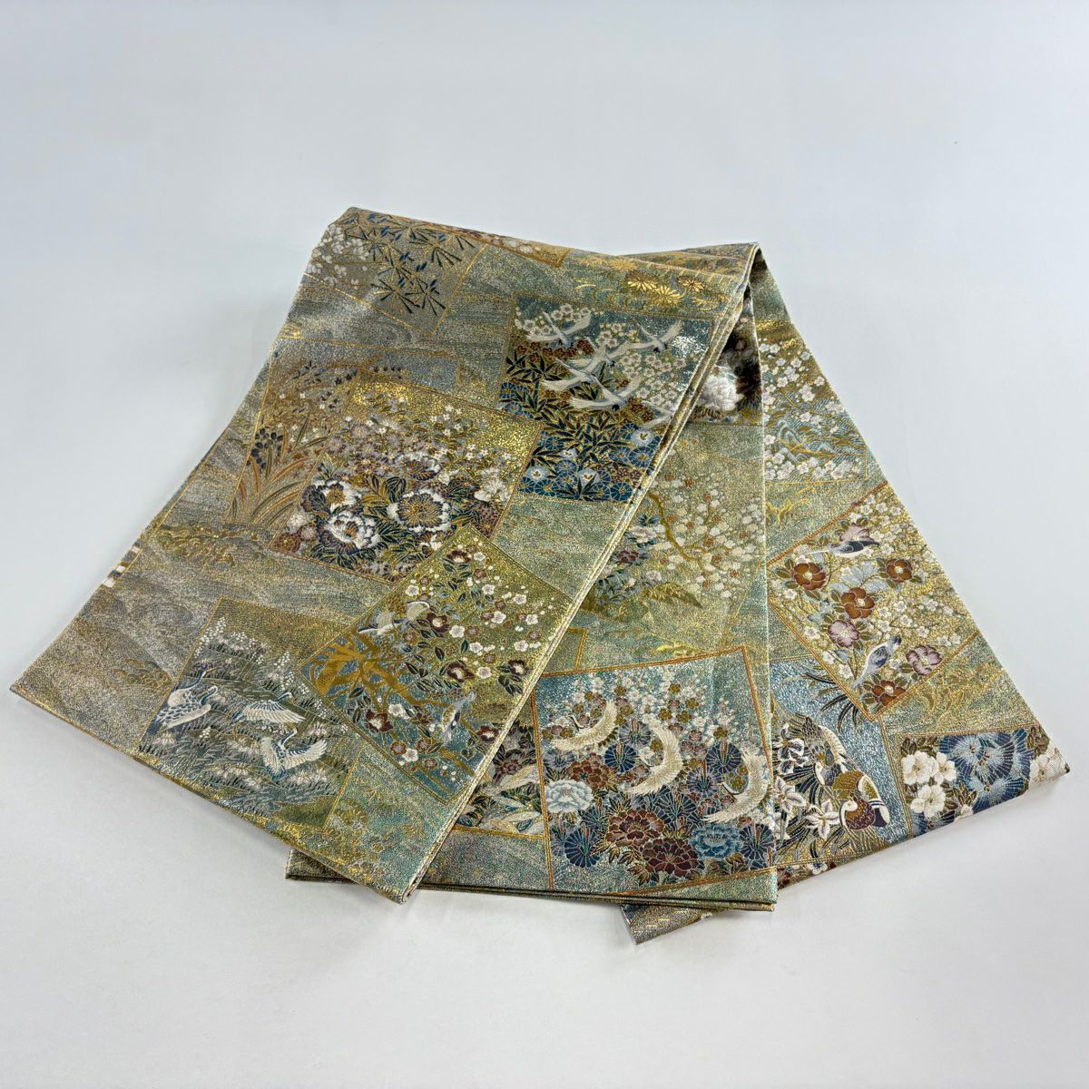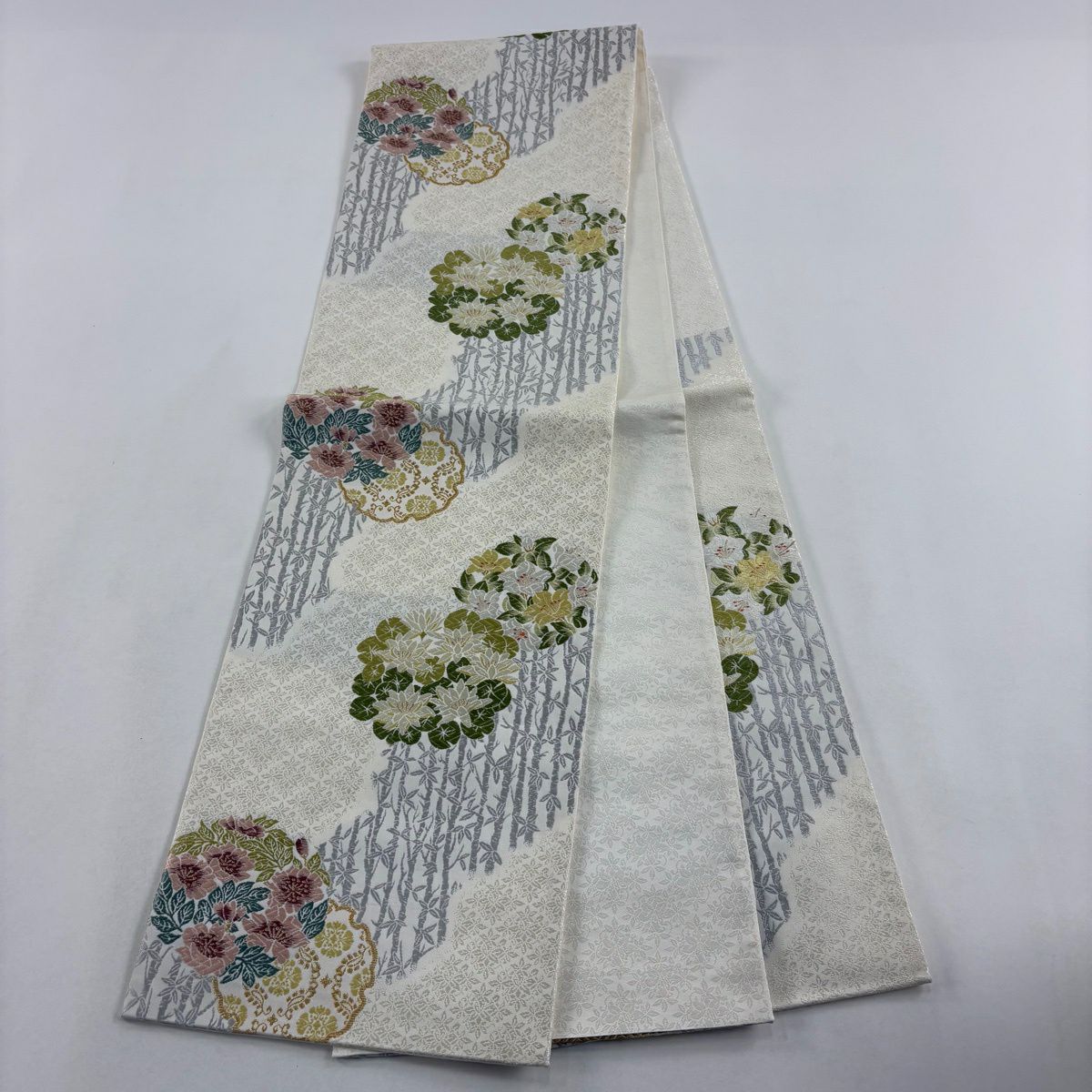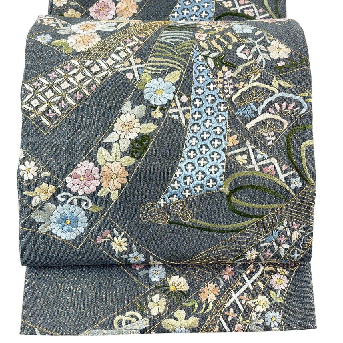 【美品】 袋帯 逸品 束ね熨斗 草花 刺繍 金糸 灰緑 六通 正絹