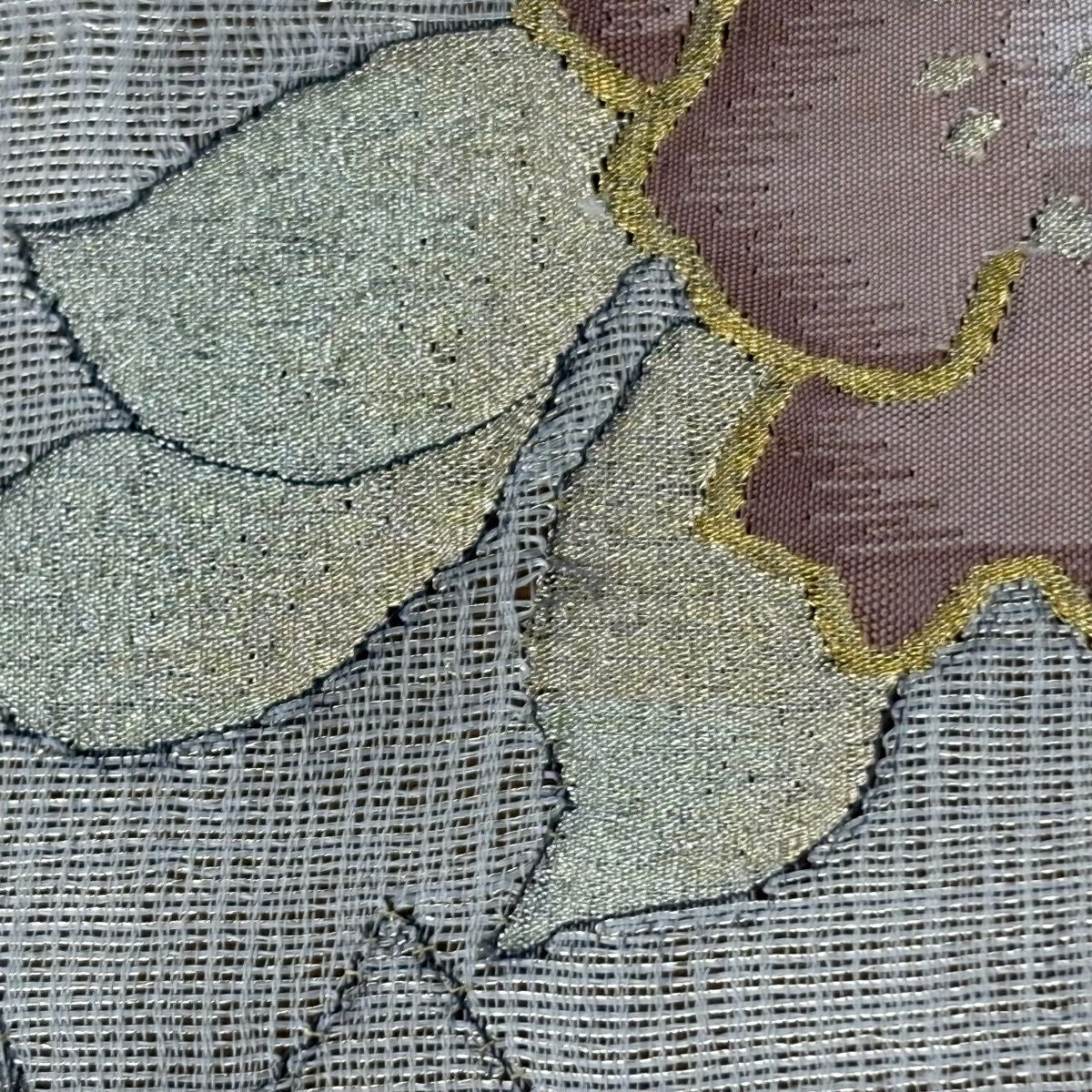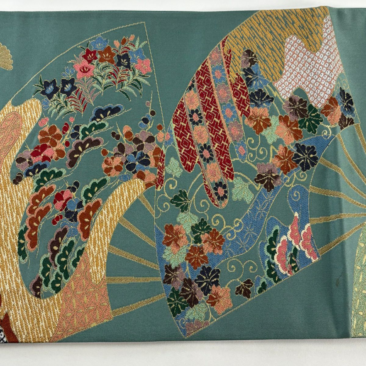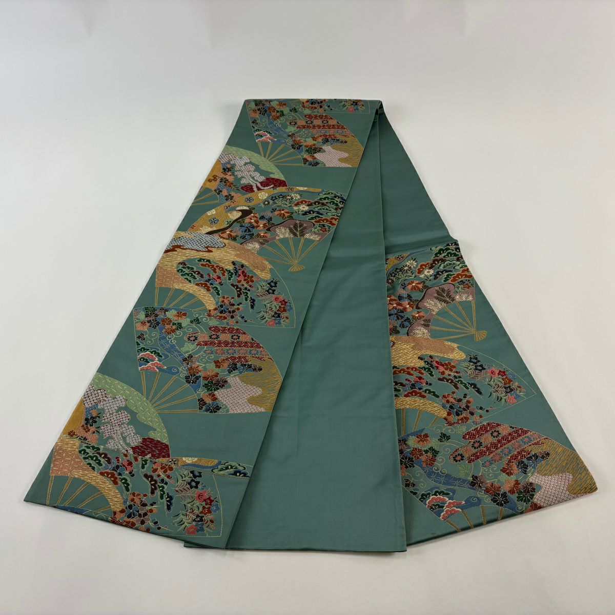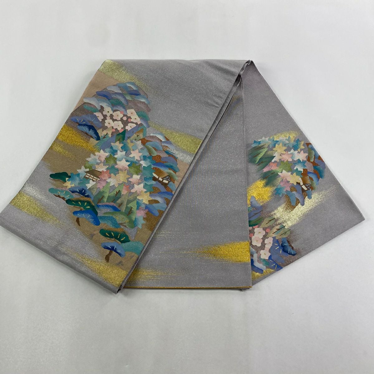 【美品】 袋帯 逸品 束ね熨斗 草花 刺繍 金糸 灰緑 六通 正絹